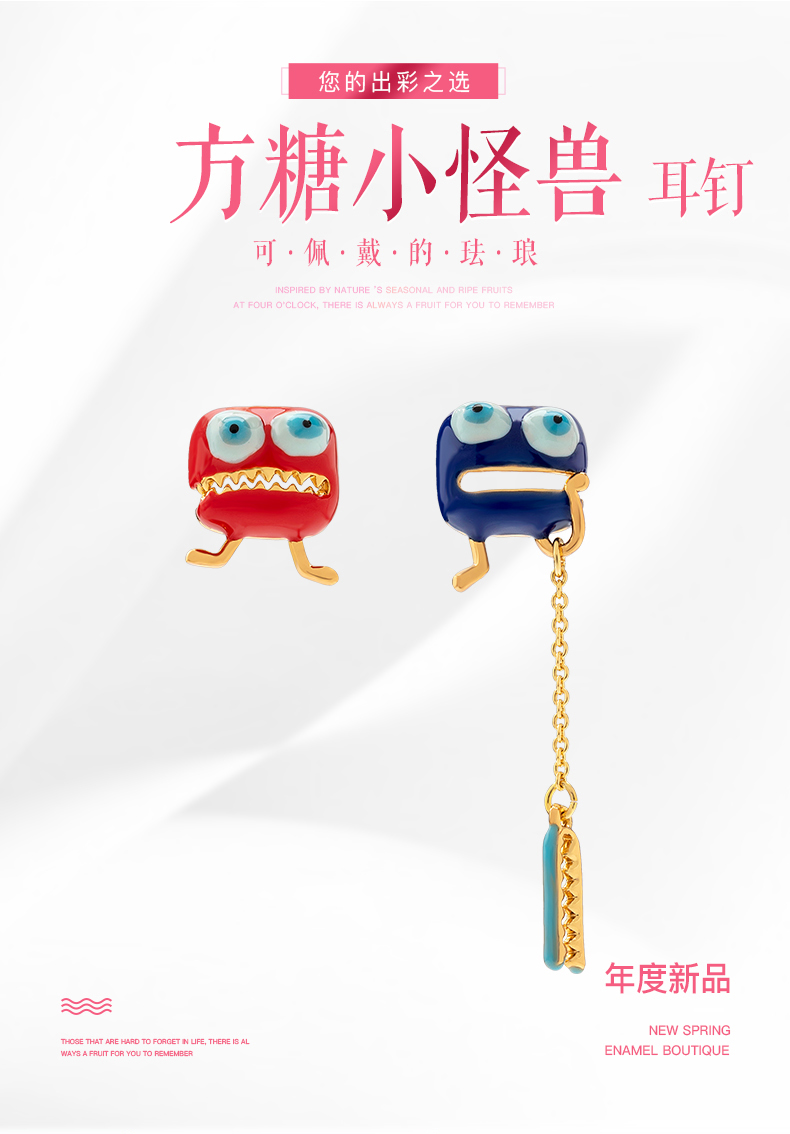 Juicy Grape 耳环2021新款潮珐琅搞怪方糖小怪兽耳钉女不对称个性设计感长耳饰