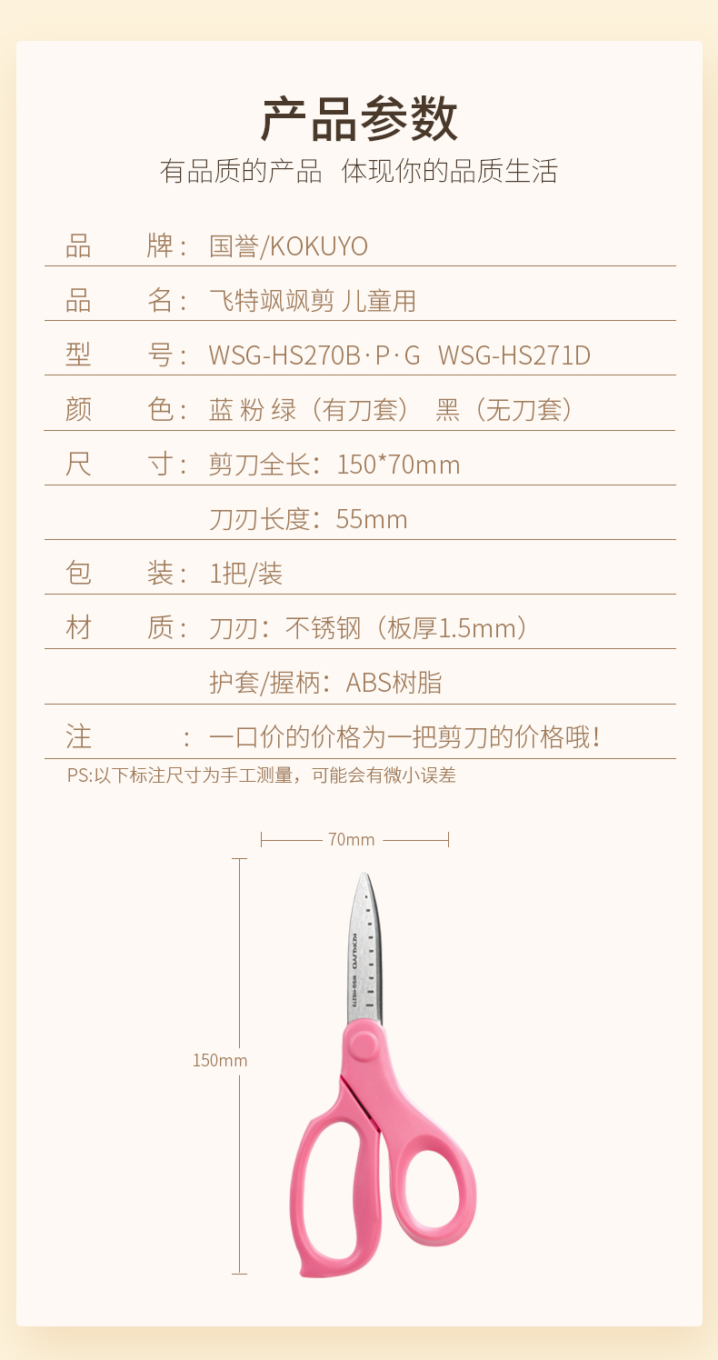 儿童剪刀| 日本kokuyo国誉飞特飒飒儿童剪刀简约彩色标准型学生手工剪纸剪刀附刀套小巧便捷剪子WSG-HS270B