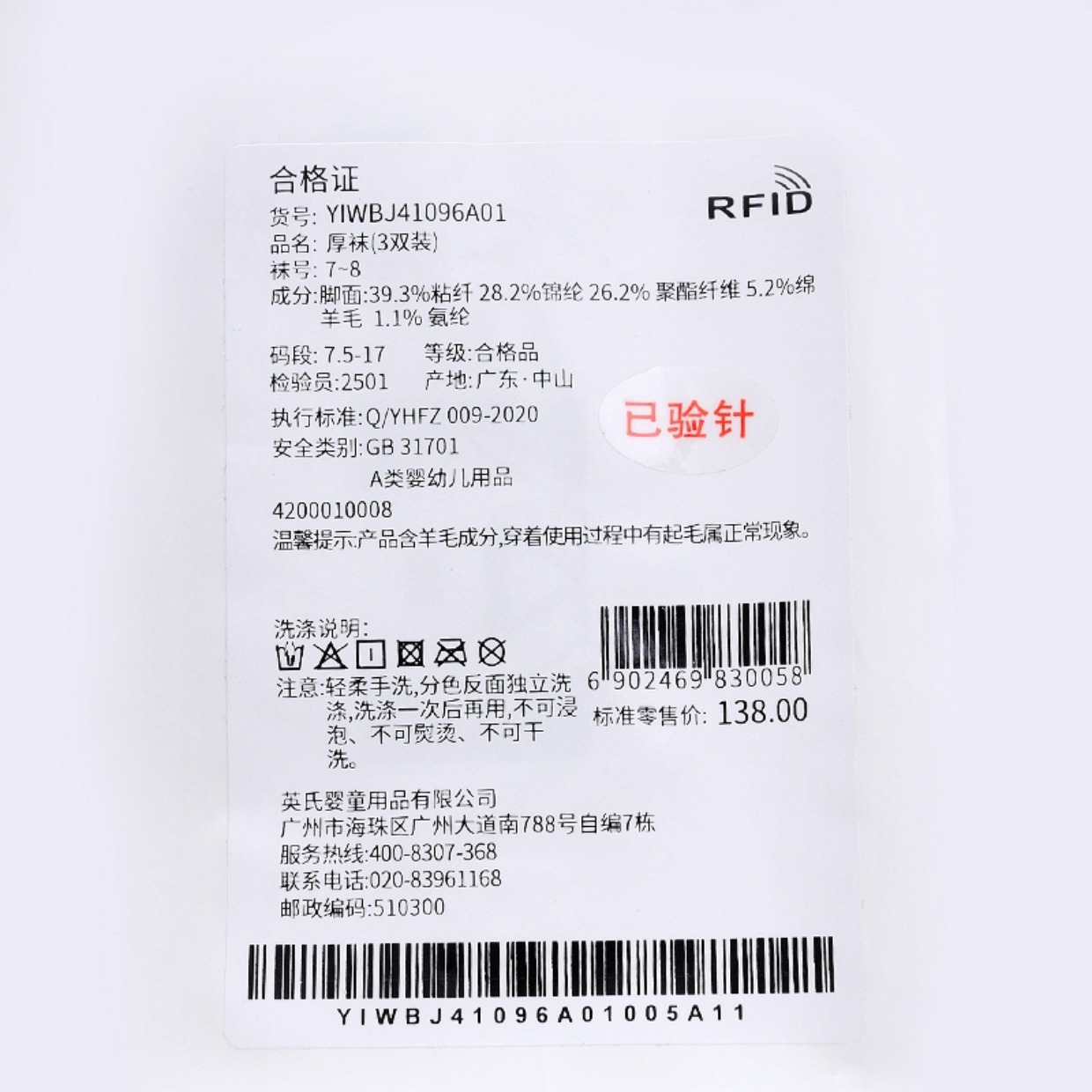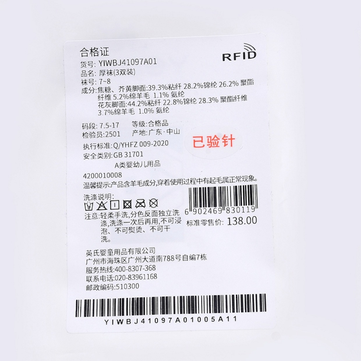 英氏-鞋袜类(冬)E1厚袜(3双装)英氏白11CM