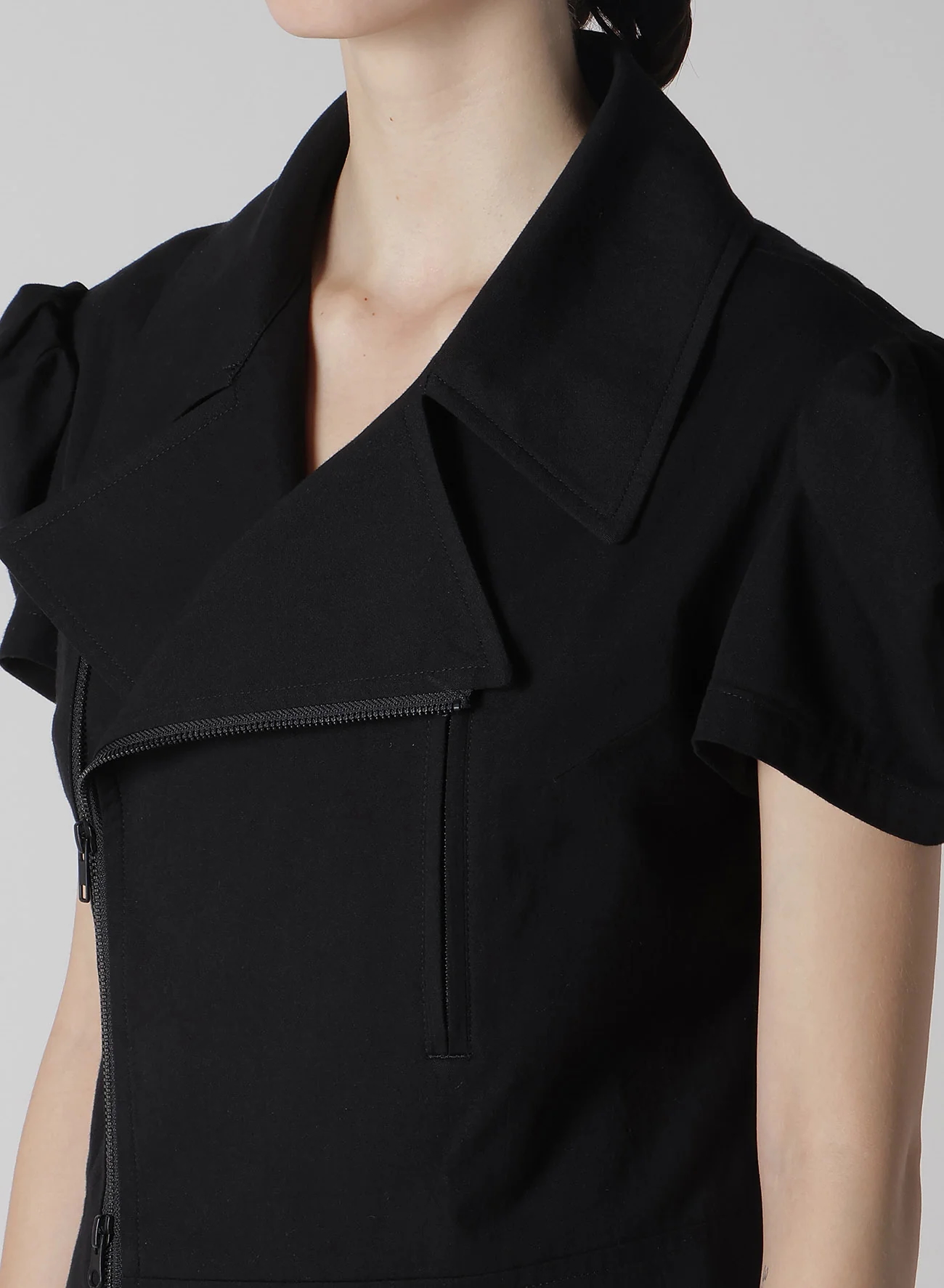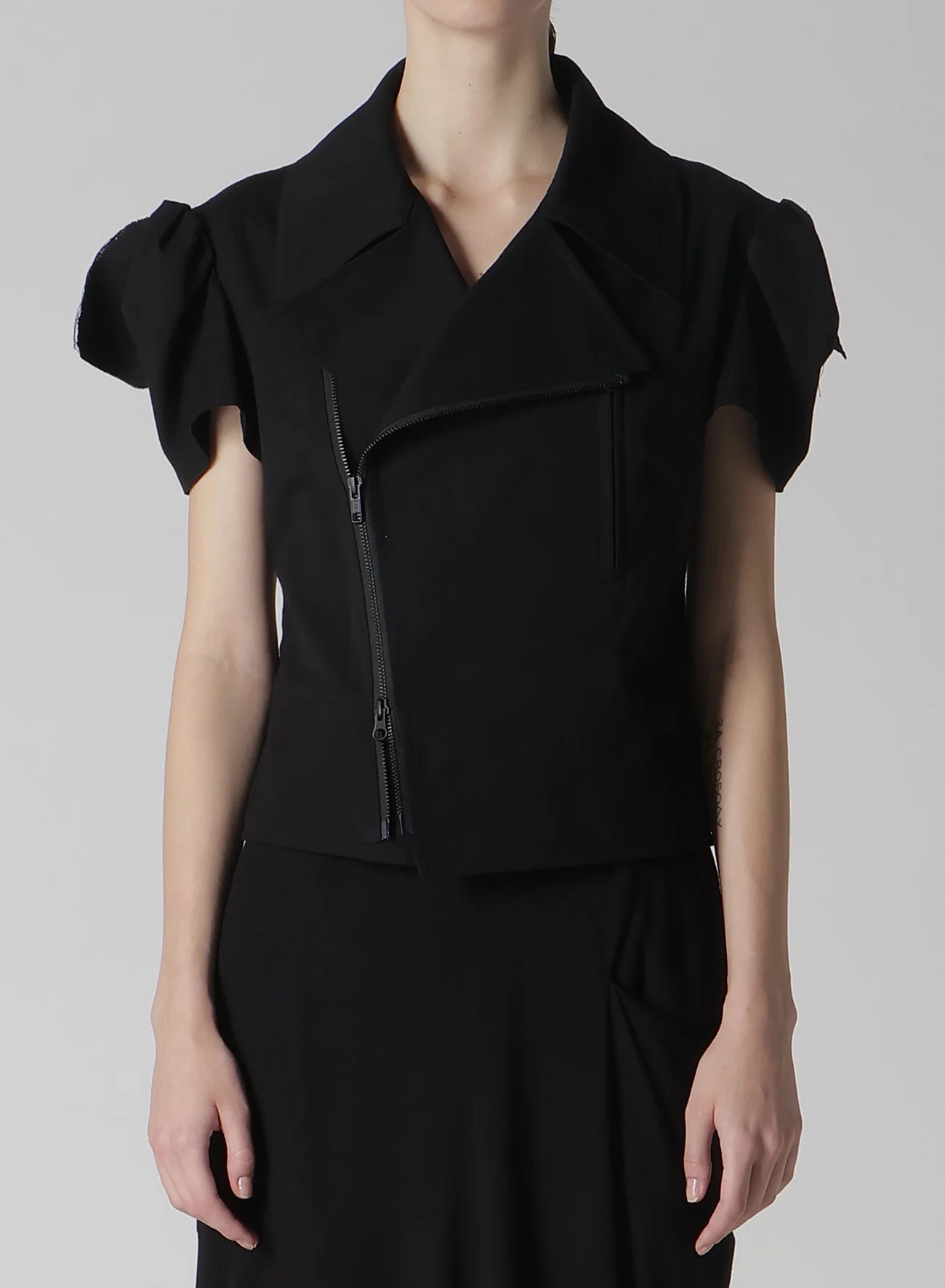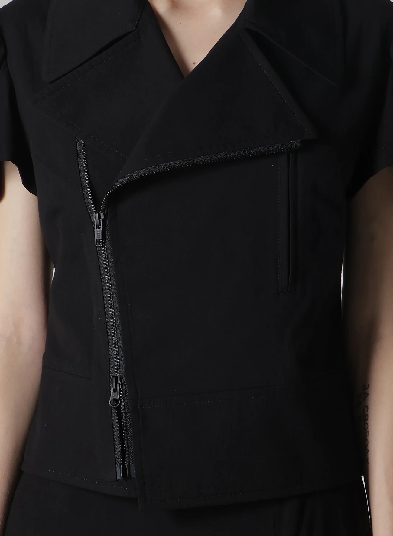 這款motorcycle jacket以棉/人造絲平紋布製成,具有局部拆卸袖和開衩袖口設計,露出肌膚。袖頭呈方形,增添獨特的風格。