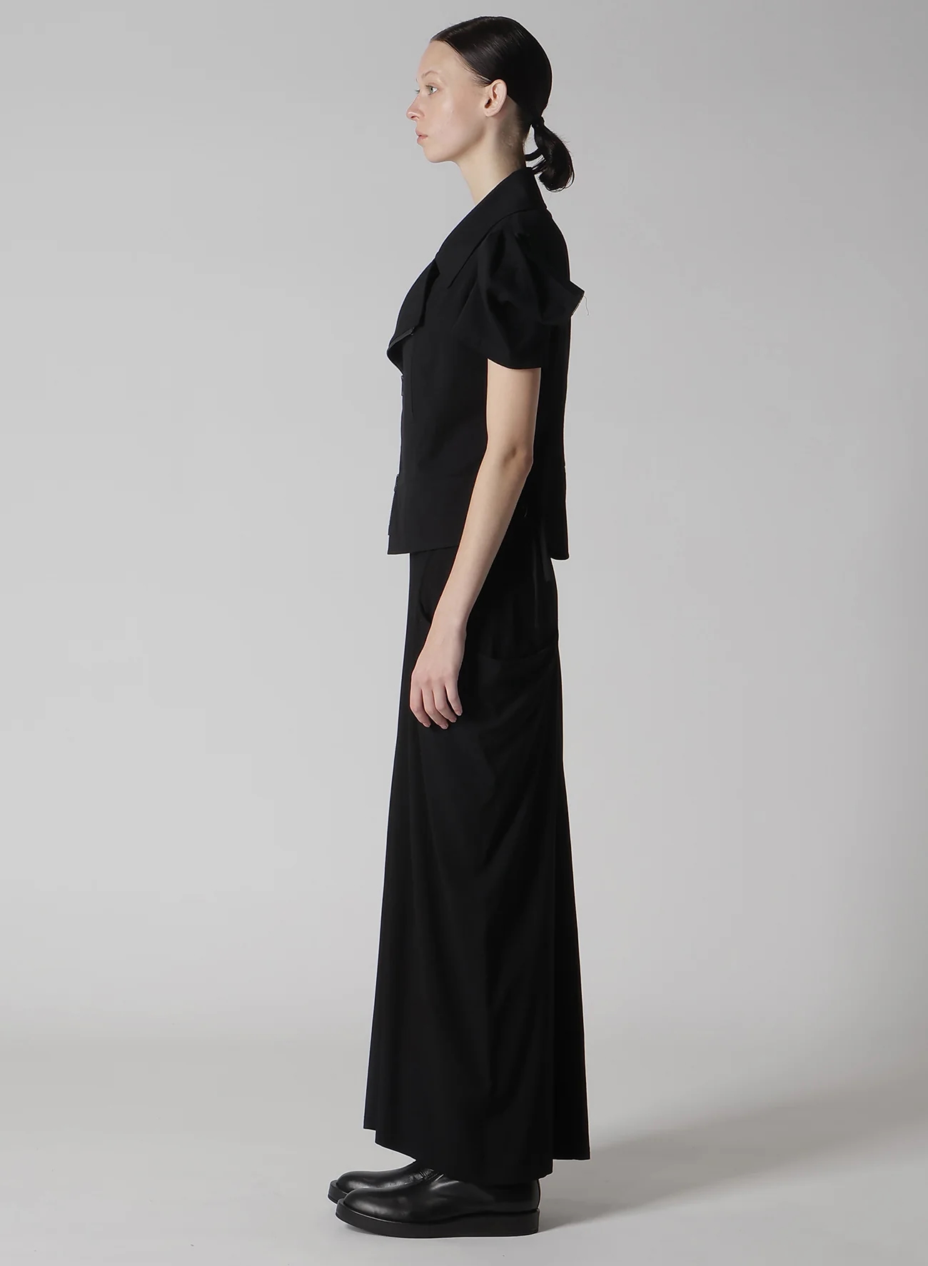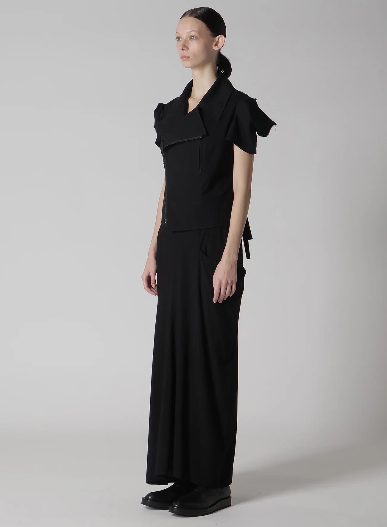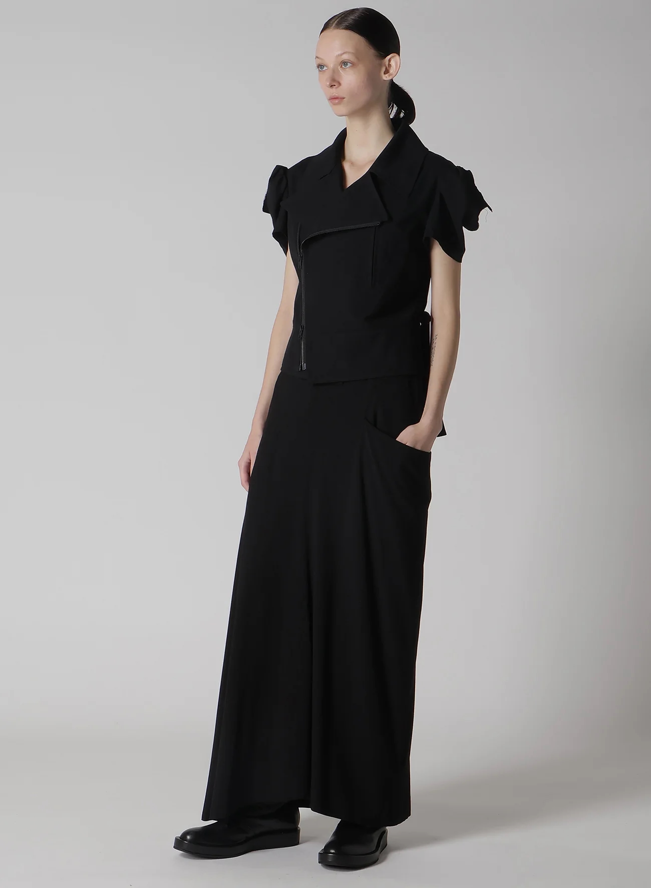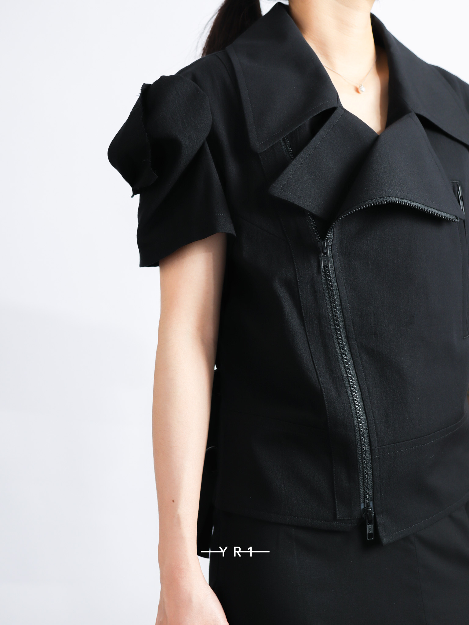 這款motorcycle jacket以棉/人造絲平紋布製成,具有局部拆卸袖和開衩袖口設計,露出肌膚。袖頭呈方形,增添獨特的風格。