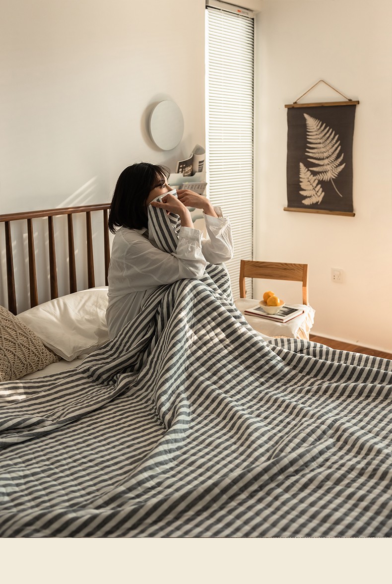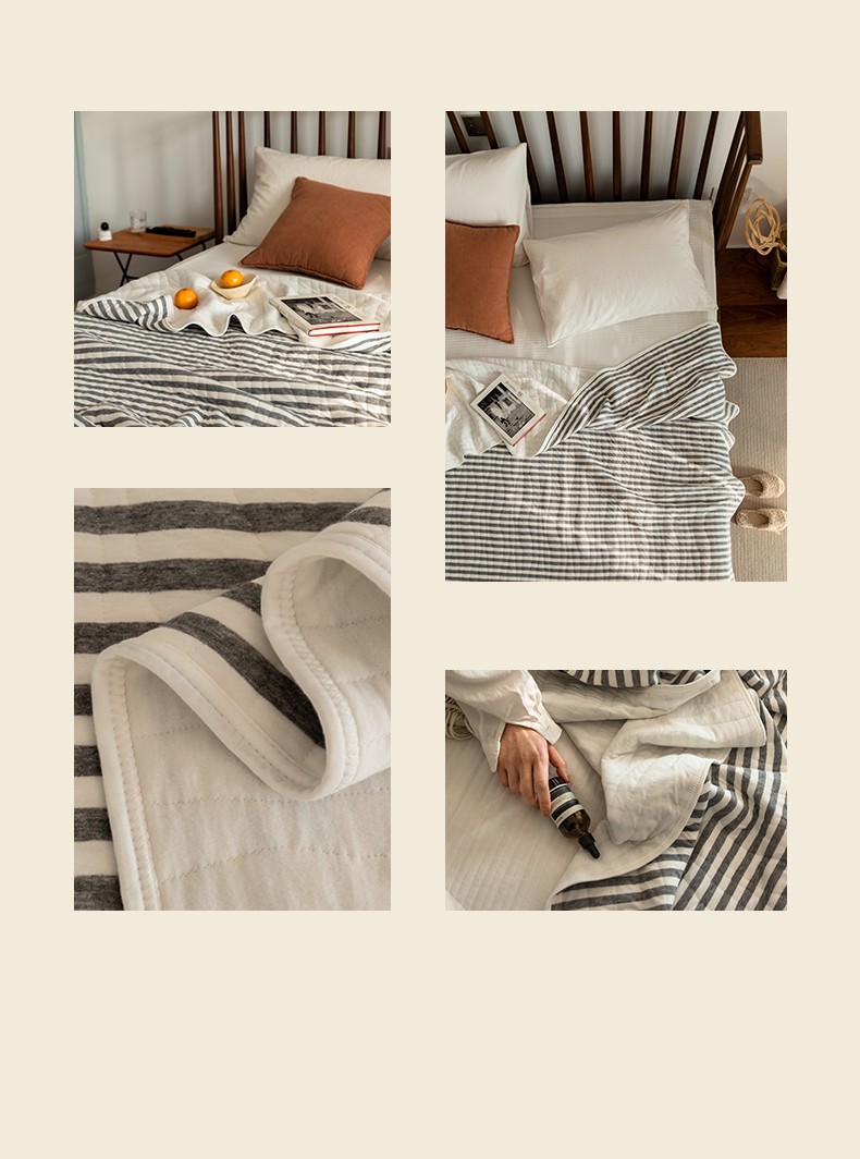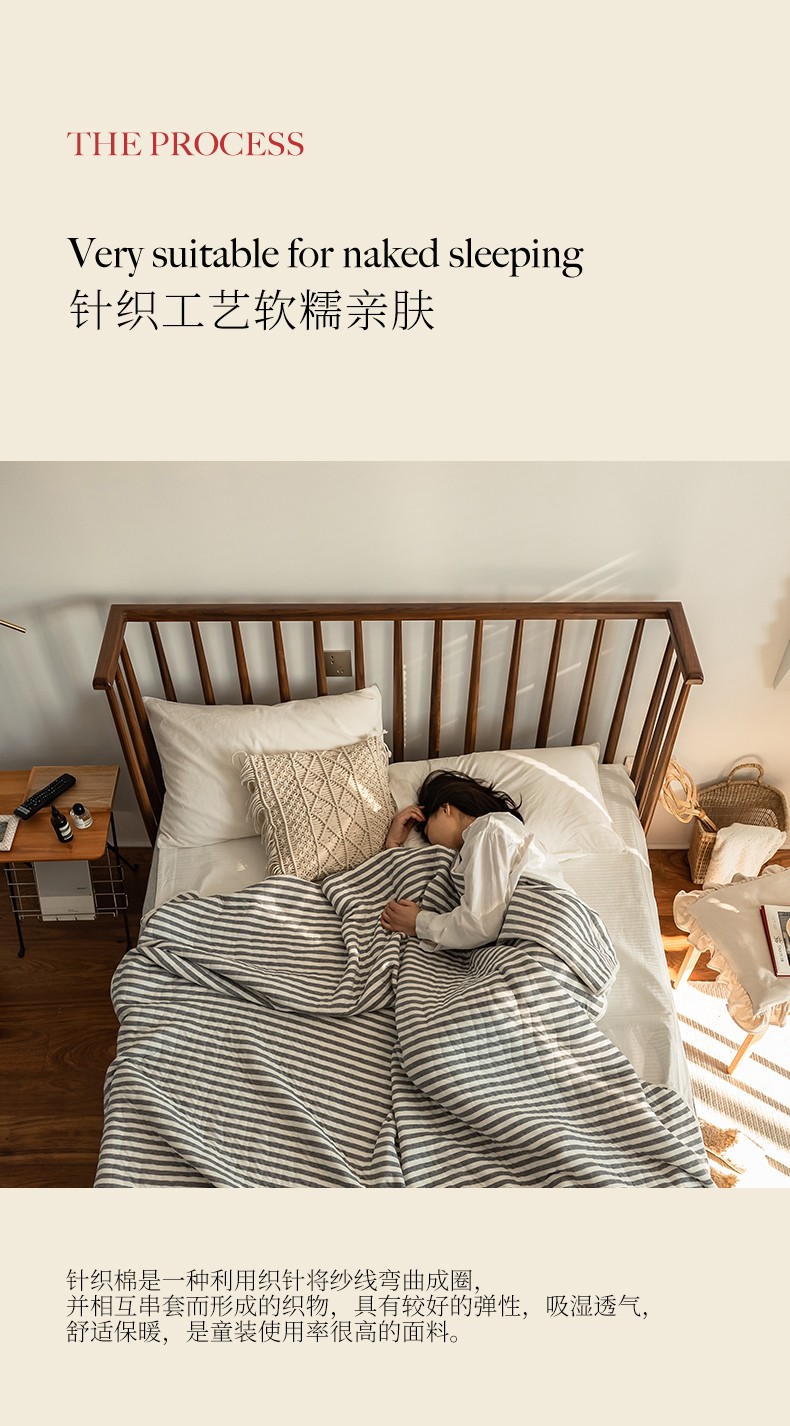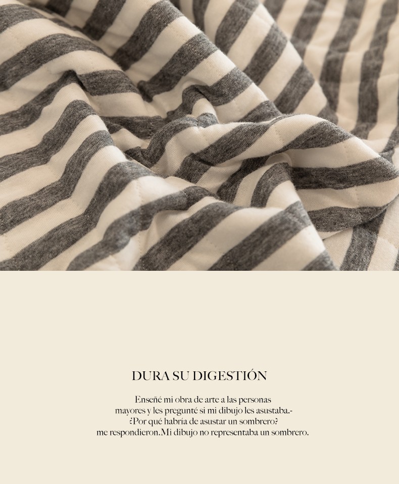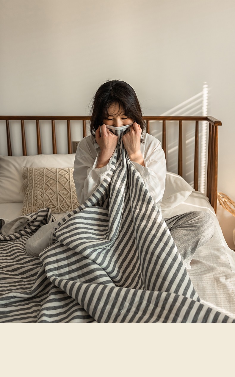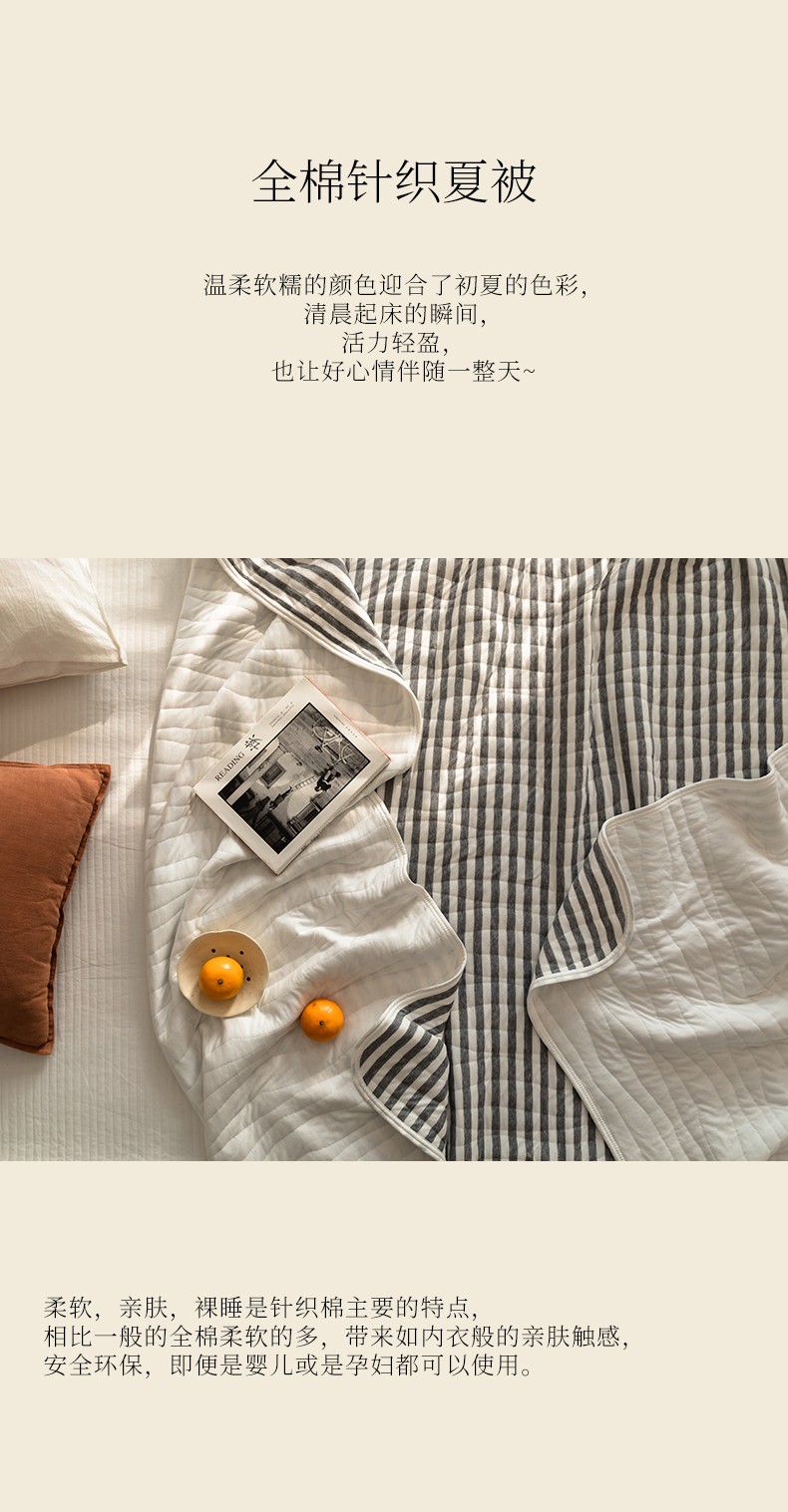 这款夏凉被,采用的全棉条纹汗布,原料选用“百隆”色纺纱,且通过瑞士良好棉花发展协会认证。天然材质,是来自大自然的馈赠。