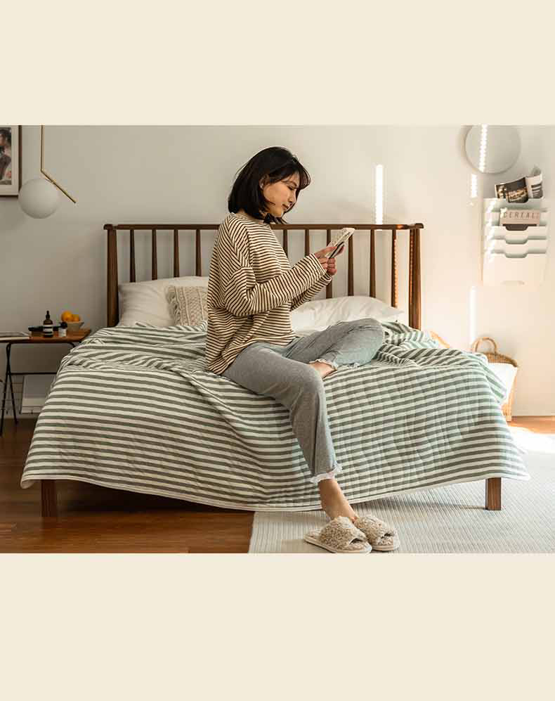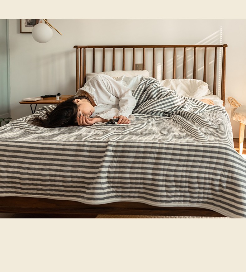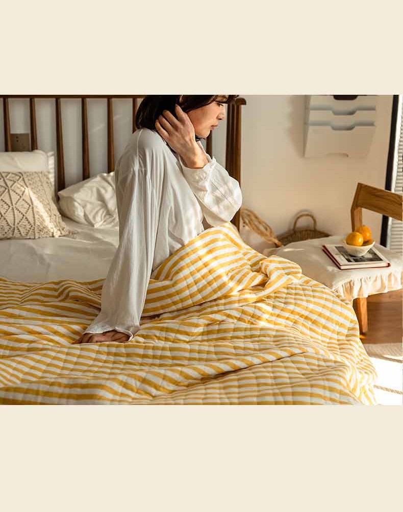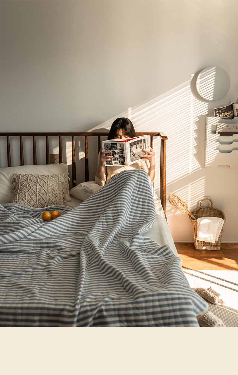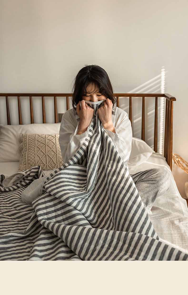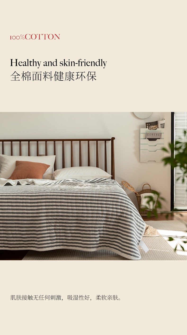 这款夏凉被,采用的全棉条纹汗布,原料选用“百隆”色纺纱,且通过瑞士良好棉花发展协会认证。天然材质,是来自大自然的馈赠。