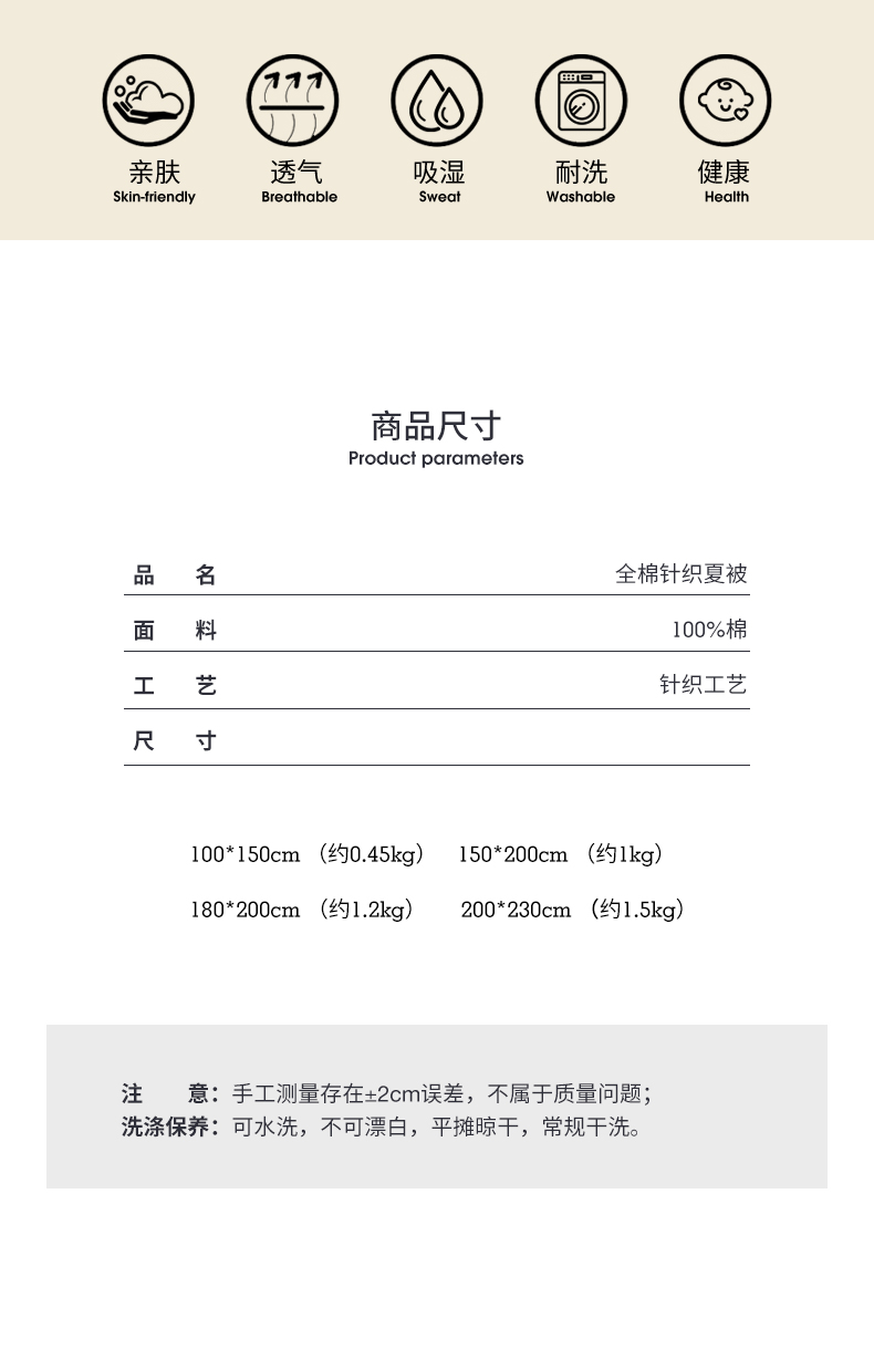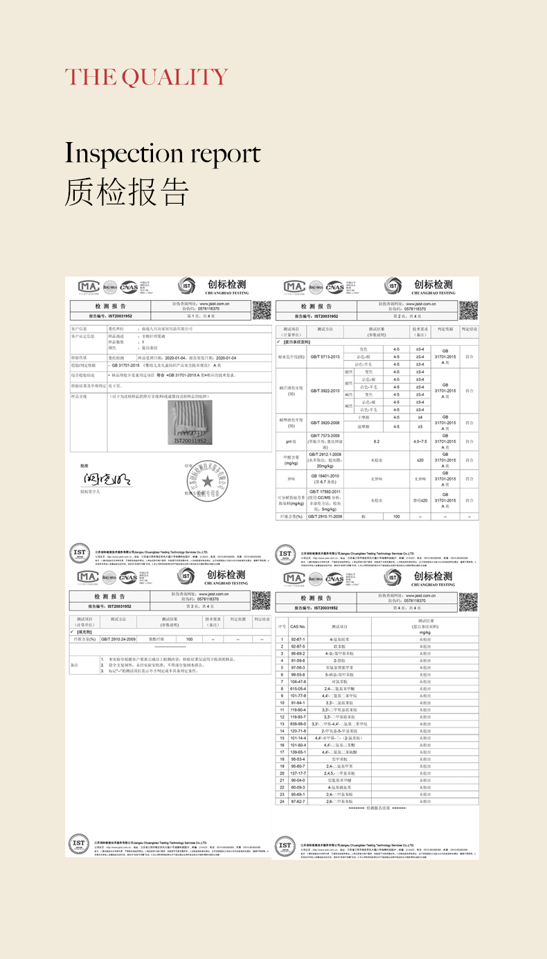 这款夏被通过严苛检验测试,品质值得信赖,达到国家A类标准,国家检测无致癌芳香胺,无甲醛,无荧光增白剂。