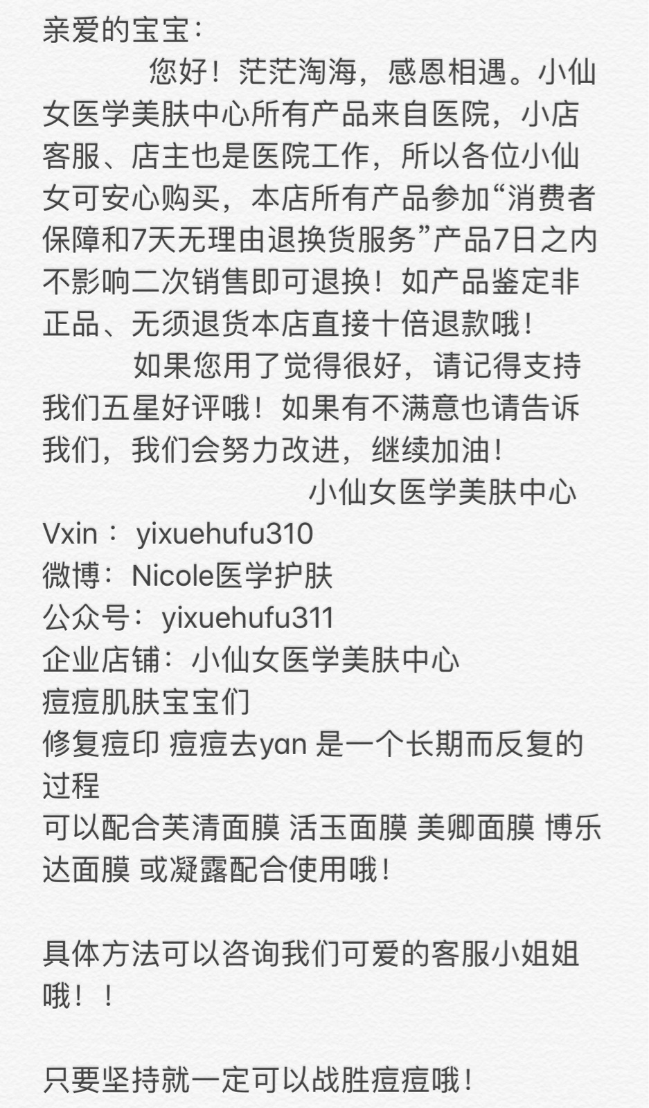 您好!茫茫淘海,感恩相遇。小仙女医学美肤中心所有产品来自医院,小店客服、店主也是医院工作,所以各位小仙女可安心购买,本店所有产品参加“消费者保障和7天无理由退换货服务”产品7日之内不影响二次销售即可退换!如产品鉴定非正品、无须退货本店直接十倍退款哦!
