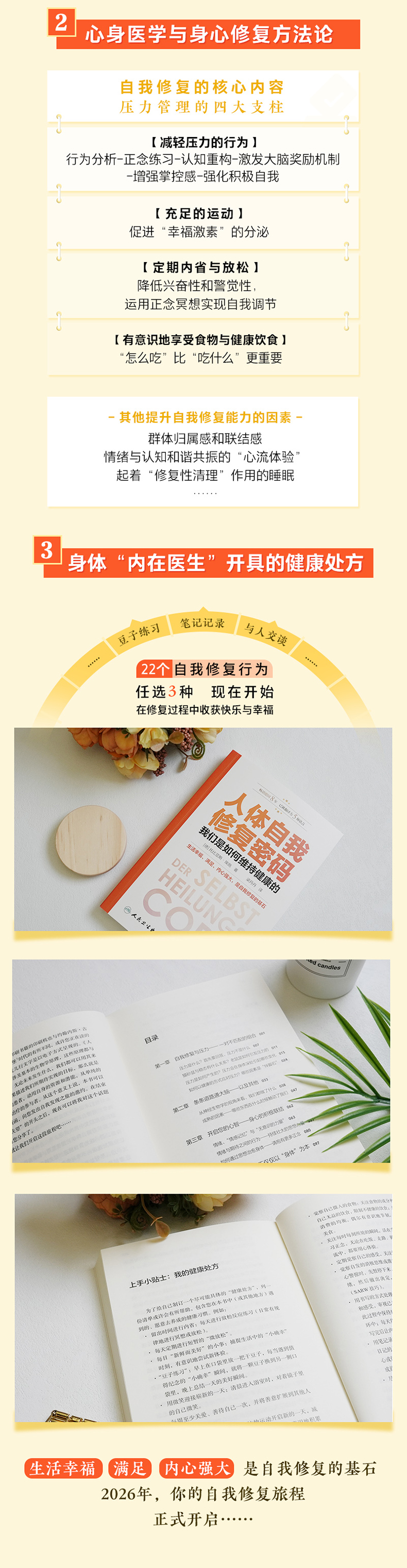 每个人身上都蕴藏着自我修复的潜能。自我修复的密码包含着知识的获取、理解、吸收与自我信任,而不要完全将判断和选择的权利交付他人。我们越发清晰地认识到压力产生的负面影响:面对背痛、高血压、睡眠障碍以及过敏等慢性疾病,压力会抑制身体自我修复的能力。心身医学一面是现代医学,另一面是意识调节、自然疗法和生活方式改善,不是非此即彼,而是兼收并蓄。这正是本书所倡导的理念。从中,您不仅能了解人体自我修复的原理,而且能找到切实可行的有助于促进健康的具体建议。既有重拾旧经验的“温故”,也有尝试新方法的“知新”。尽管任何人永远无法对结果“打包票”,但是在人生的每一个阶段,每个人都有机会为自己的健康、满足感和内在力量做些什么。当下,就是一个可以及时抓住的绝好机会!