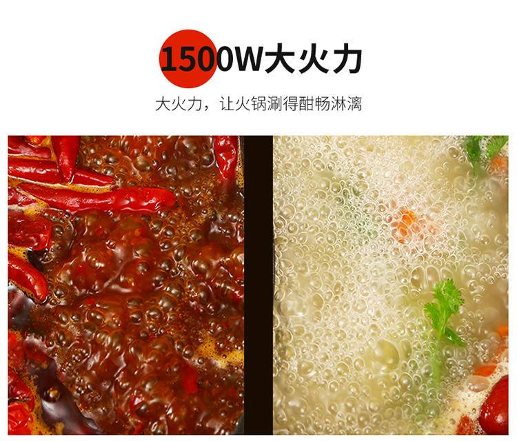 2.5L容量,大口径,可满足2-5人需求,人多也不怕,同时也迁就你和家人的口味,无惧油渍,清洗方便,1500W大火力,让火锅涮的酣畅淋漓,开始鸳鸯新玩法。