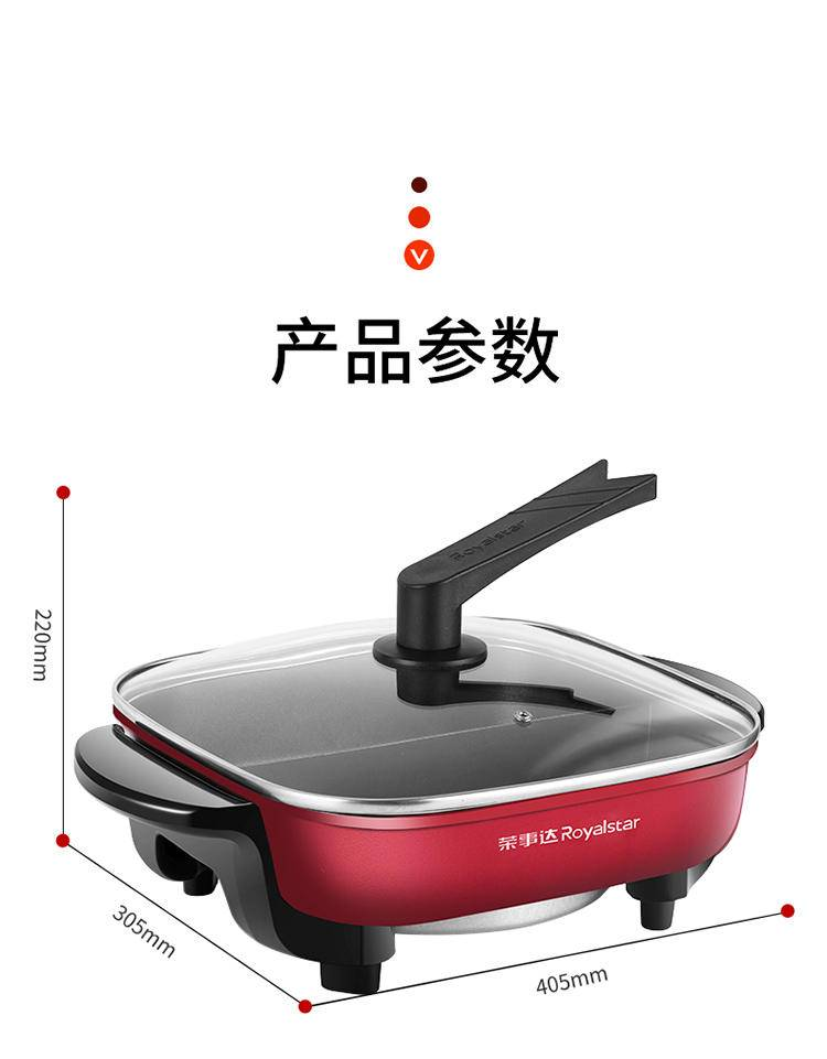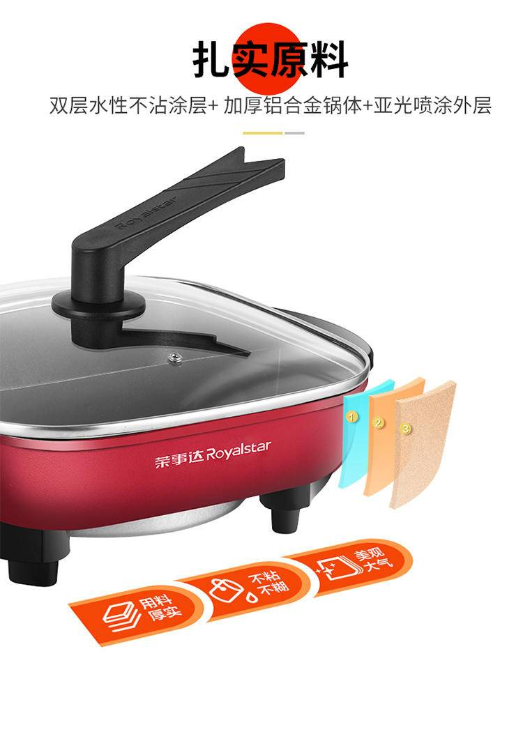 3.革新U型发热管,搭配1500W功率,嵌入式搭配,均匀发热,美食无需久等,扎实原料,双层水性不粘涂层+加厚铝合金锅体+亚光喷涂外层,久煮不粘锅,清晰解腻,凸显本味,品质有保证,灵动无极调温,5档调温,自由调节,把烹饪温度更随心,贴心设计,加厚防烫把手,绝缘防烫很方便,给生活增添更多便利