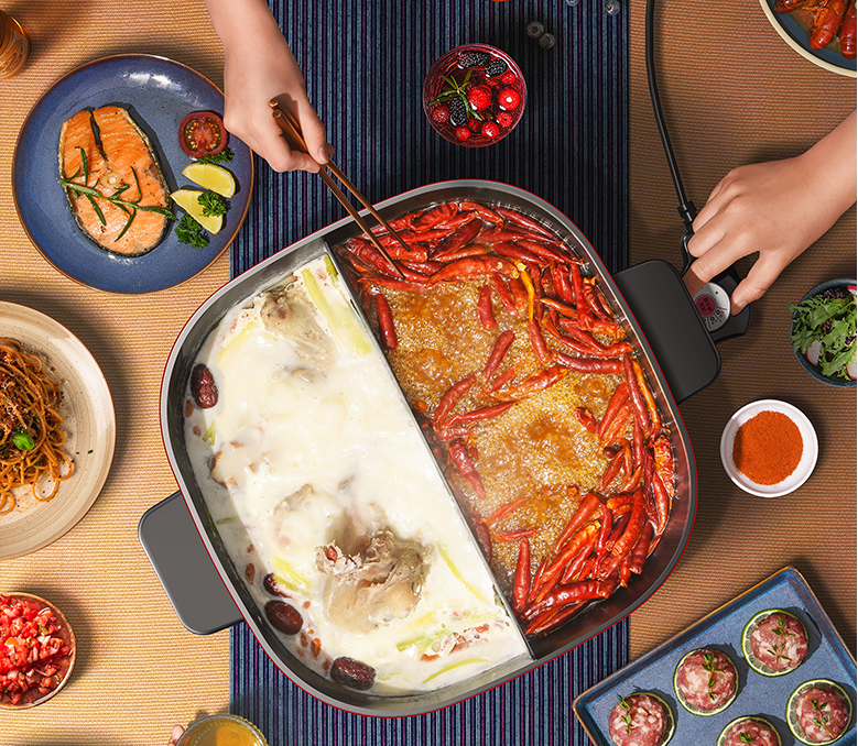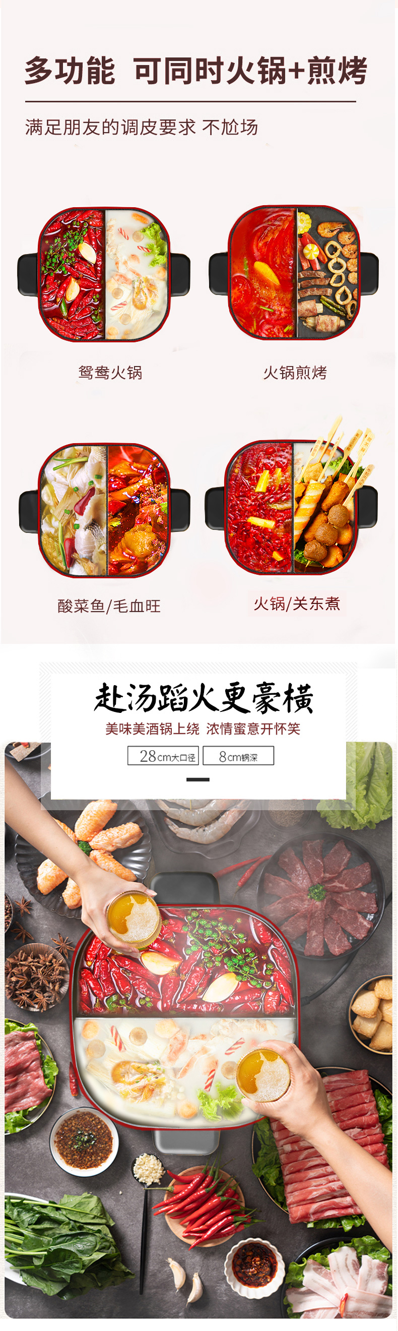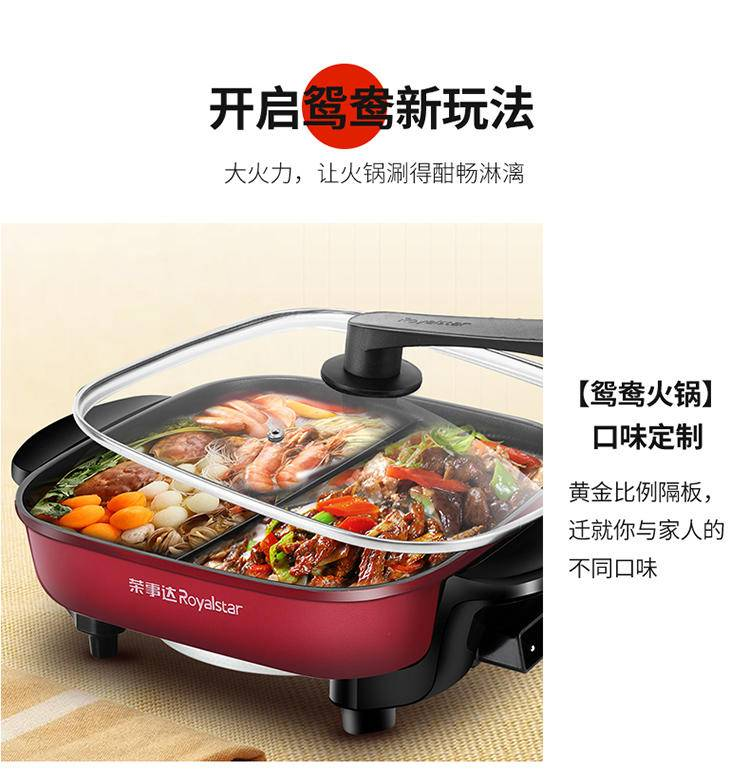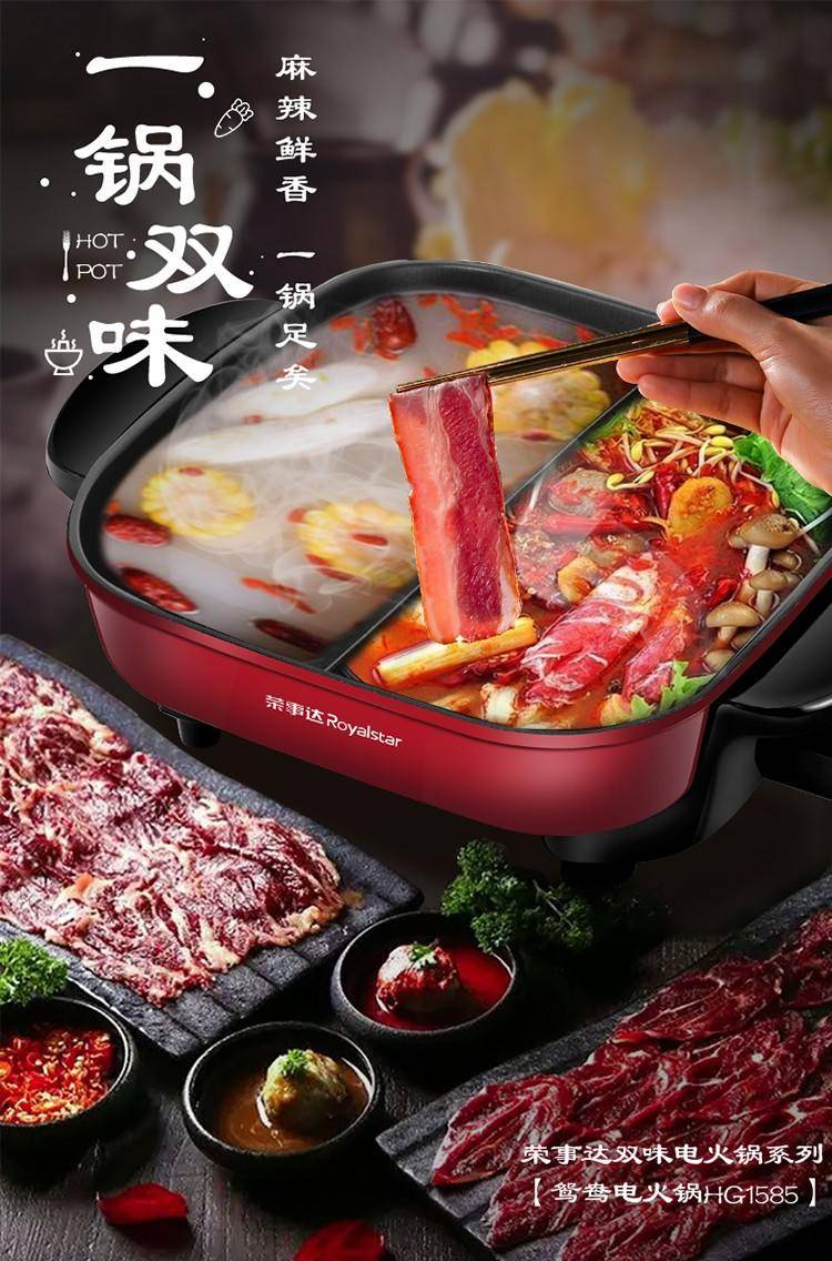 1.一锅双味,幸福食光,火锅美味,欢聚共享,双重美味时刻挑战你的味蕾,清汤爽口美味,红汤麻辣够劲,黄金比例隔板,不同口味给你双重享受,多功能,可同时火锅/煎烤,涮烤同步,多重满足,涮锅同时还能煎烤,任性美味搭配,百般厨艺,你喜欢的都能做,冬日的火锅,美味的早饭