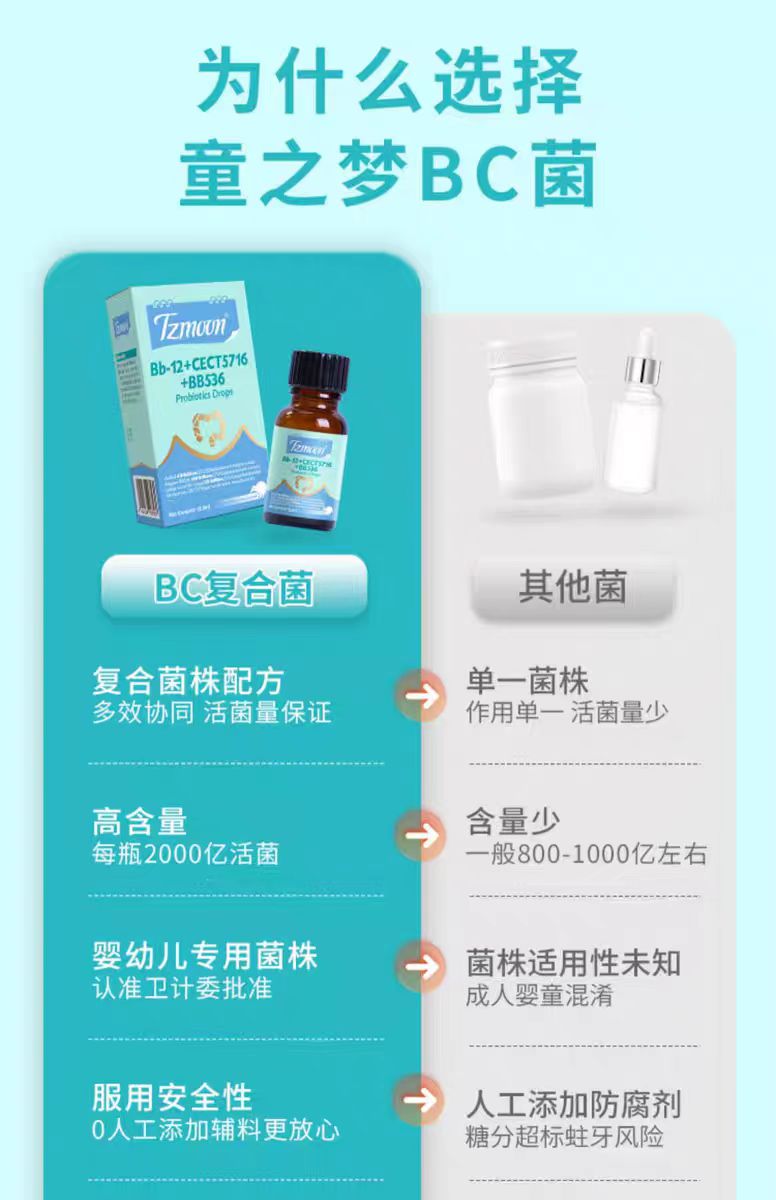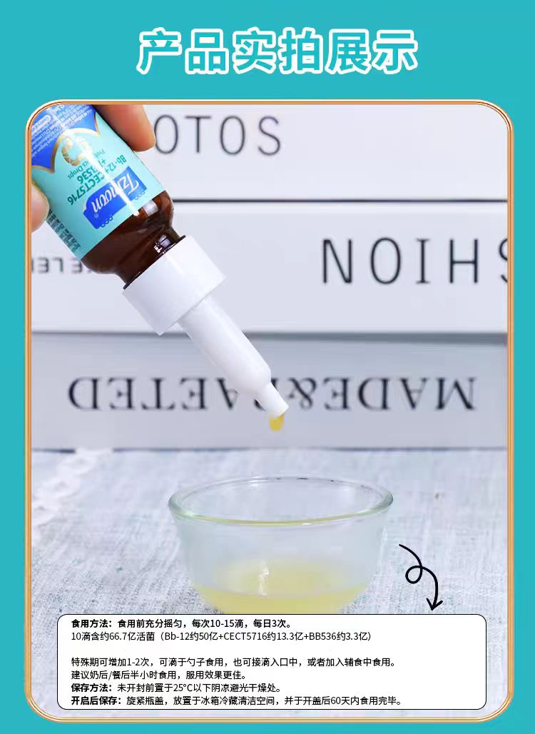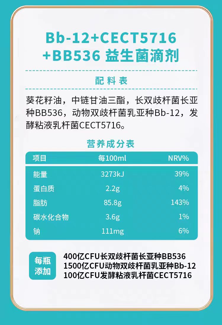 每瓶益生菌2000亿,10滴含48亿(对比:Ripro迪辅乐品牌每6滴10亿菌,百适滴每10滴20.4亿菌,康萃乐5滴20亿)