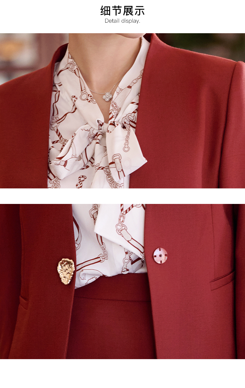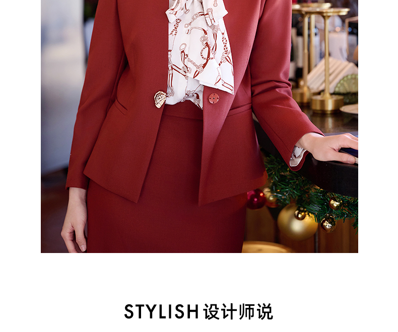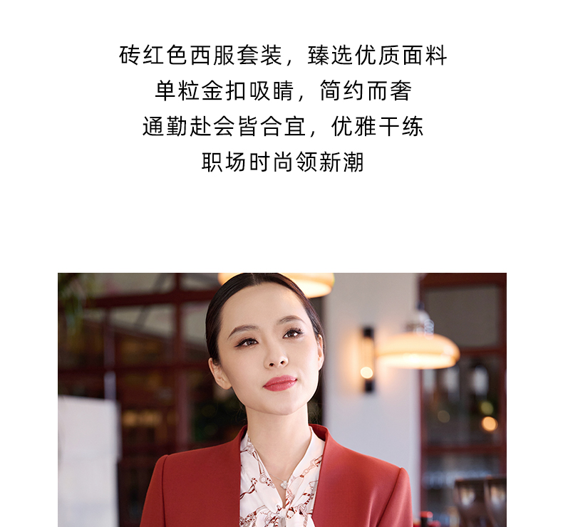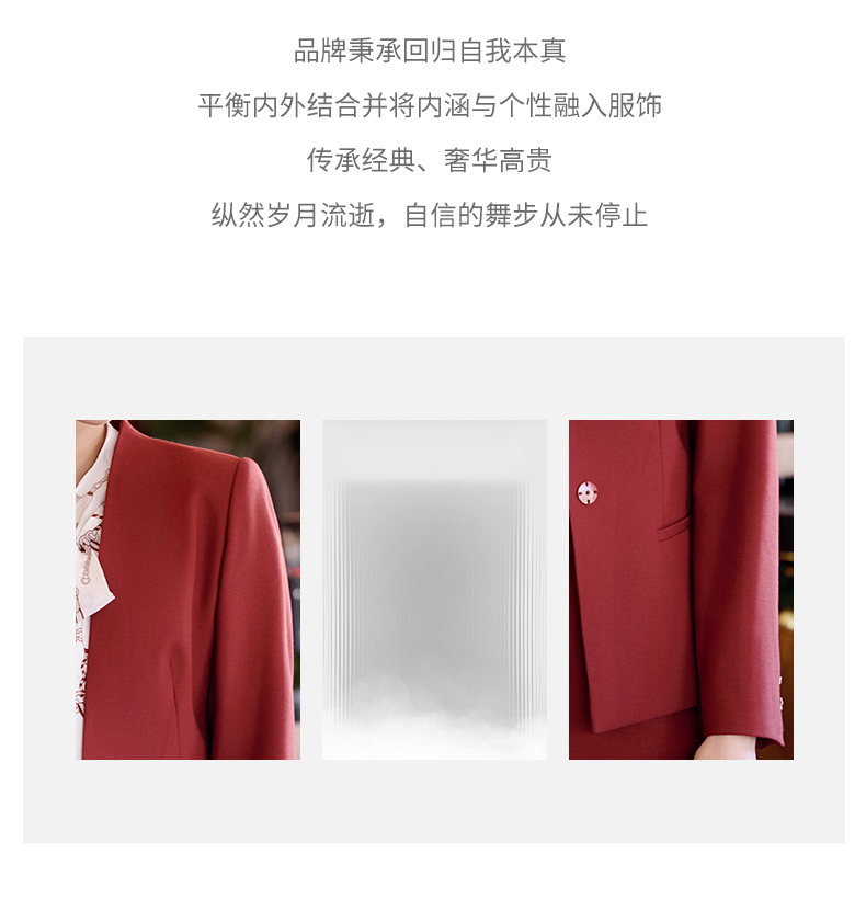 成熟、稳重、高贵典雅、大方得体 融合东方文化的含蓄和法国的浪漫 将创意的艺术性与消费需求相结合 为自信女性塑造高品质场合服装