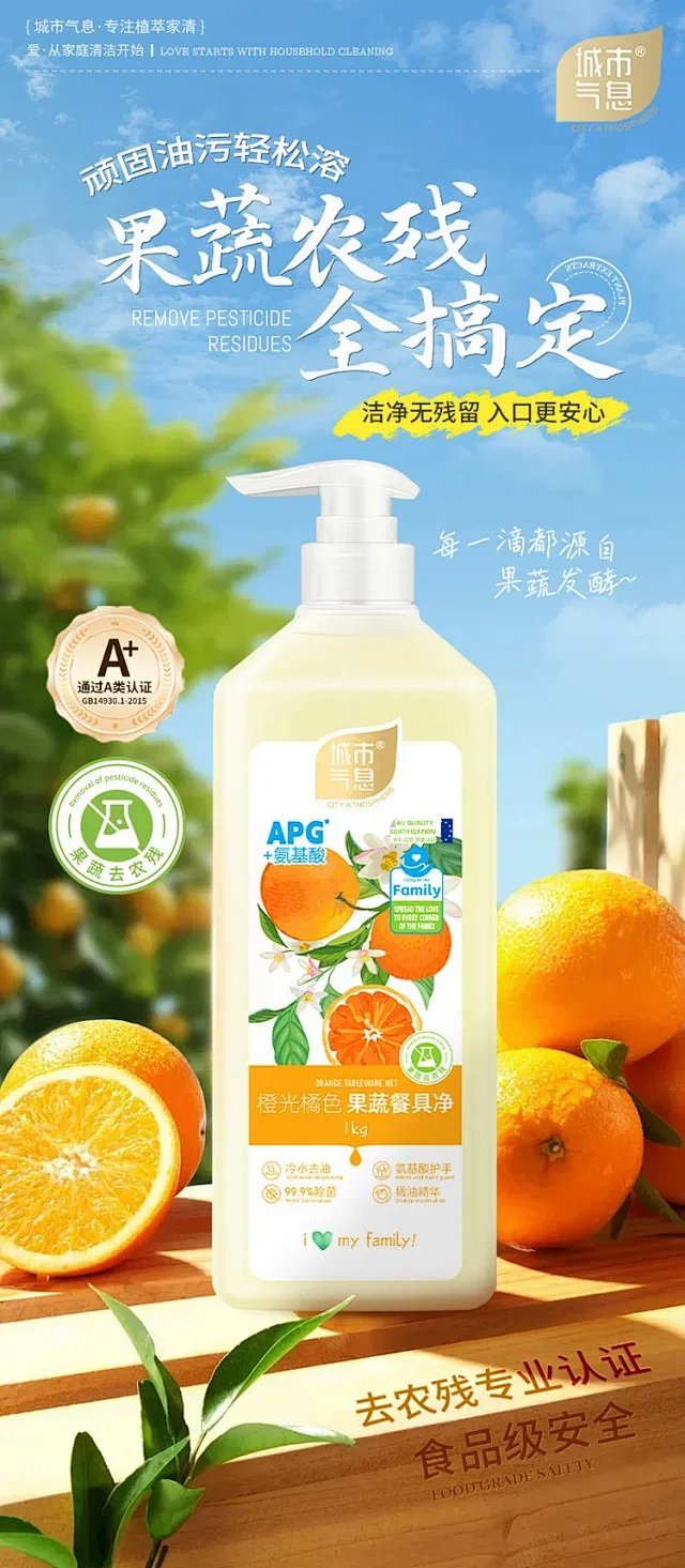 #城市气息橙光橘色果蔬餐具净,高效去农残,深层洁净看得见~