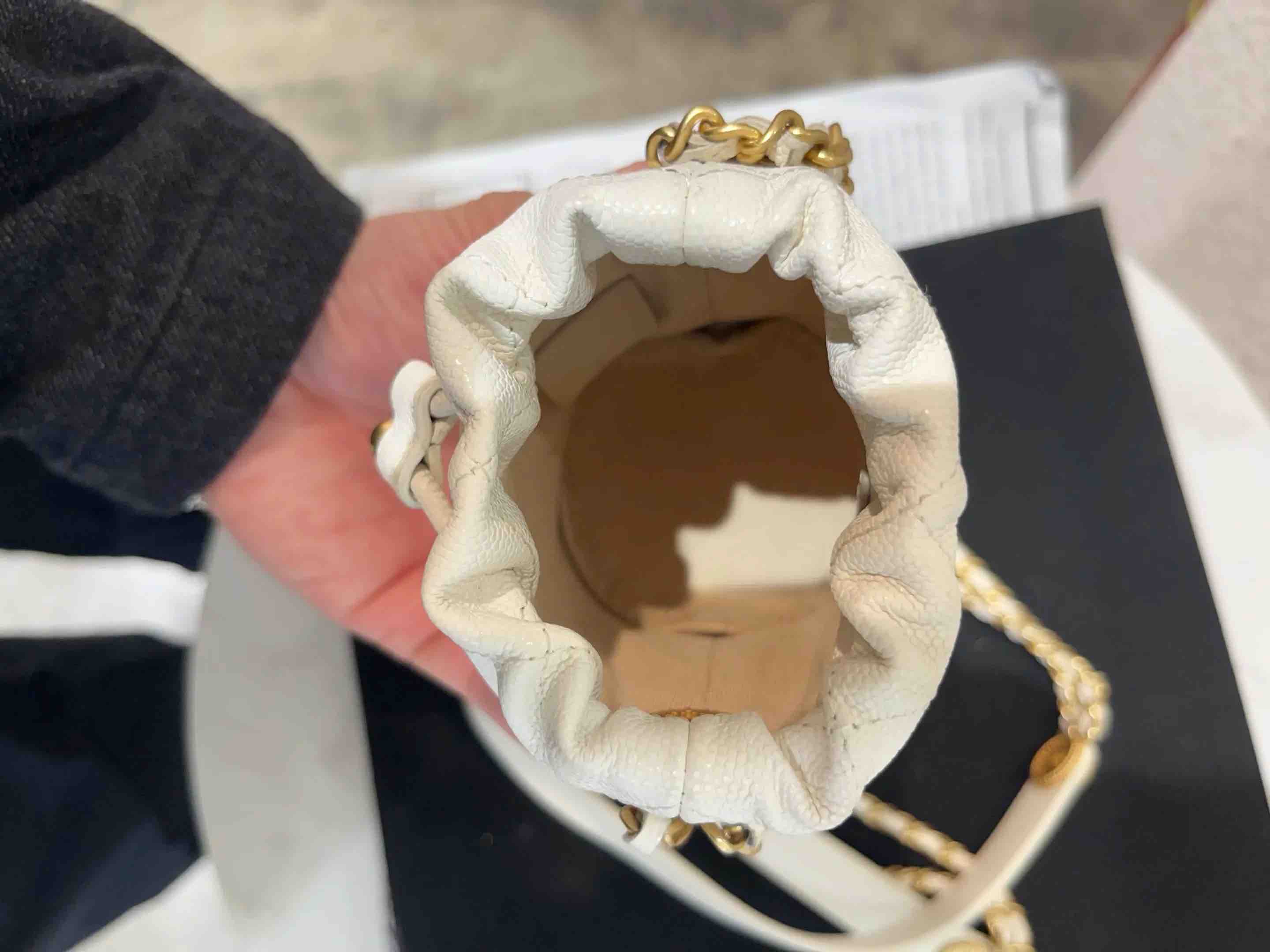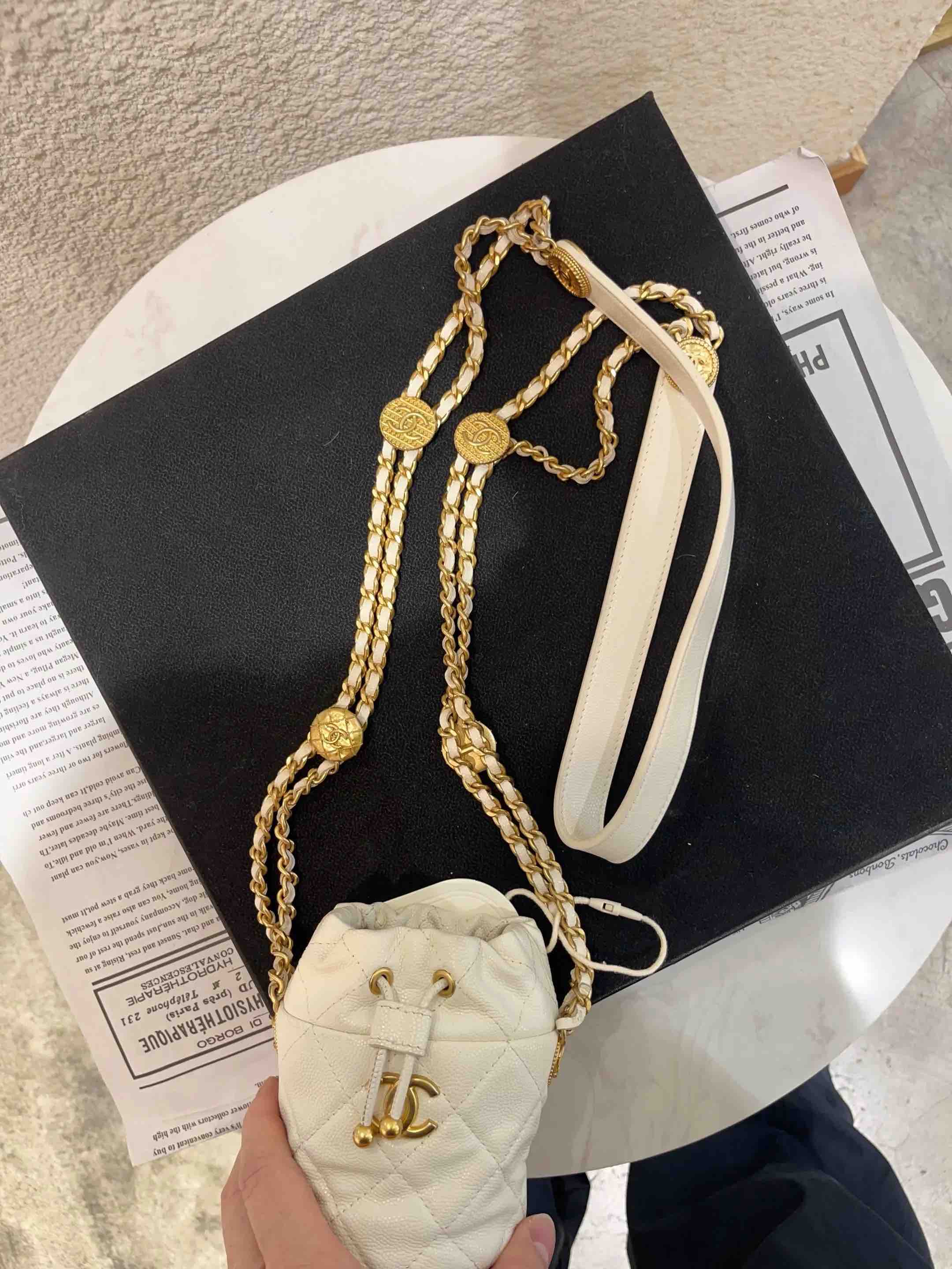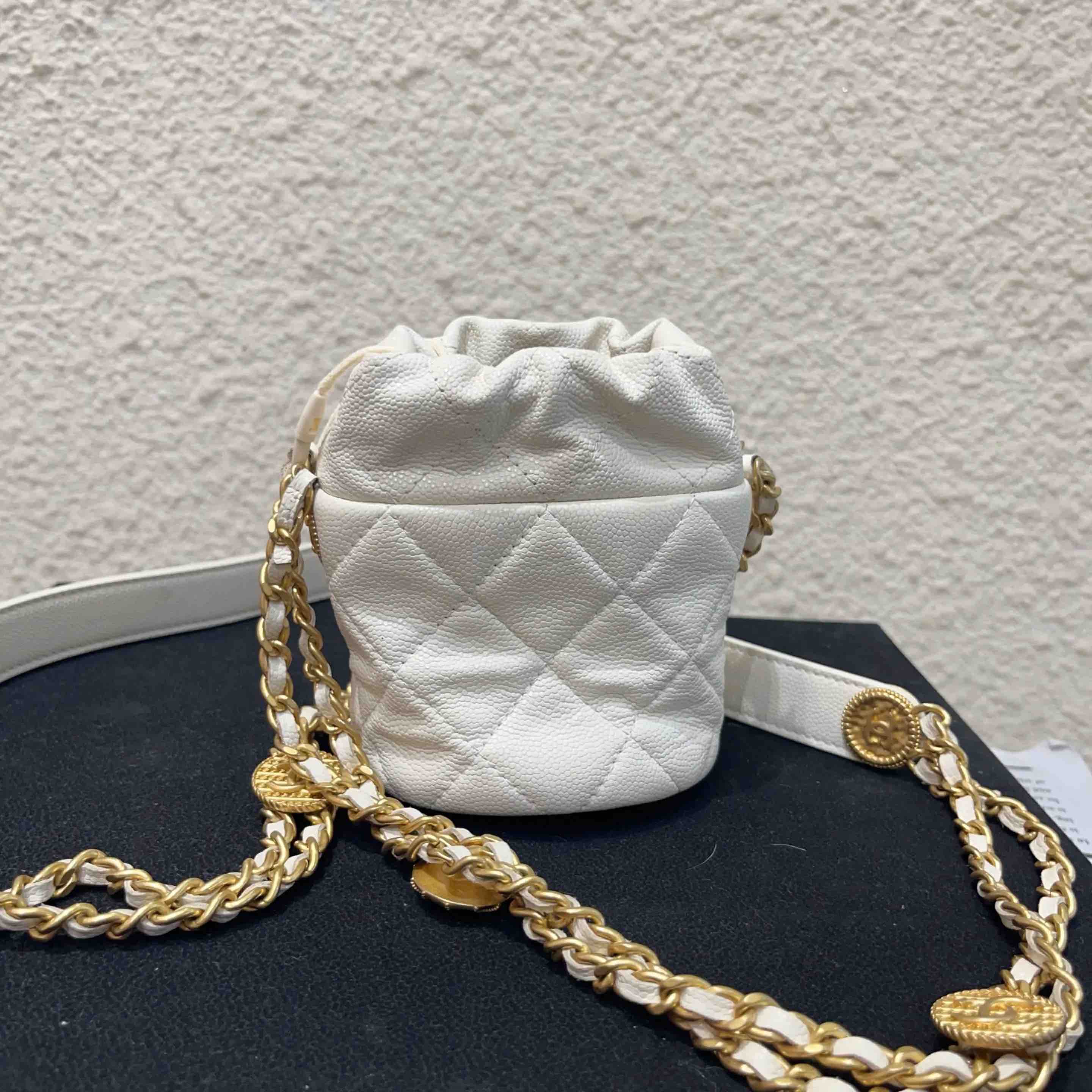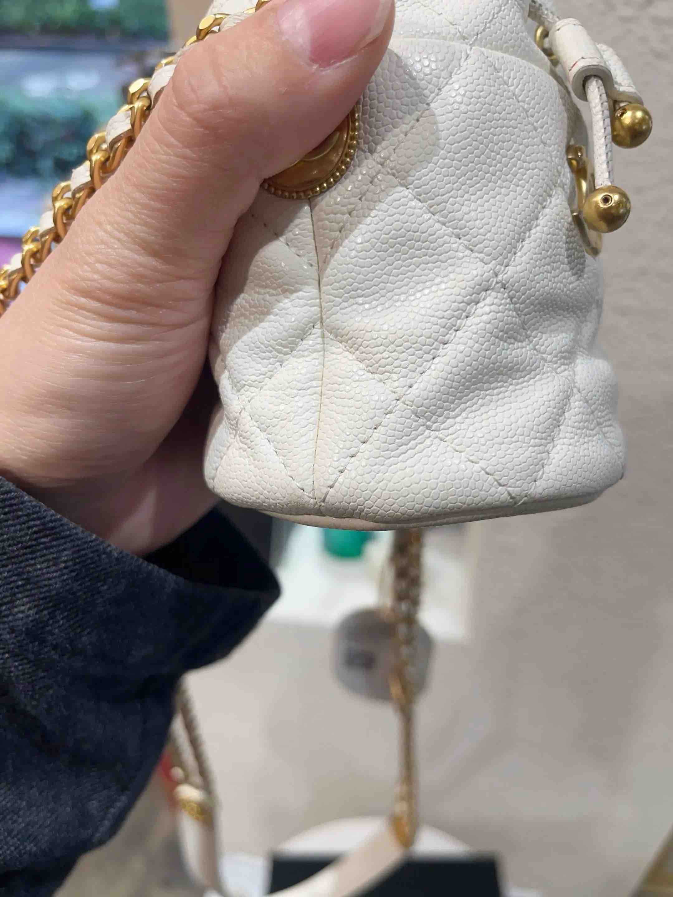【商品详情】正品二手 Chanel 22A mini 金币 抽绳 水桶包🤍 95新 8×11 芯片款。底部正常使用感。菱格纹珍珠链 优雅百搭