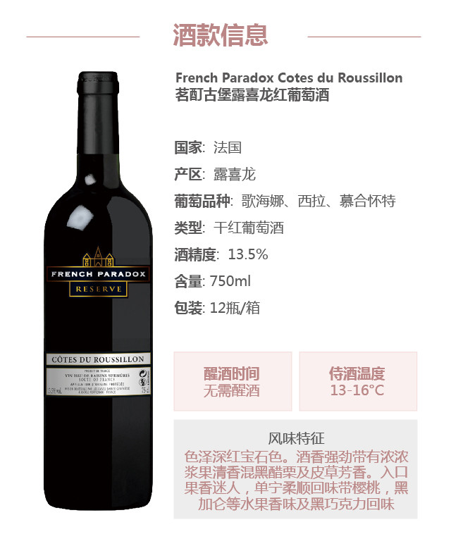 法国原瓶进口红酒 茗酊古堡露喜龙红葡萄酒 French Paradox Cotes de Roussillon 单支装750ml