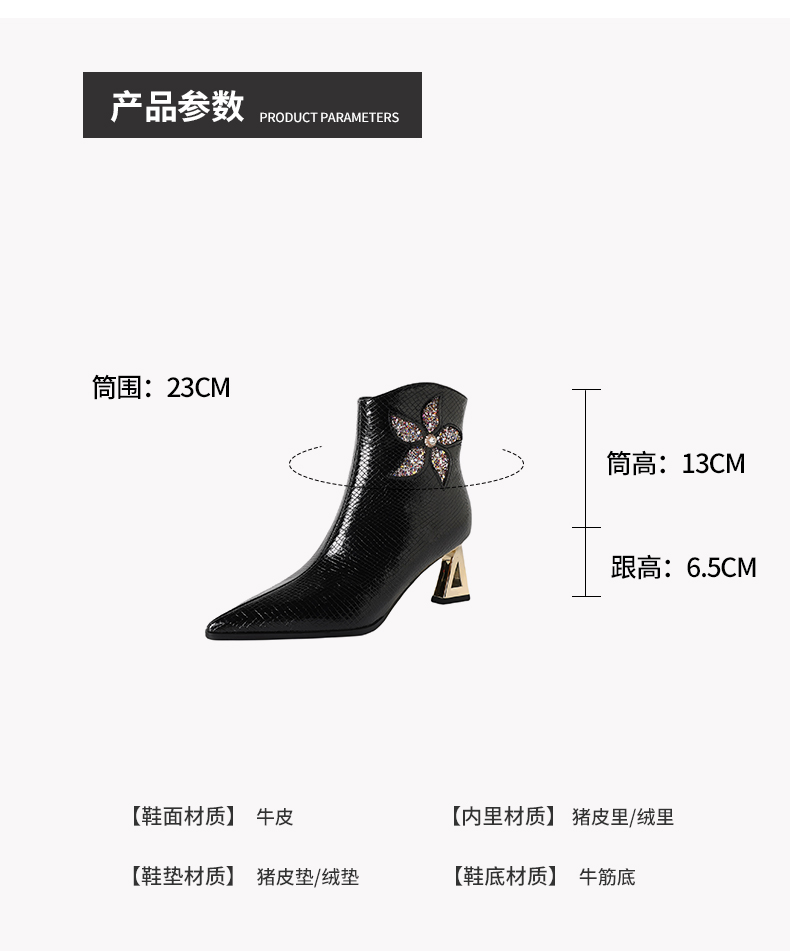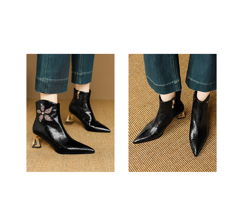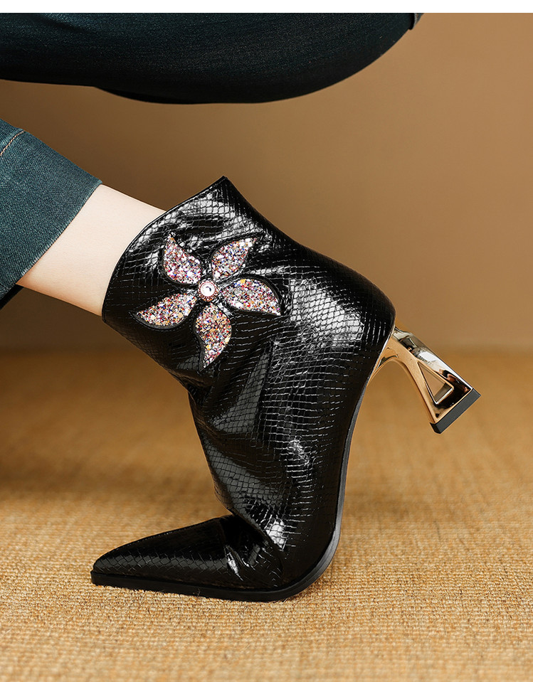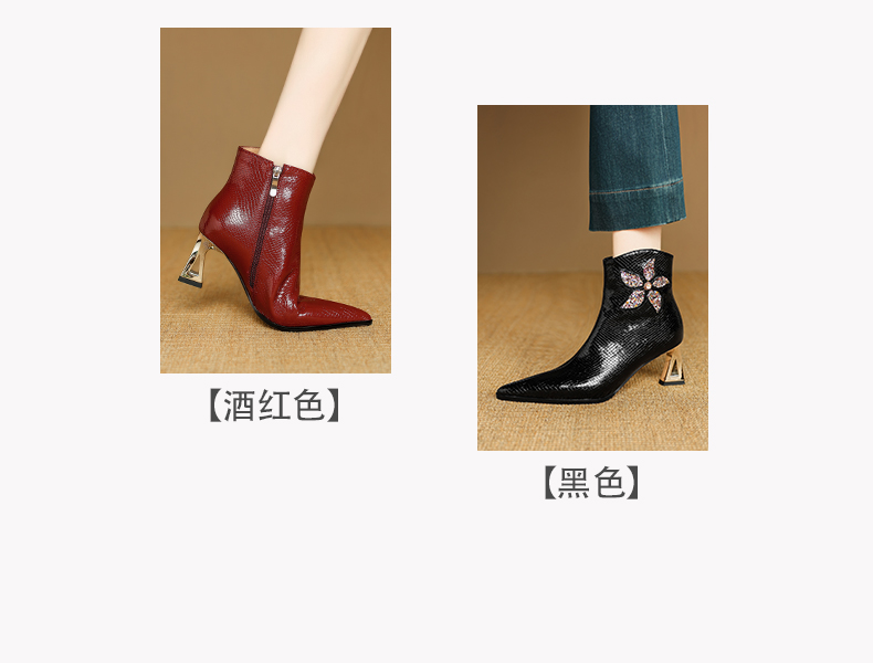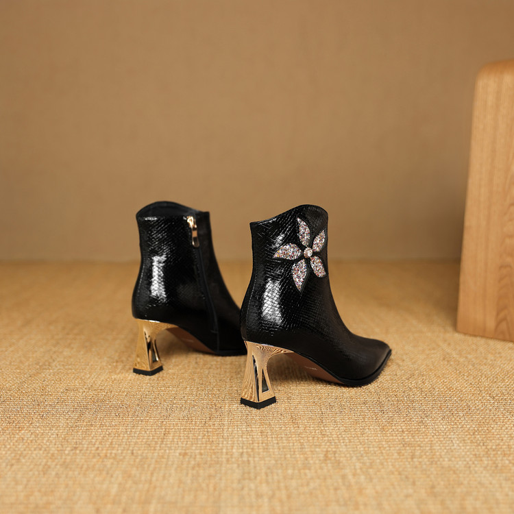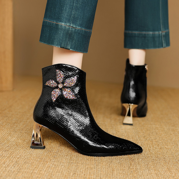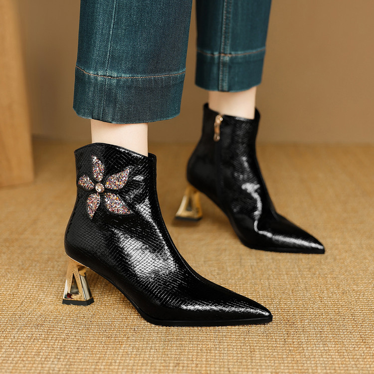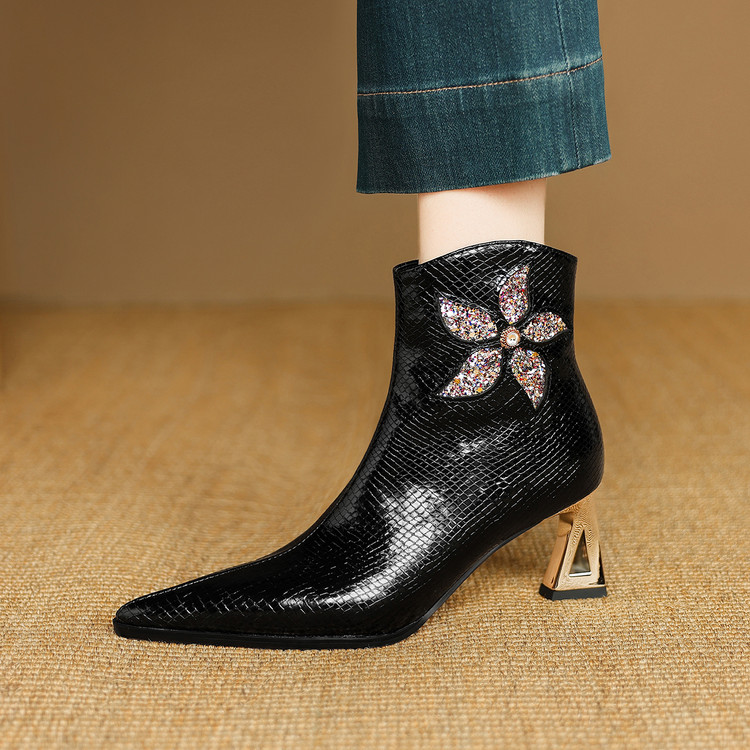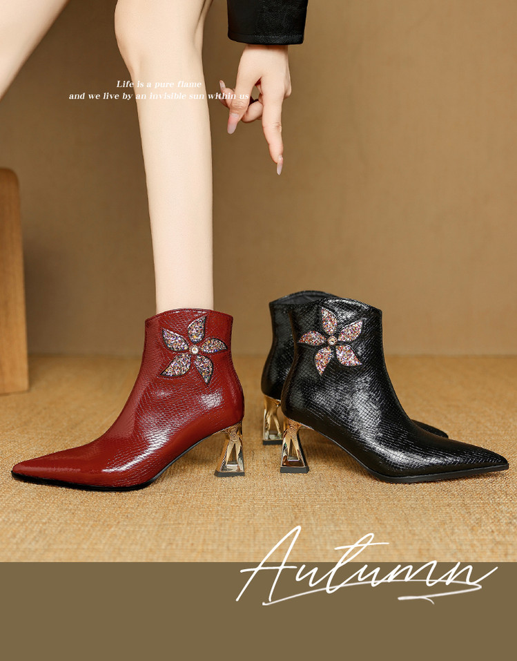 【预售5天】春秋单靴子女真皮尖头花朵水钻高跟皮靴冬季短靴粗跟及踝靴子DB&M6615