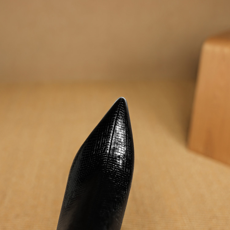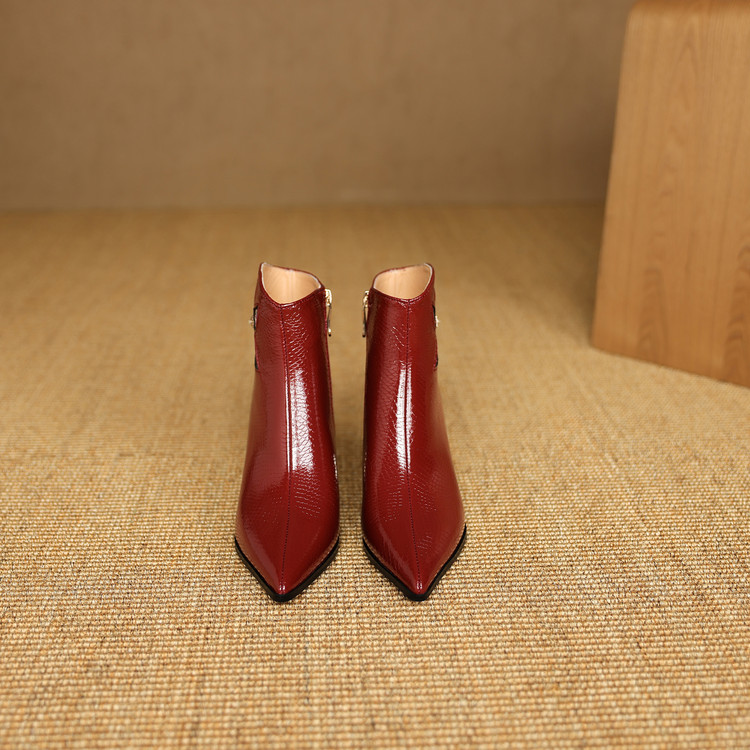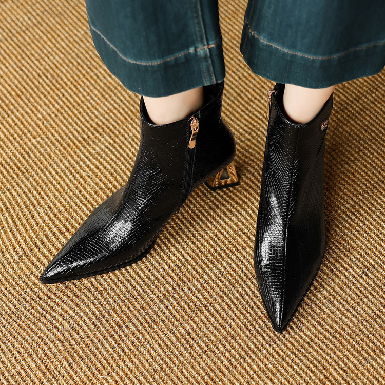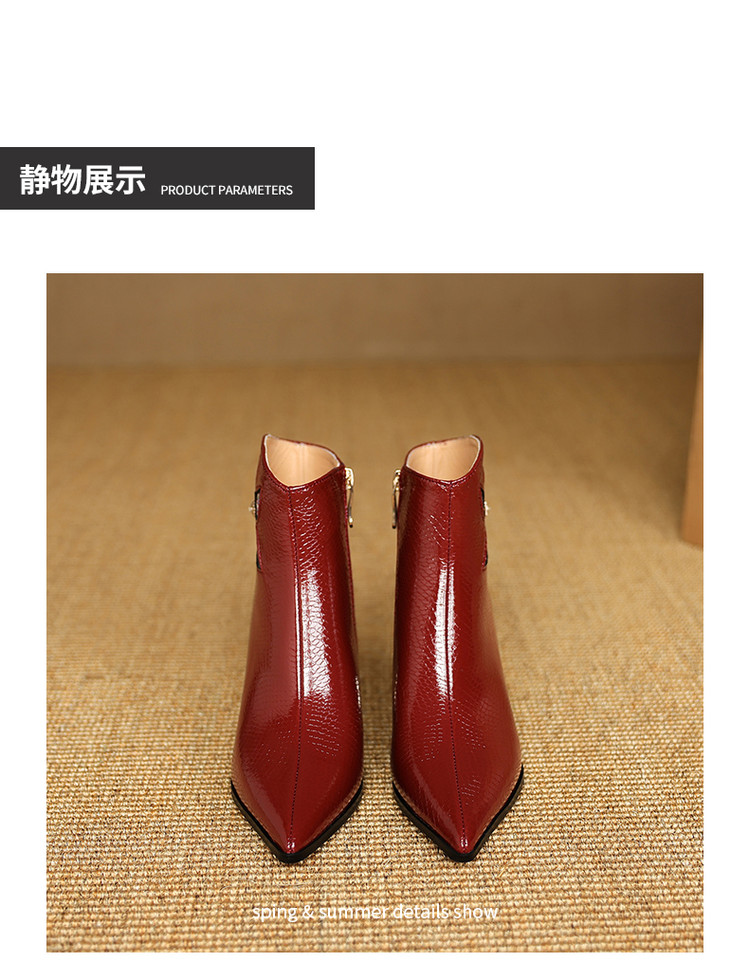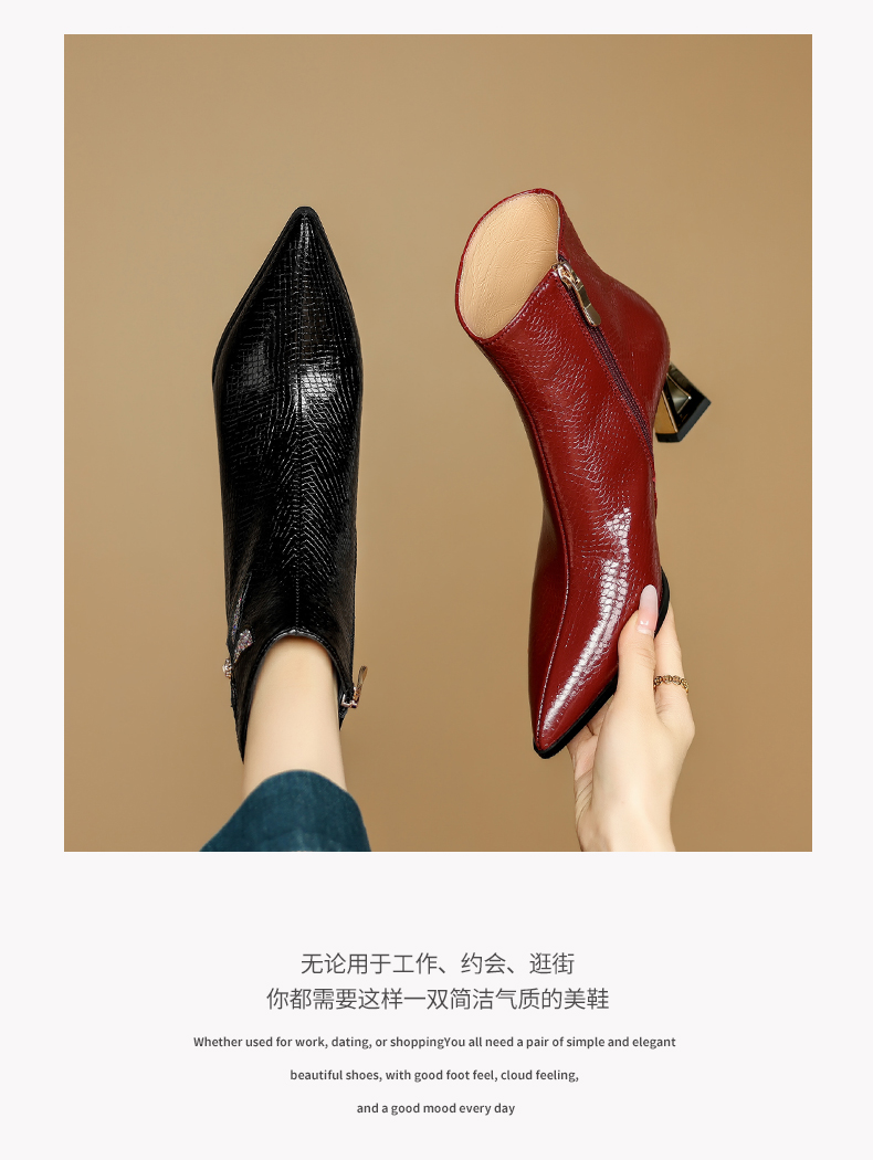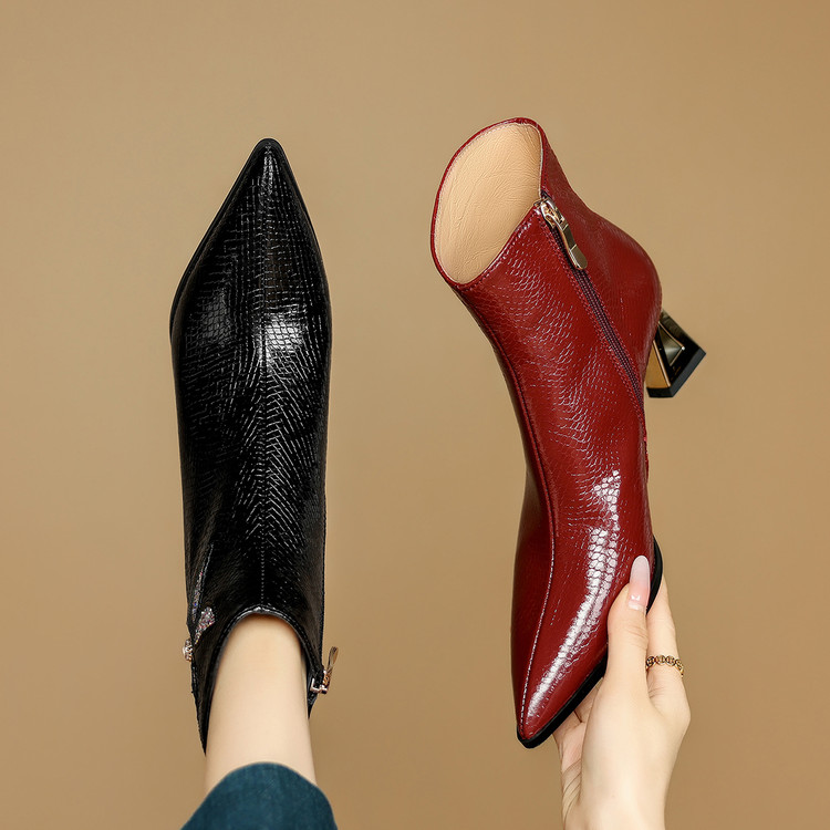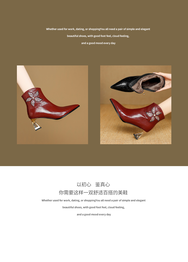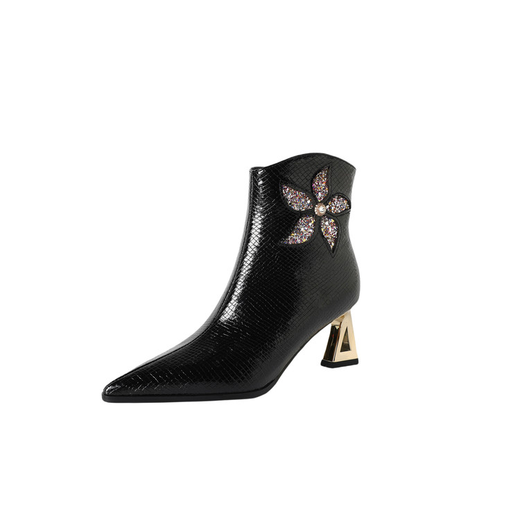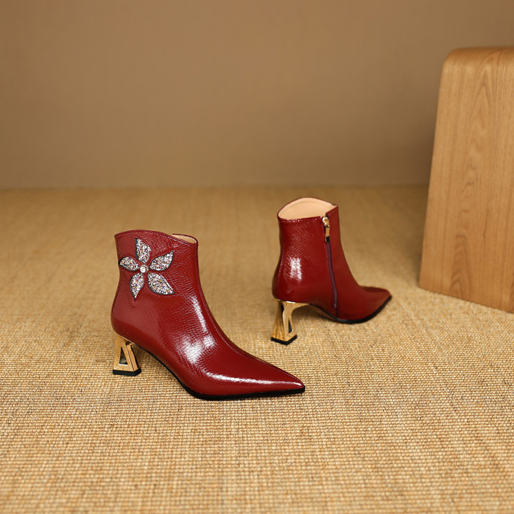 【预售5天】春秋单靴子女真皮尖头花朵水钻高跟皮靴冬季短靴粗跟及踝靴子DB&M6615