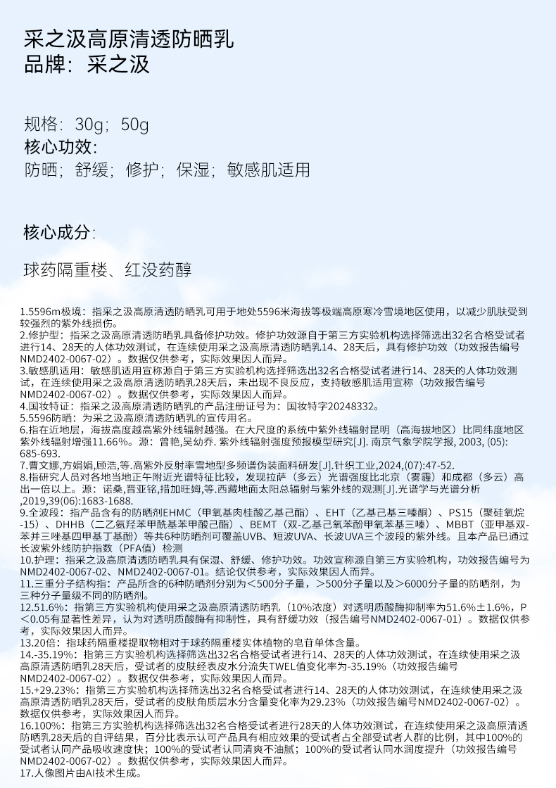【官方正品】云南白药采之汲高原清透防晒乳SPF50 PA+++面部防晒隔离敏感肌修护