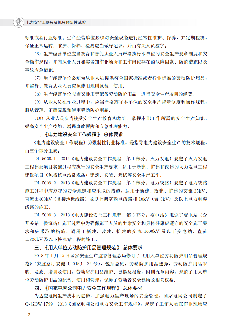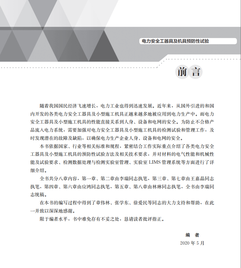 为了规范和完善电力安全工器具及小型施工机具预防性试验,科学、严谨地开展预防性试验工作,作者结合电力安全生产的需要,以国家、行业等标准规范为依据,以确保电力安全工器具与小型施工机具的试验质量和在使用中的安全可靠及保障人身安全、设备安全和电网安全为出发点,结合现场工作情况编制了本书。
