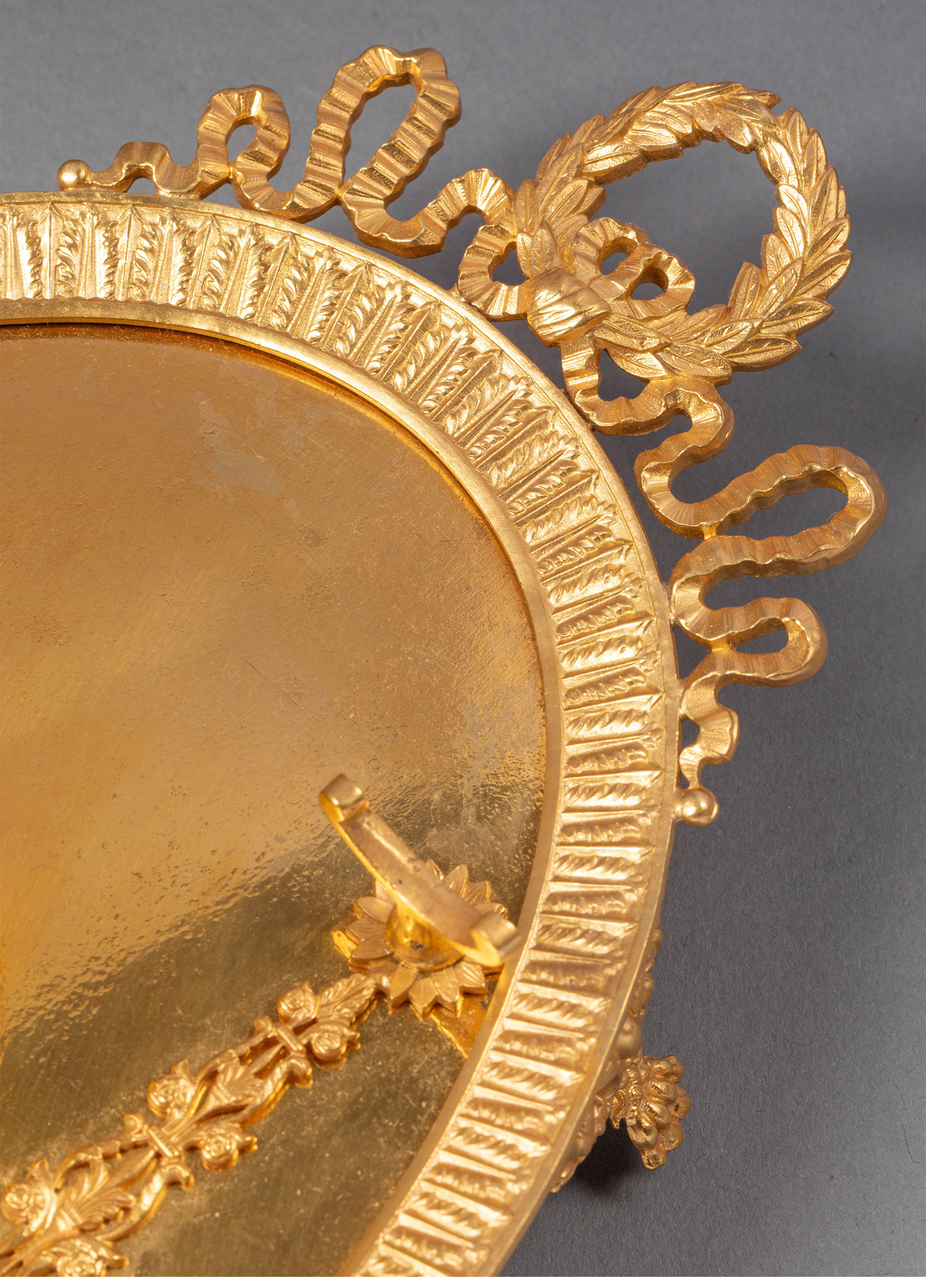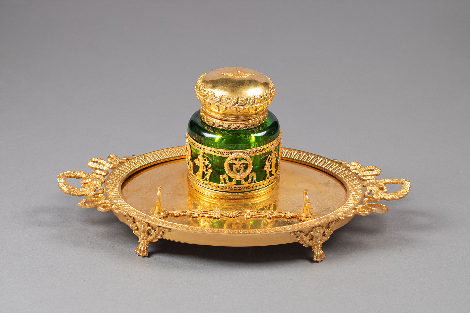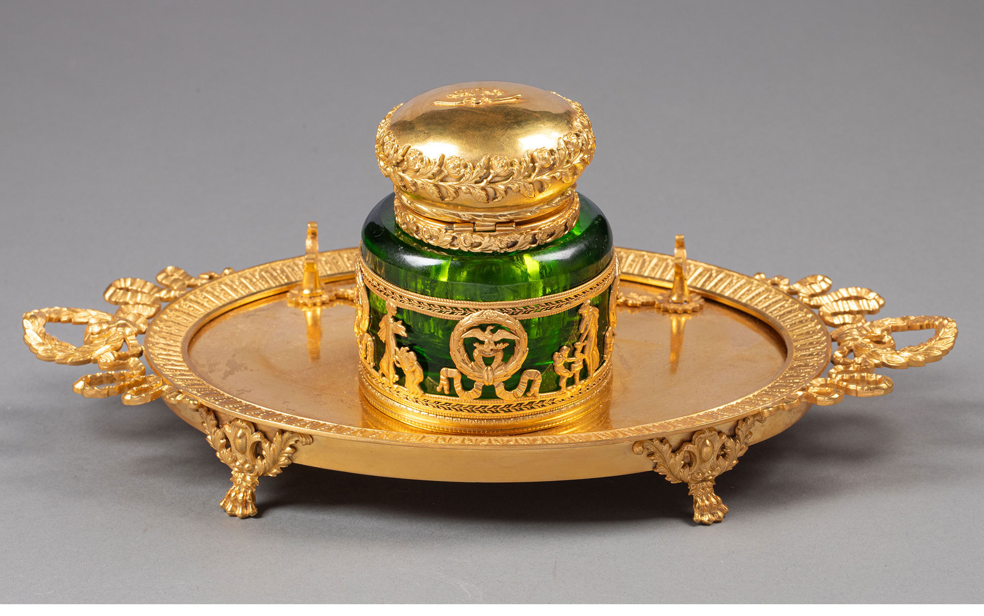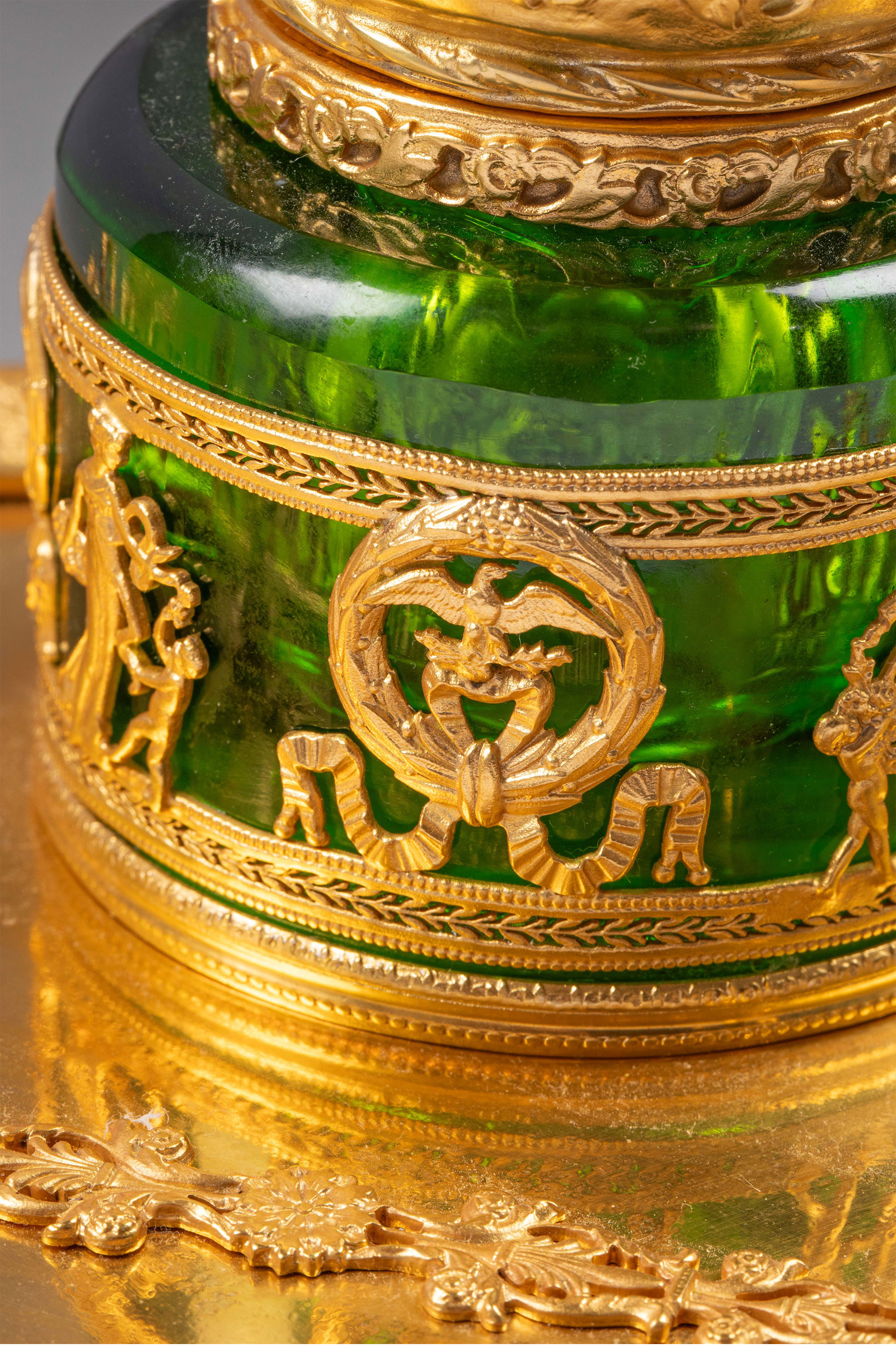 19世纪末法国出品帝政风格铜鎏金精雕镶嵌绿水晶墨水台