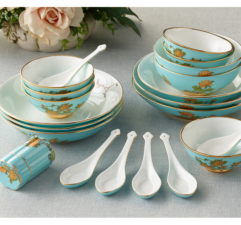 【国瓷·永丰源】夫人瓷西湖蓝22头家用套装 碗盘碟勺中式餐具