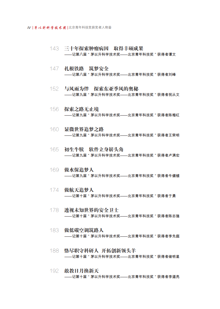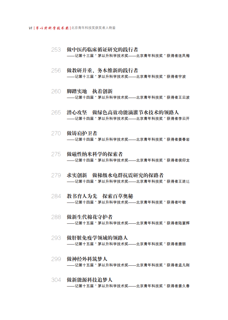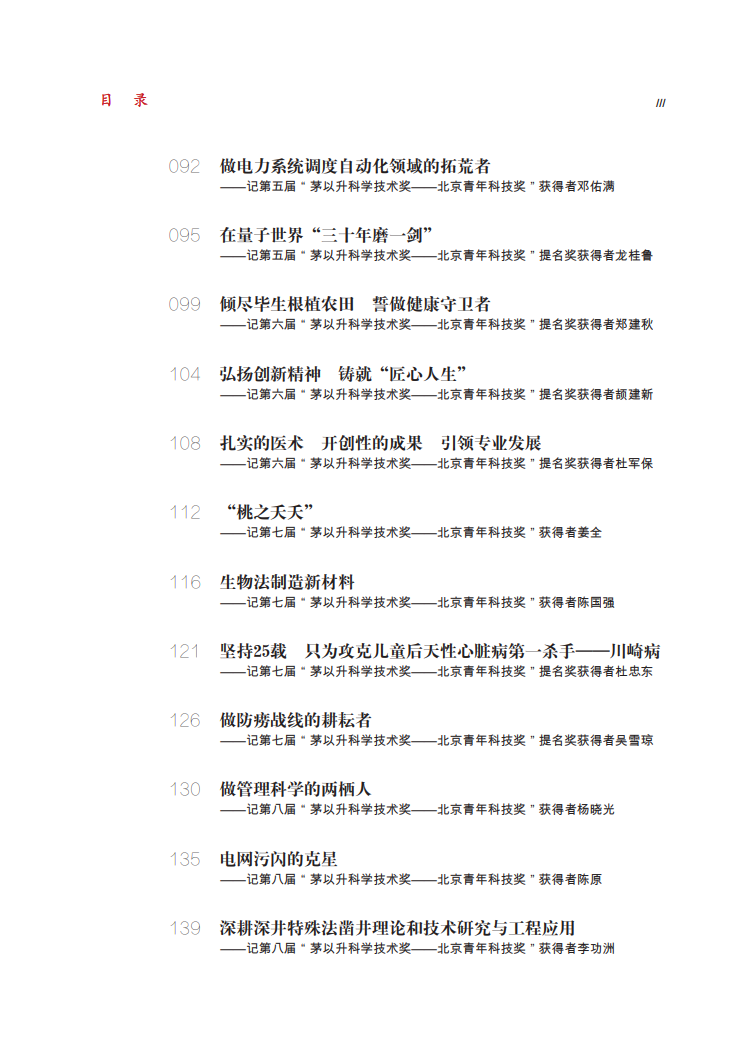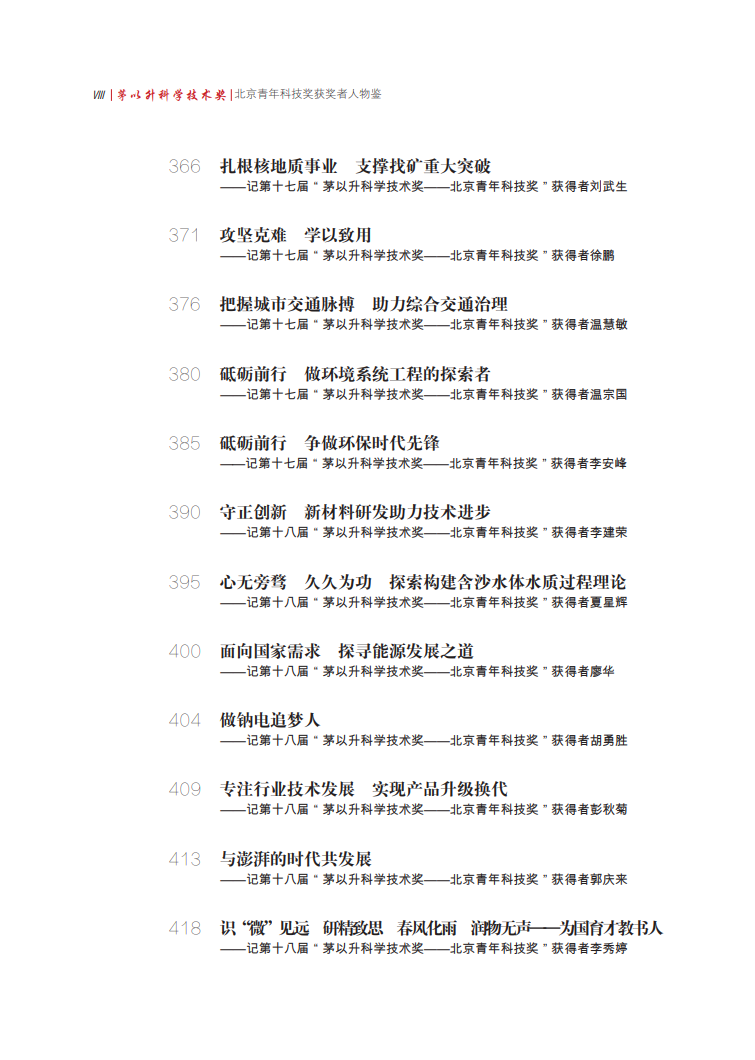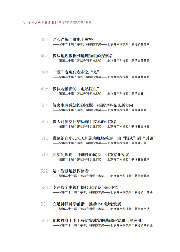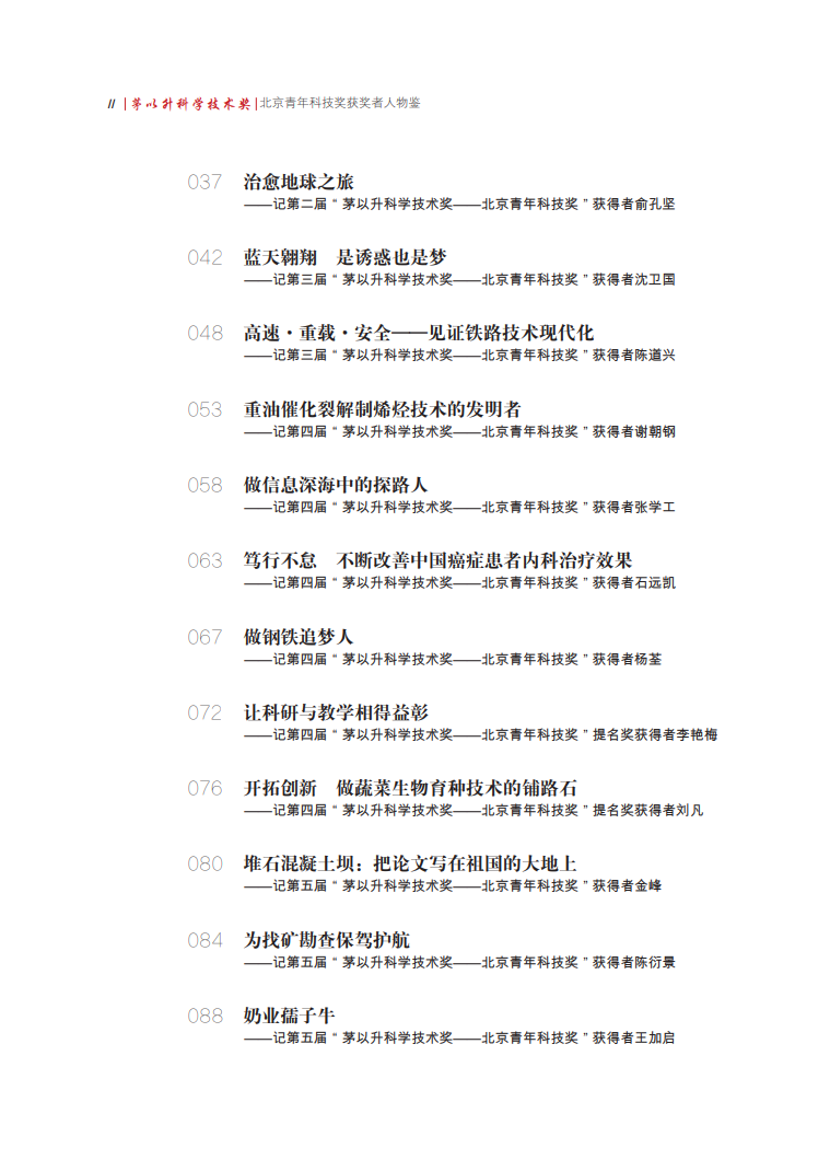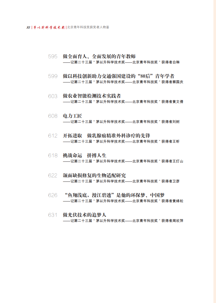 “茅以升科学技术奖——北京青年科技奖”是由北京茅以升科技教育基金会和北京市科学技术协会共同设立的,奖项涉及理、工、农、医四大学科领域。该奖旨力求促进北京地区的青年科技人才脱颖而出、健康成长,有着较高的影响力和认可度。为充分发挥先进典型示范引领作用,特推出此书,将历届获奖者的成长历程和在相关专业领域取得的杰出成就展现给广大读者。