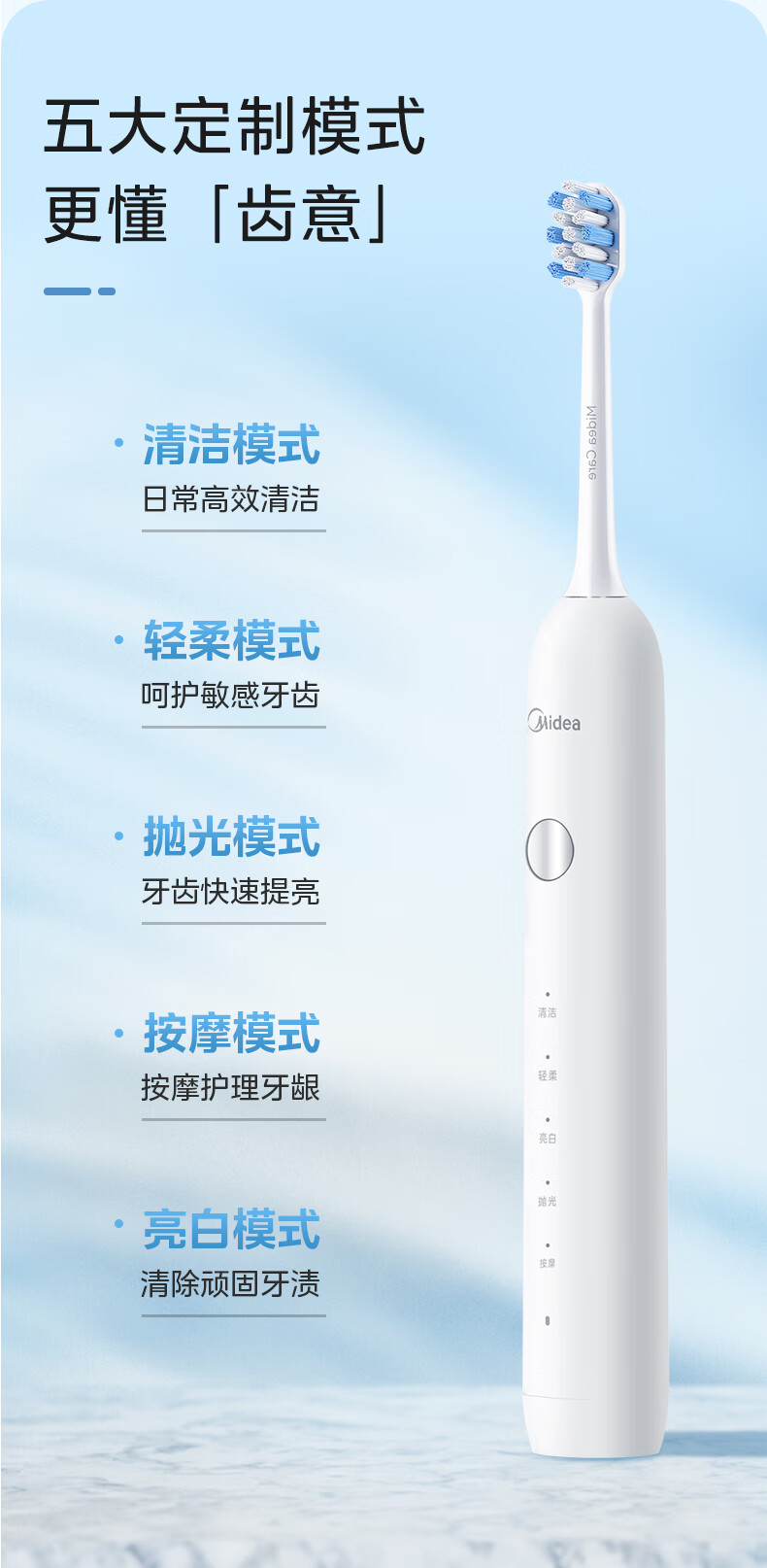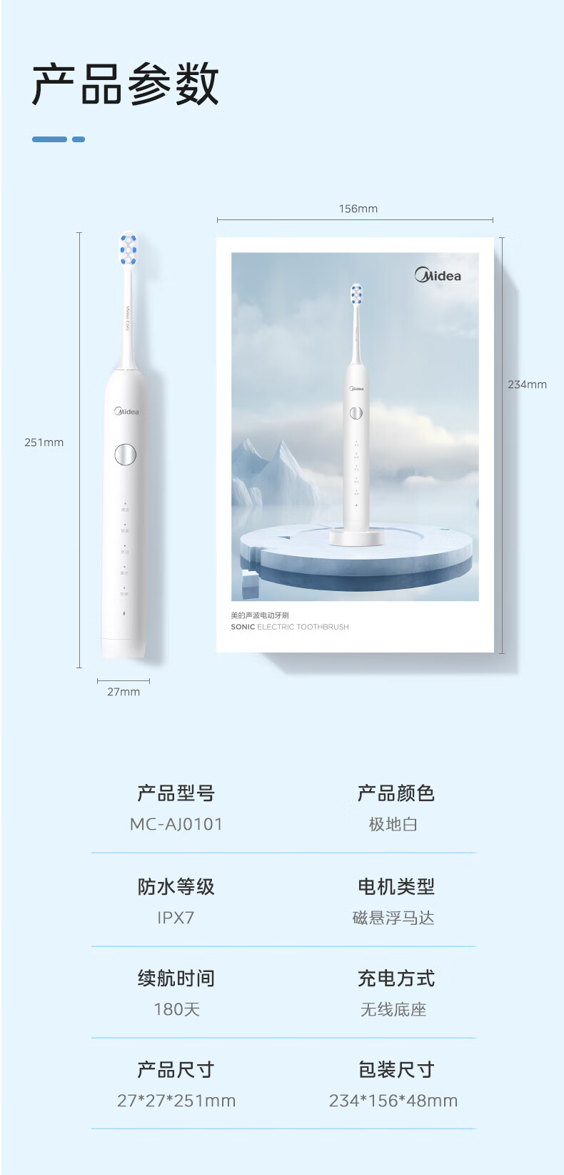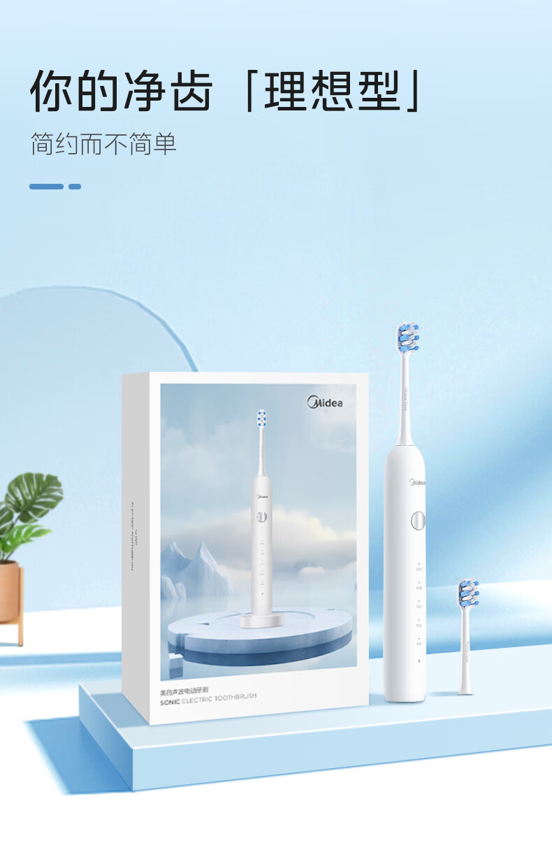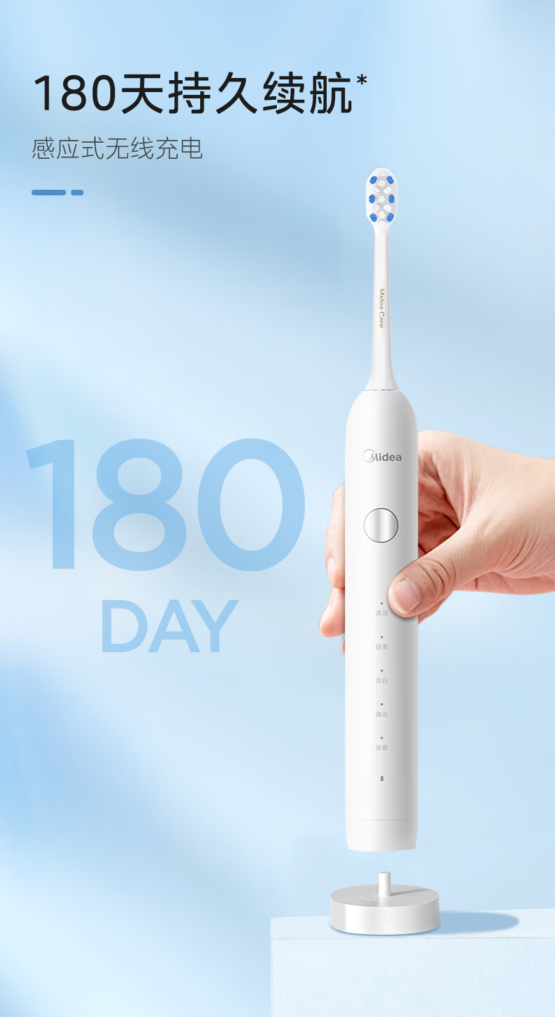 美的(Midea) MC-AJ0101 电动牙刷男女成人软毛声波全自动送礼物 防水感应式充电 2刷头 MR1系列冰川白