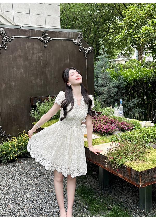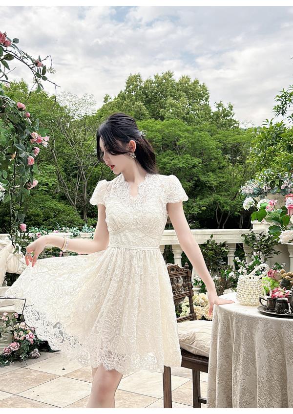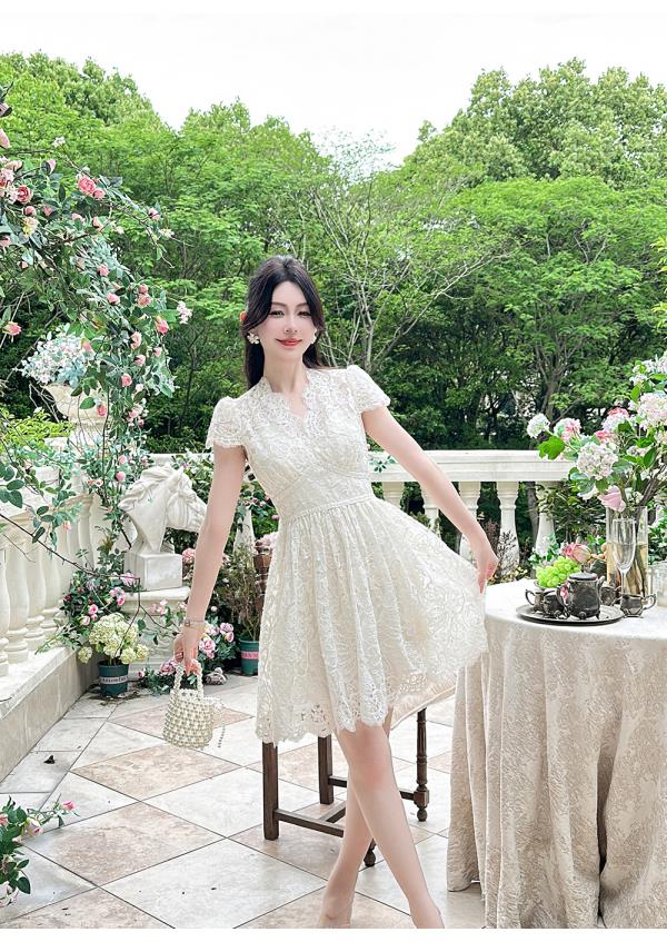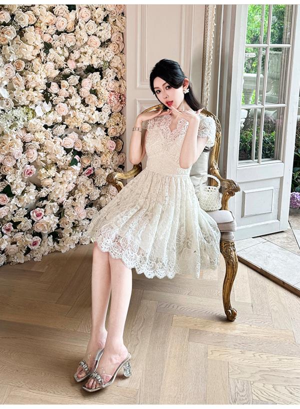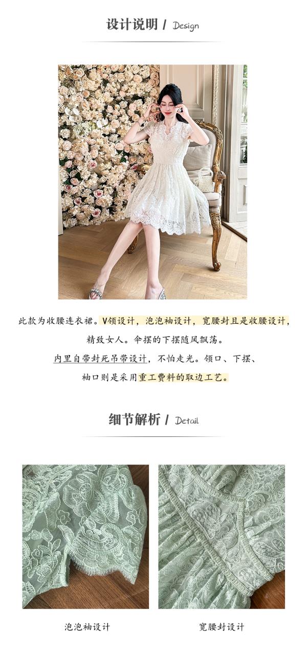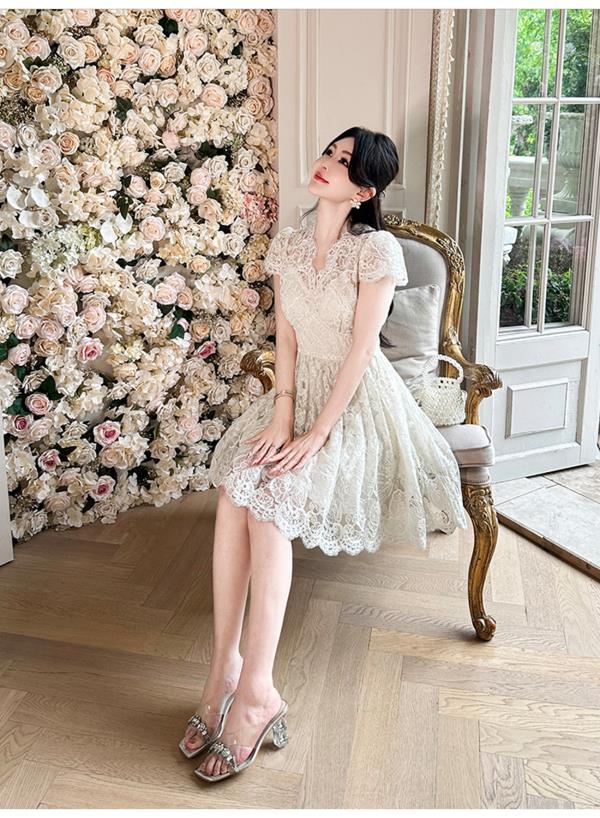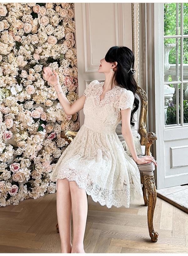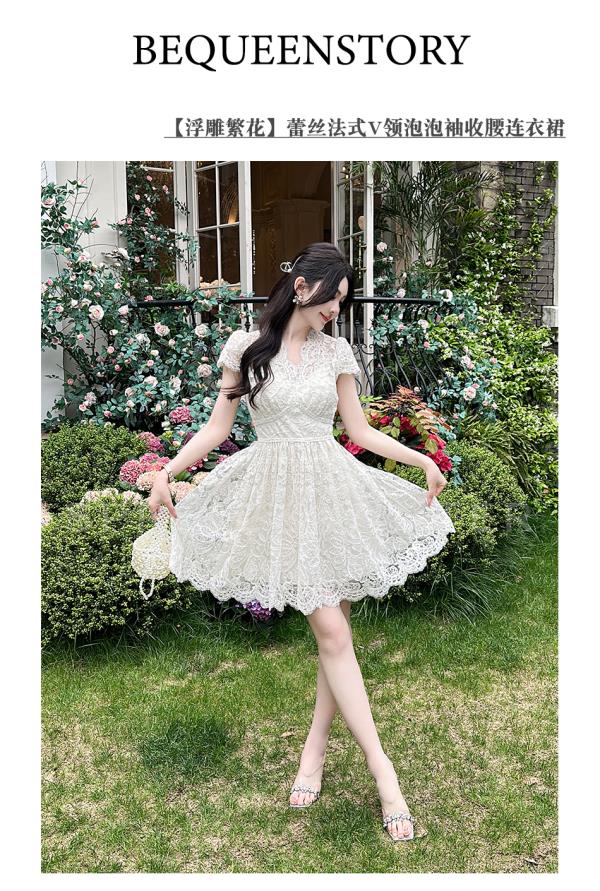 BeQueenStory【浮雕繁花】镂空股线蕾丝法式宫廷风V领收腰连衣裙