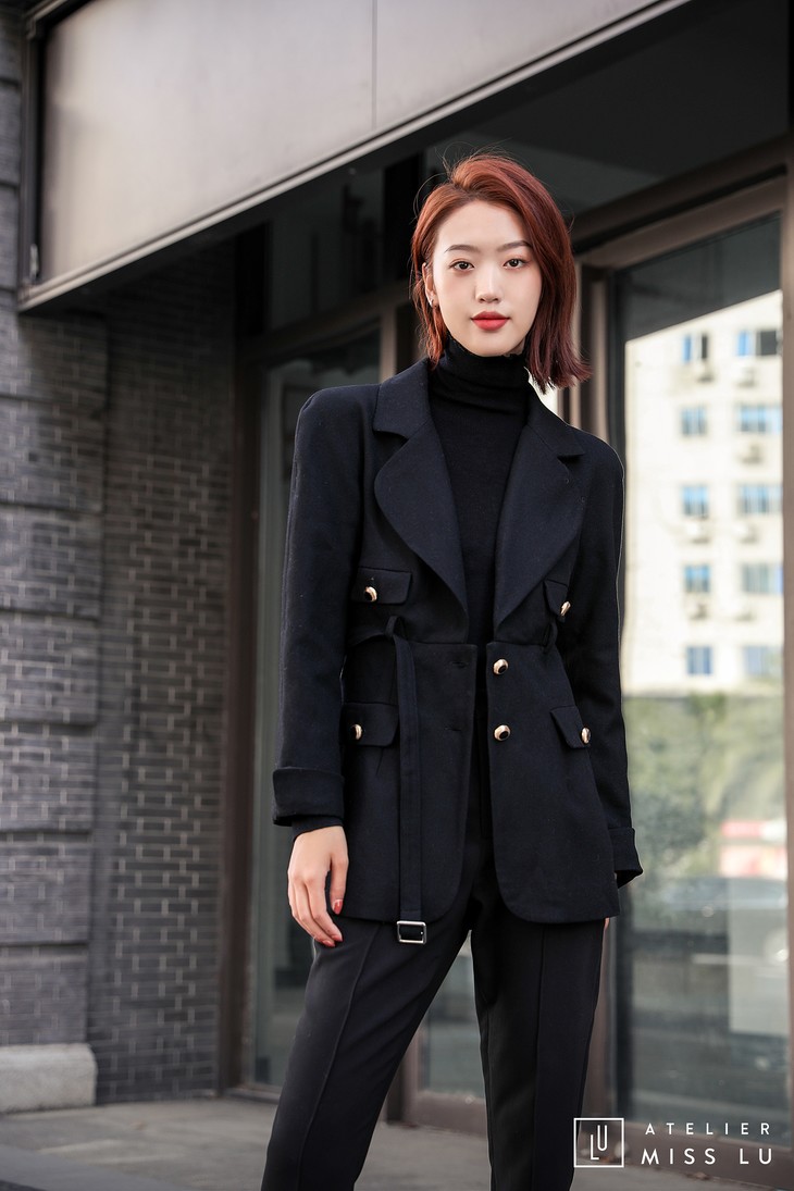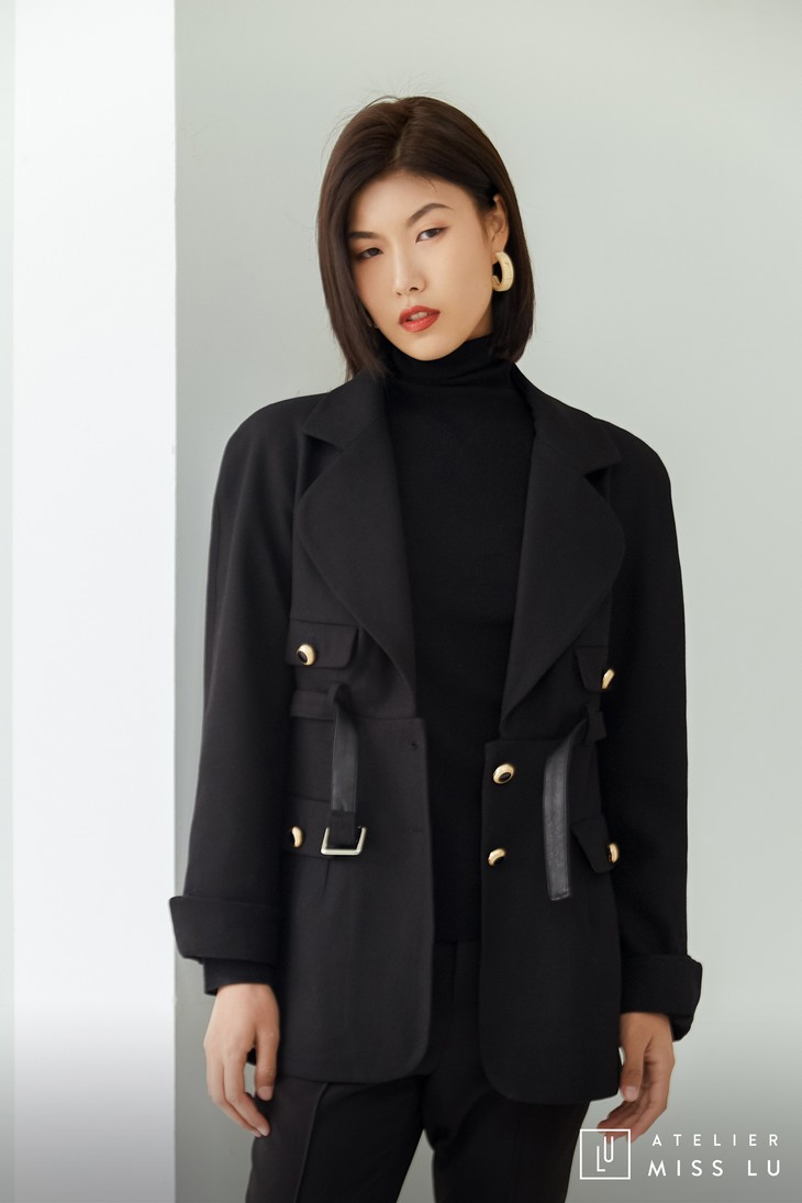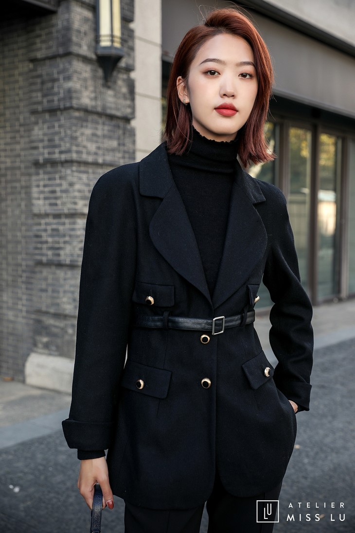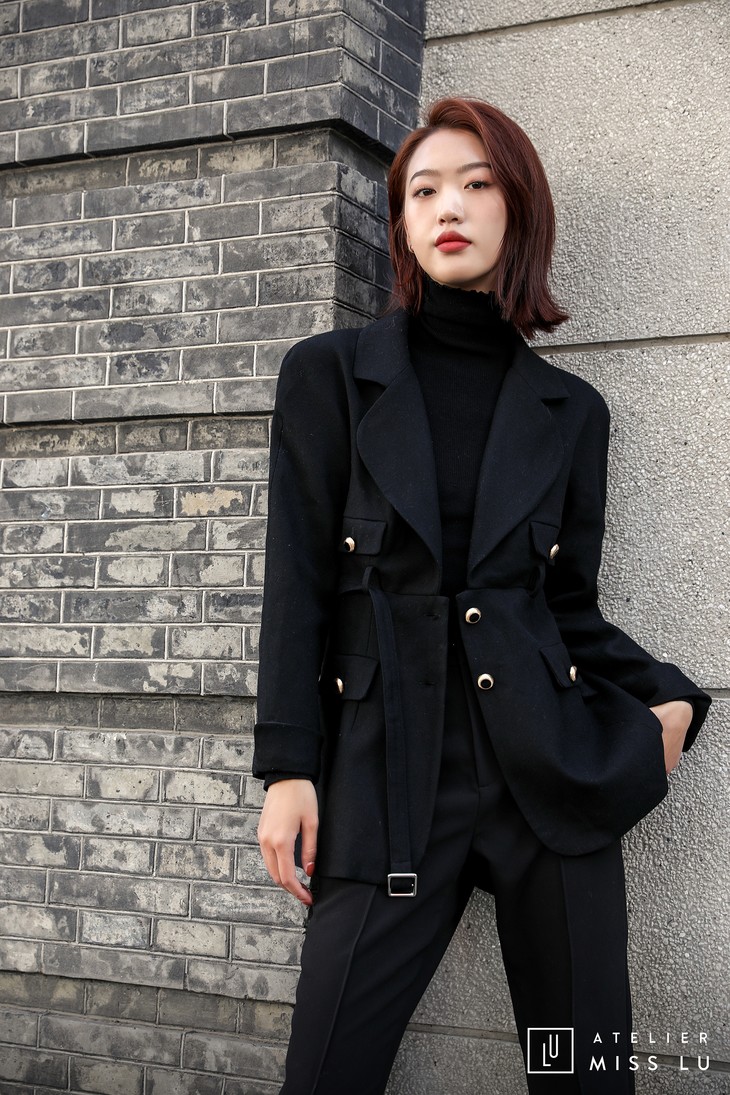 腰部的皮带设计,在收紧腰身的同时也摆脱了无聊,更显俏皮。而金属质感的纽扣,更是打破了黑色带来的沉闷。