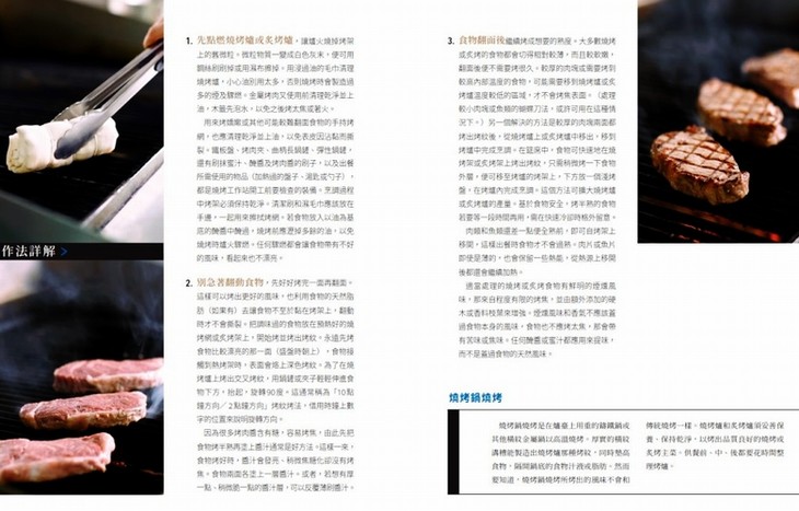 全書1224頁,分七大部共36個章節,從何謂專業烹飪、辨識工具與食材、高湯醬汁的至作、各類食材的烹調,一直到冷盤、烘焙與甜點,舉凡肉類蔬菜的分切部位規格,到各式高低溫烹煮的定義與狀態等等,皆以循序漸進的邏輯、具體圖文呈現應有的標準與範圍,讓所有人都有明確標準可以依循。