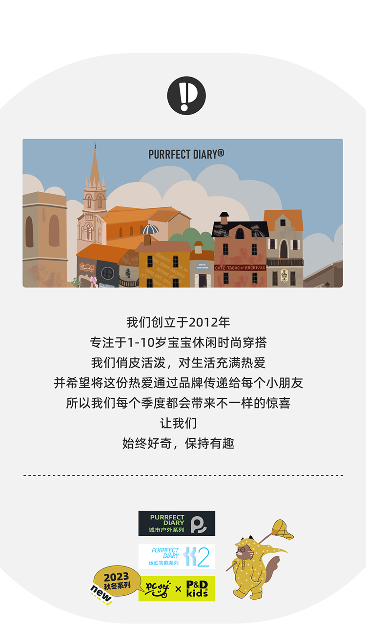 - Purrfect-Diary专注于贴近自然随性的穿着概念,轻奢平价的童装文化传播,在产品设计上更加注重婴童穿着的舒适性、安全性、更出众的国际化品牌,将欧美的育婴文化在中国进行深入的传播与推广。
