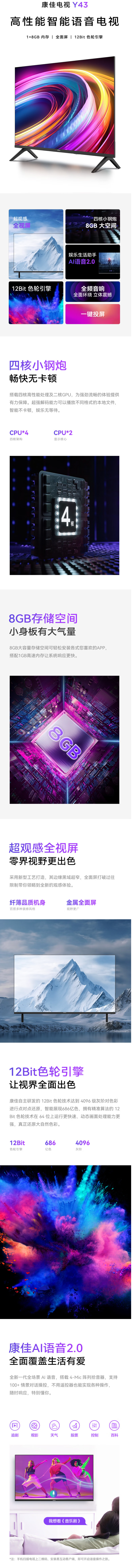 康佳电视 Y43 43英寸 1+8GB内存 全面屏 网络WIFI 平板全高清液晶