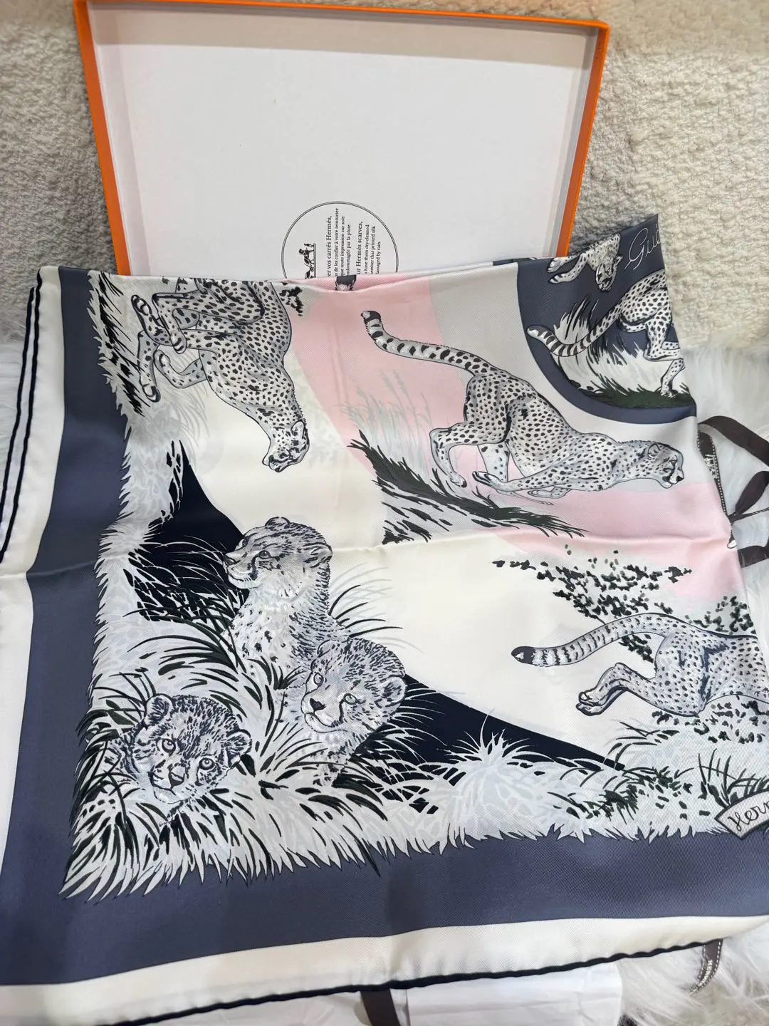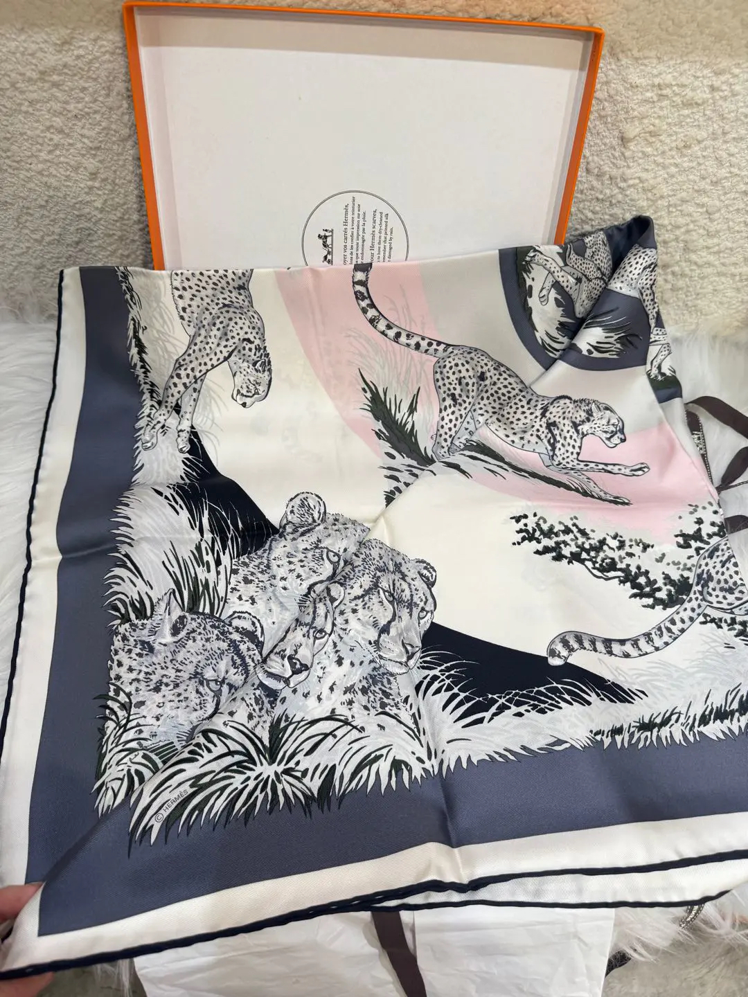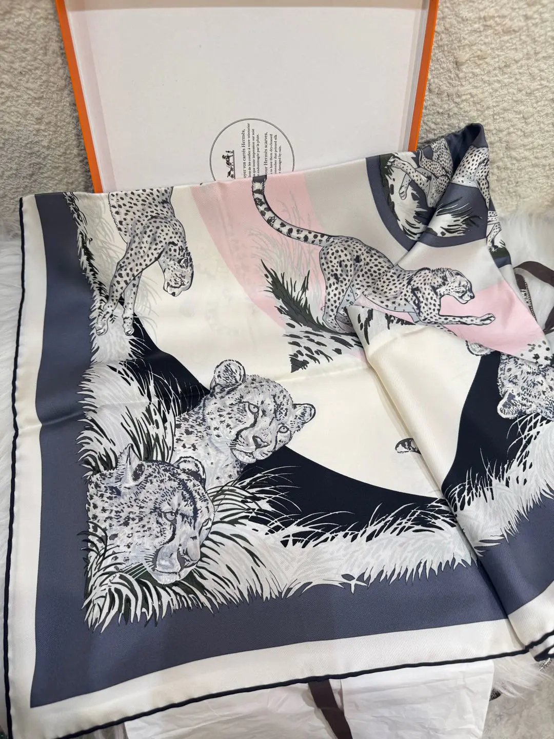 【商品详情】正品二手 爱马仕 猎豹印花 粉灰黑色 丝绸 丝巾🫢99新 90*90 配件:盒子。真丝材质,触感柔滑。