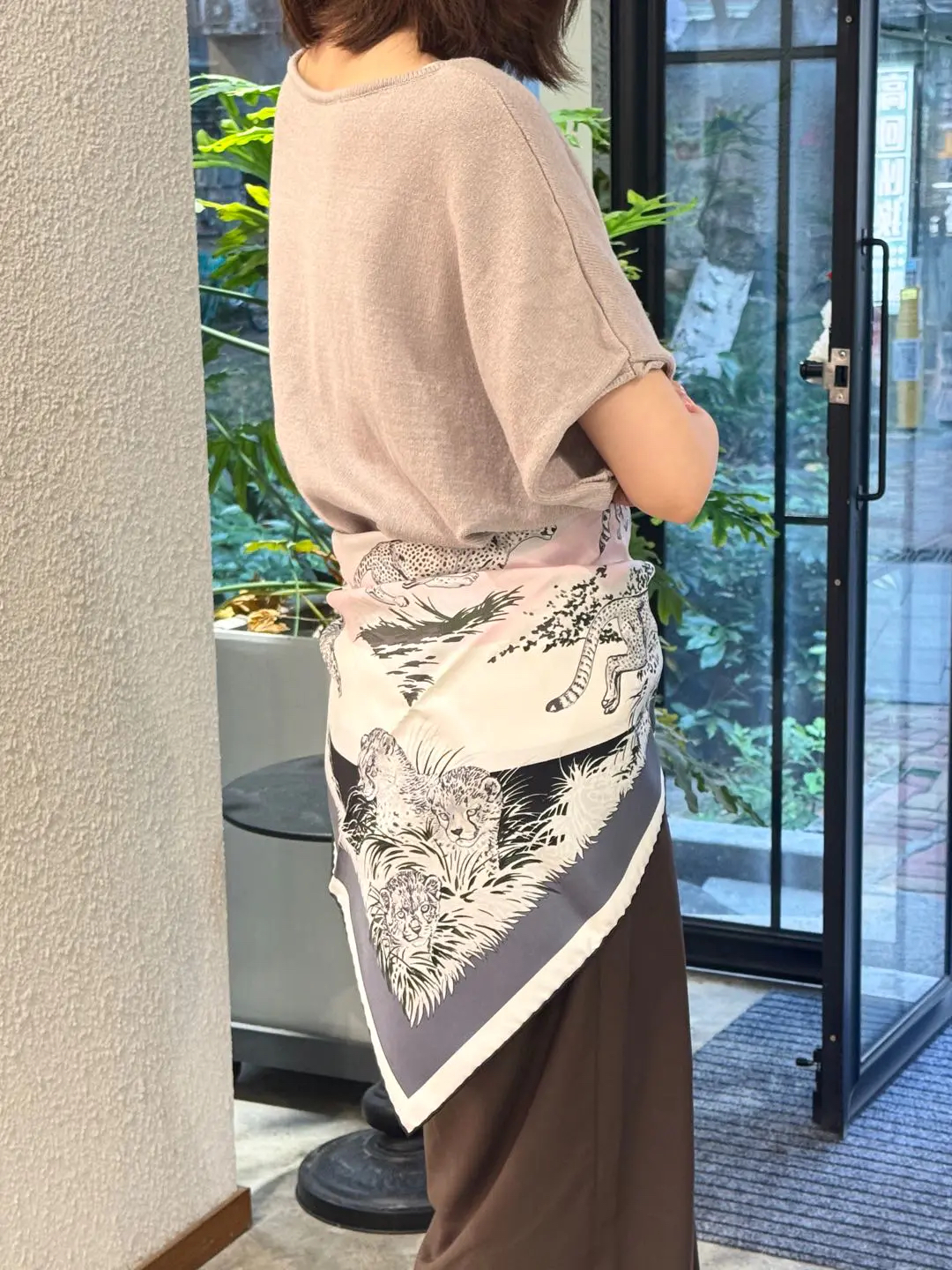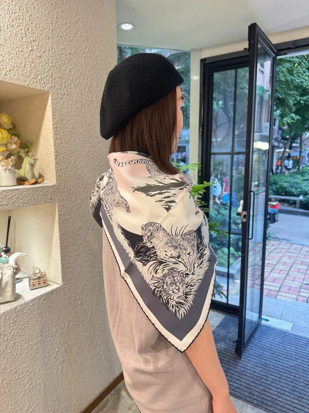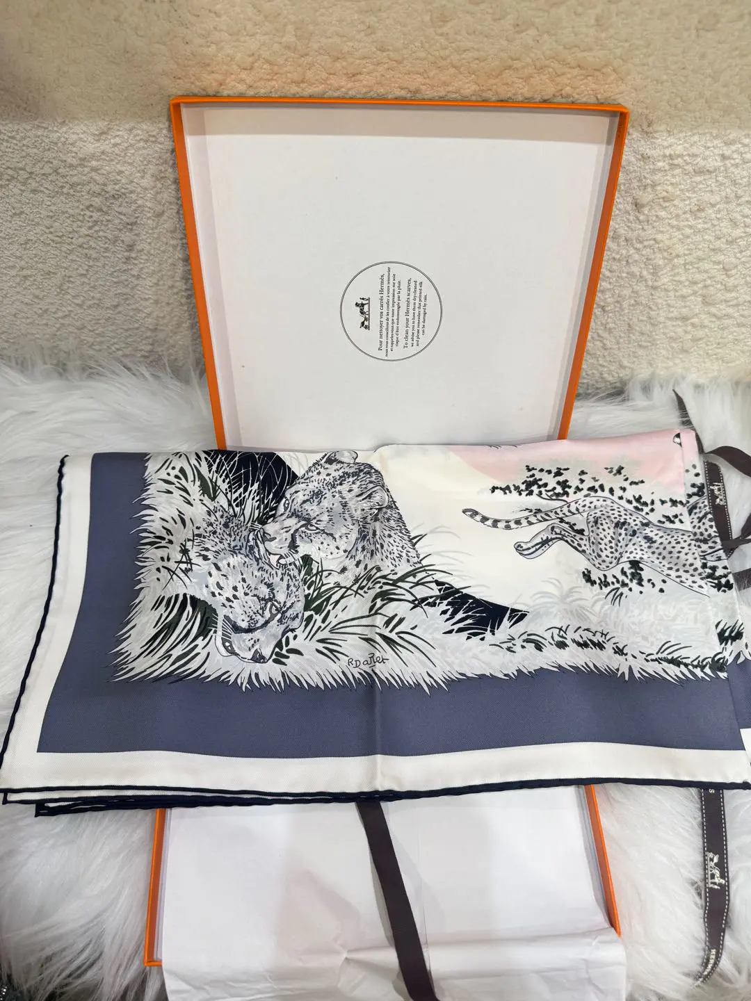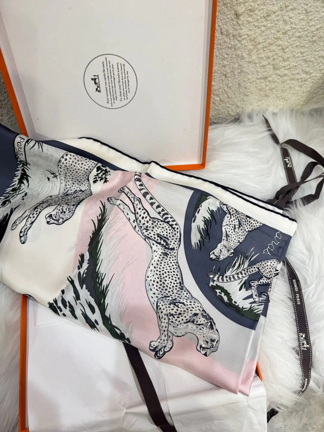 【商品详情】正品二手 爱马仕 猎豹印花 粉灰黑色 丝绸 丝巾🫢99新 90*90 配件:盒子。真丝材质,触感柔滑。