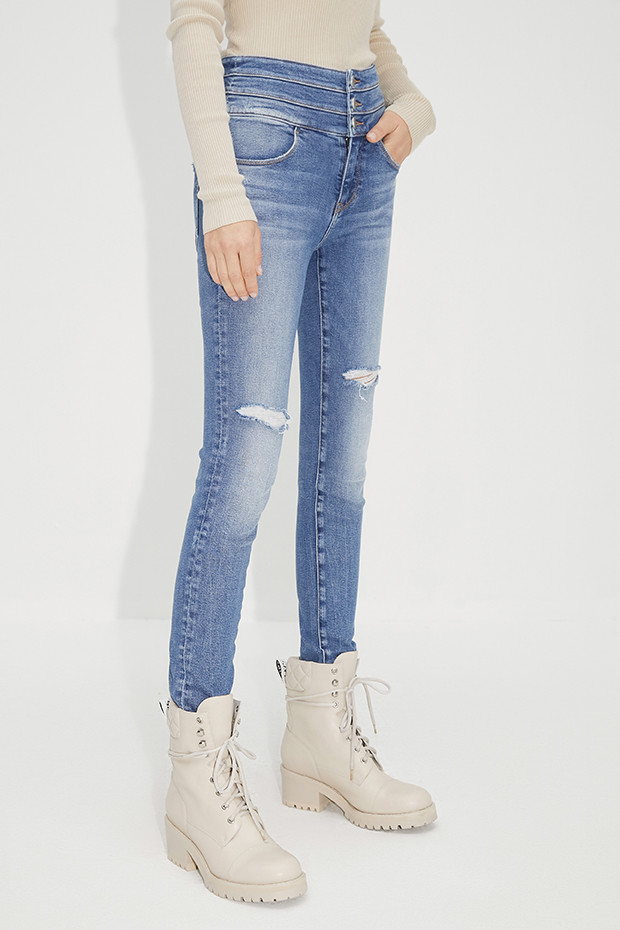 紧身九分裤脚结合些许磨破细节,更添随性潮流气息