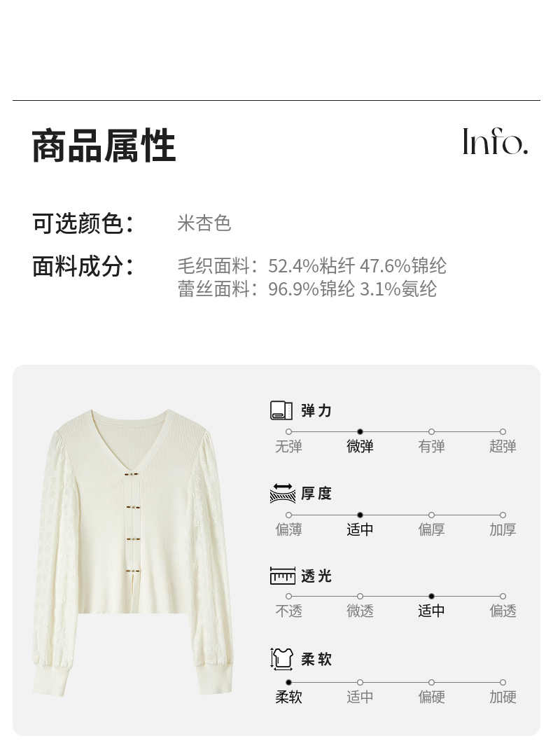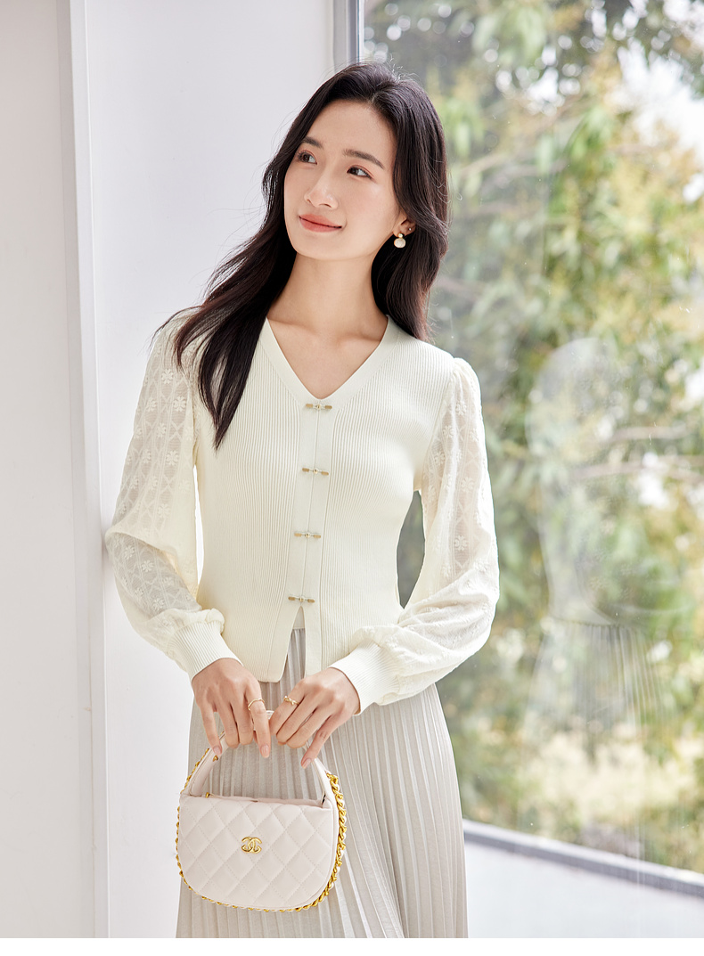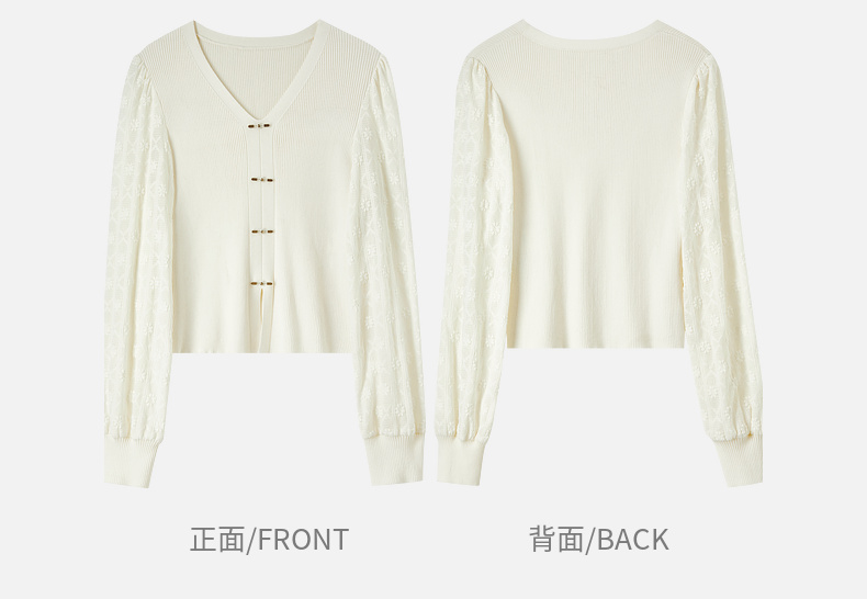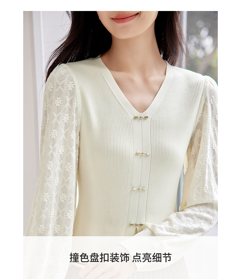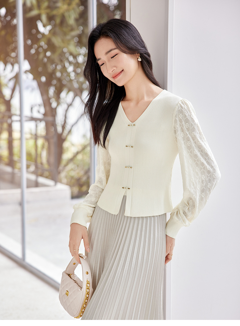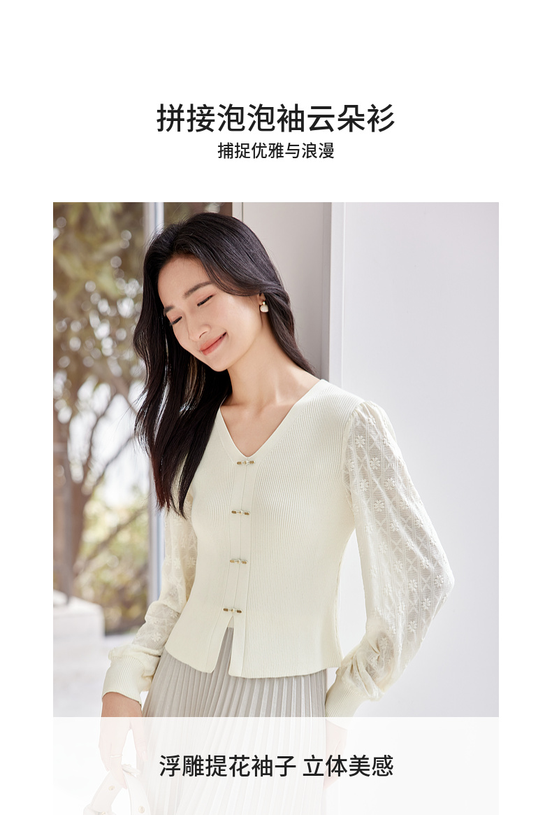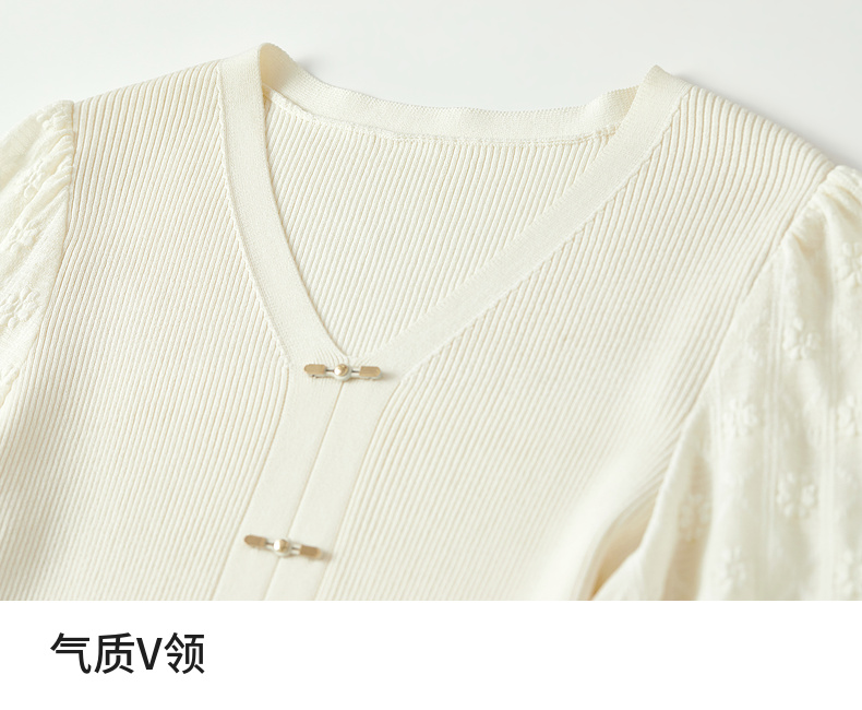 【内购】【浮雕提花】优雅通勤V领撞色盘扣拼接浮雕提花泡泡袖修身针织衫-W51H80346