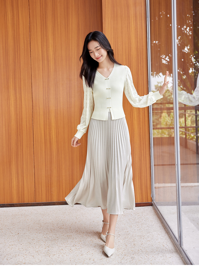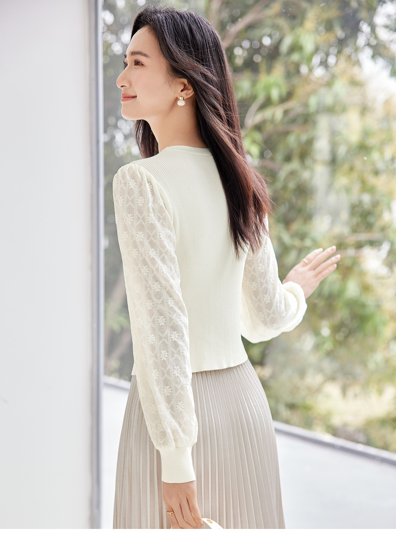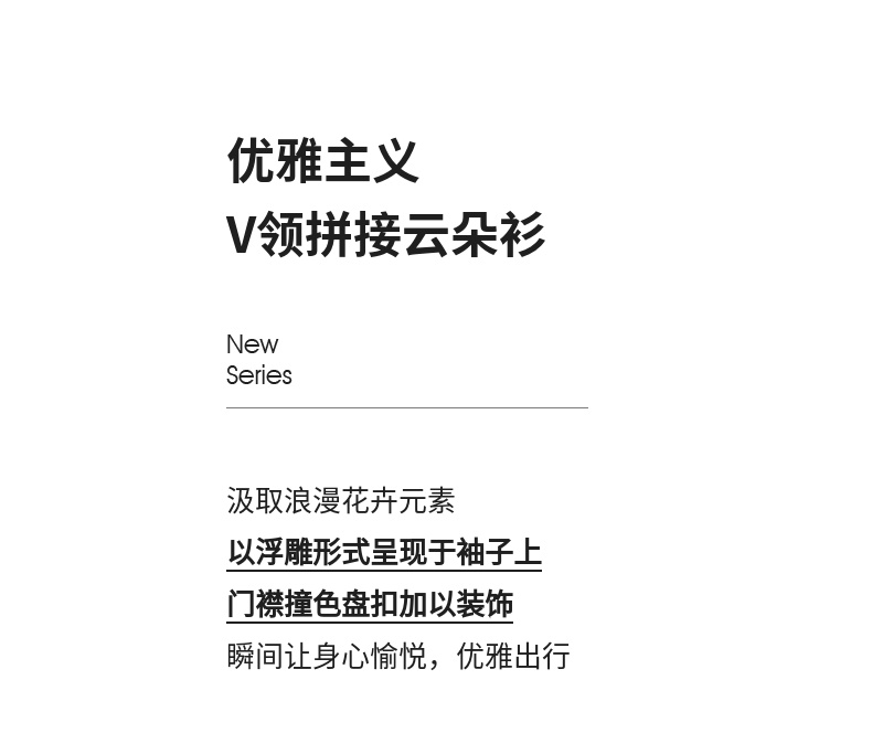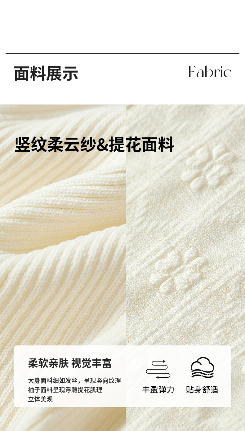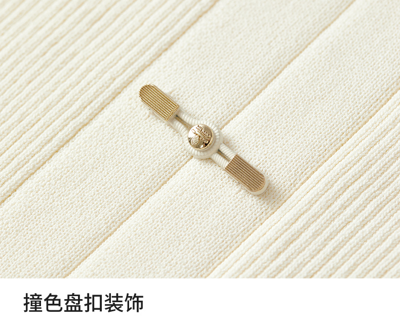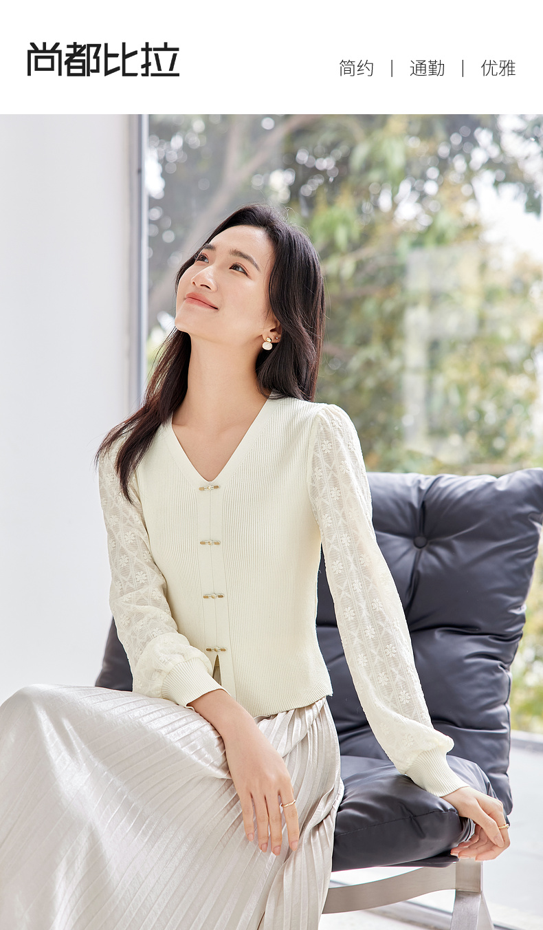 【内购】【浮雕提花】优雅通勤V领撞色盘扣拼接浮雕提花泡泡袖修身针织衫-W51H80346