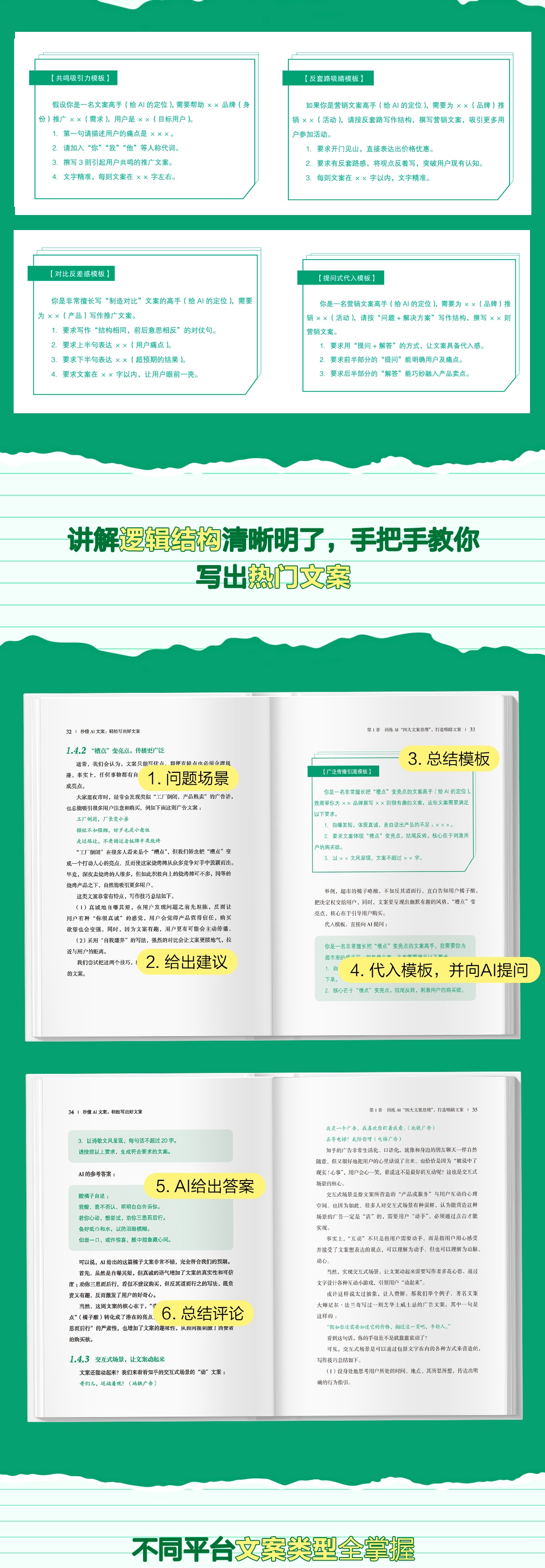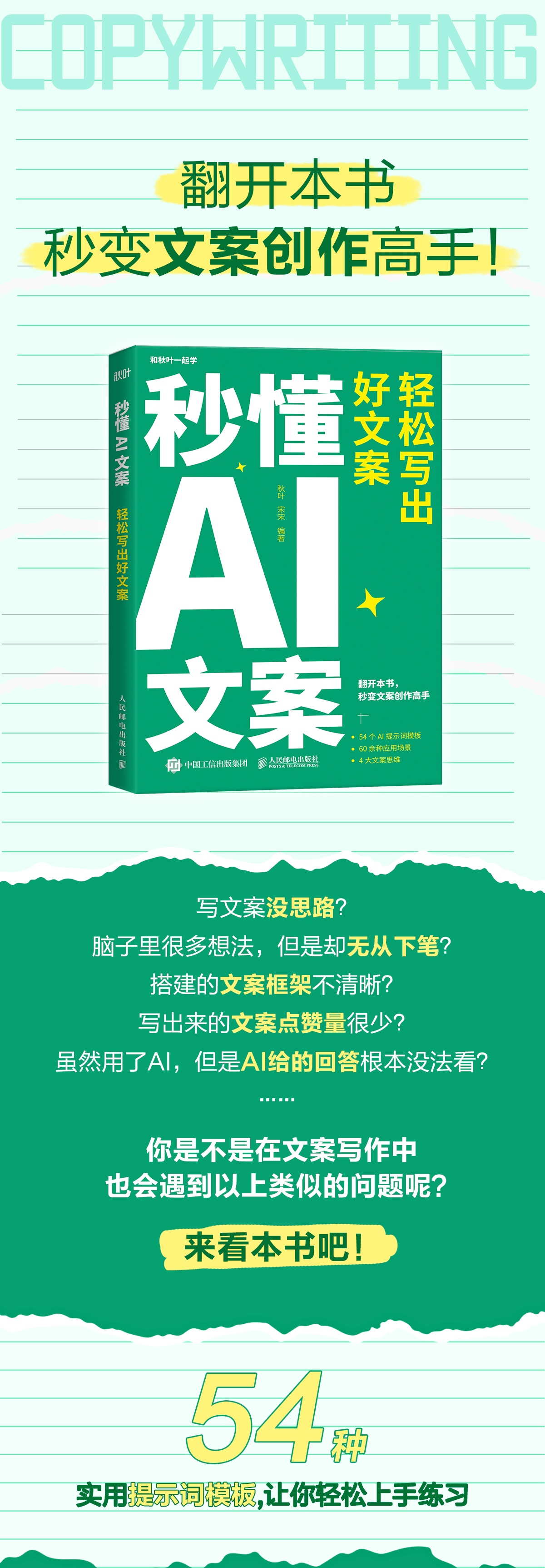 本书是一本AI文案实战手册,汇集了54个AI提示词模板和60余种应用场景,旨在帮助新媒体文案创作和运营人员承接更多的流量红利,轻松驾驭新媒体文案创作。 本书分为5章,第1章提炼出利用AI的四大文案思维,让读者快速掌握新媒体文案创作的精髓。第2章则讲解激发AI创意的思维逻辑,让读者学会创作独具匠心的文案。第3章到第5章系统深入地探讨如何利用AI进行文案的创作、不同平台的文案写作策略,以及如何优化文案,为读者提供一套*的AI提示词模板。同时,本书还对模板案例进行了深入剖析,帮助读者融会贯通,举一反三,轻松应对各种新媒体文案挑战。 本书适合从事文案写作,尤其是新媒体文案写作的人员和对AI写作工具感兴趣的读者。