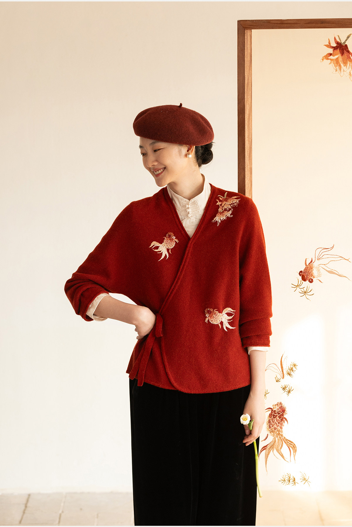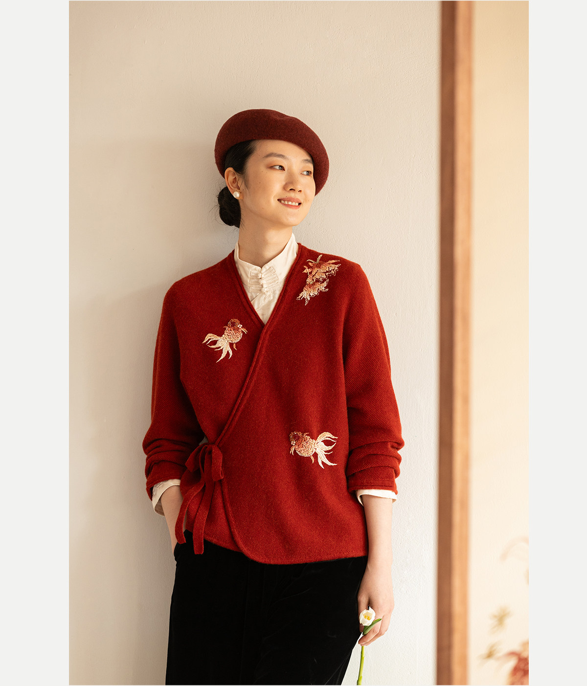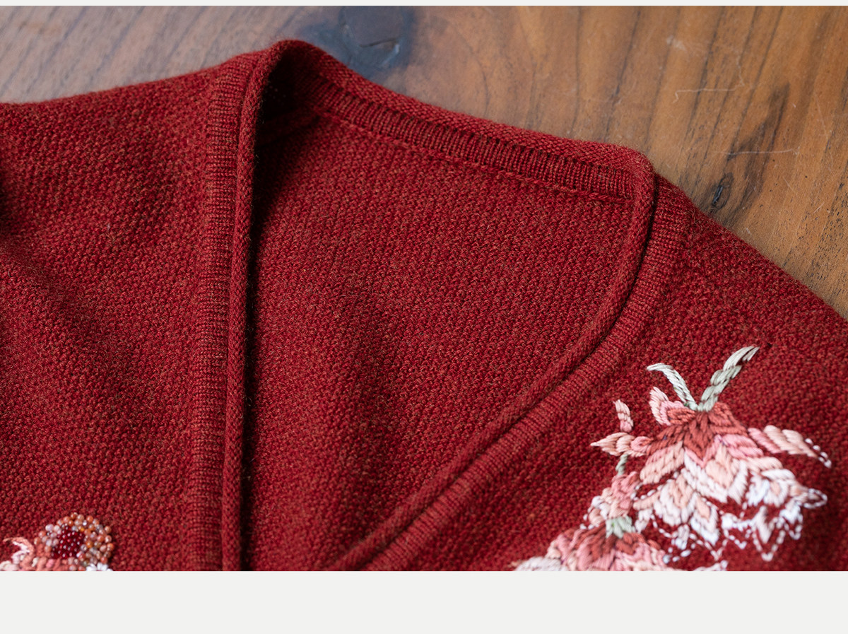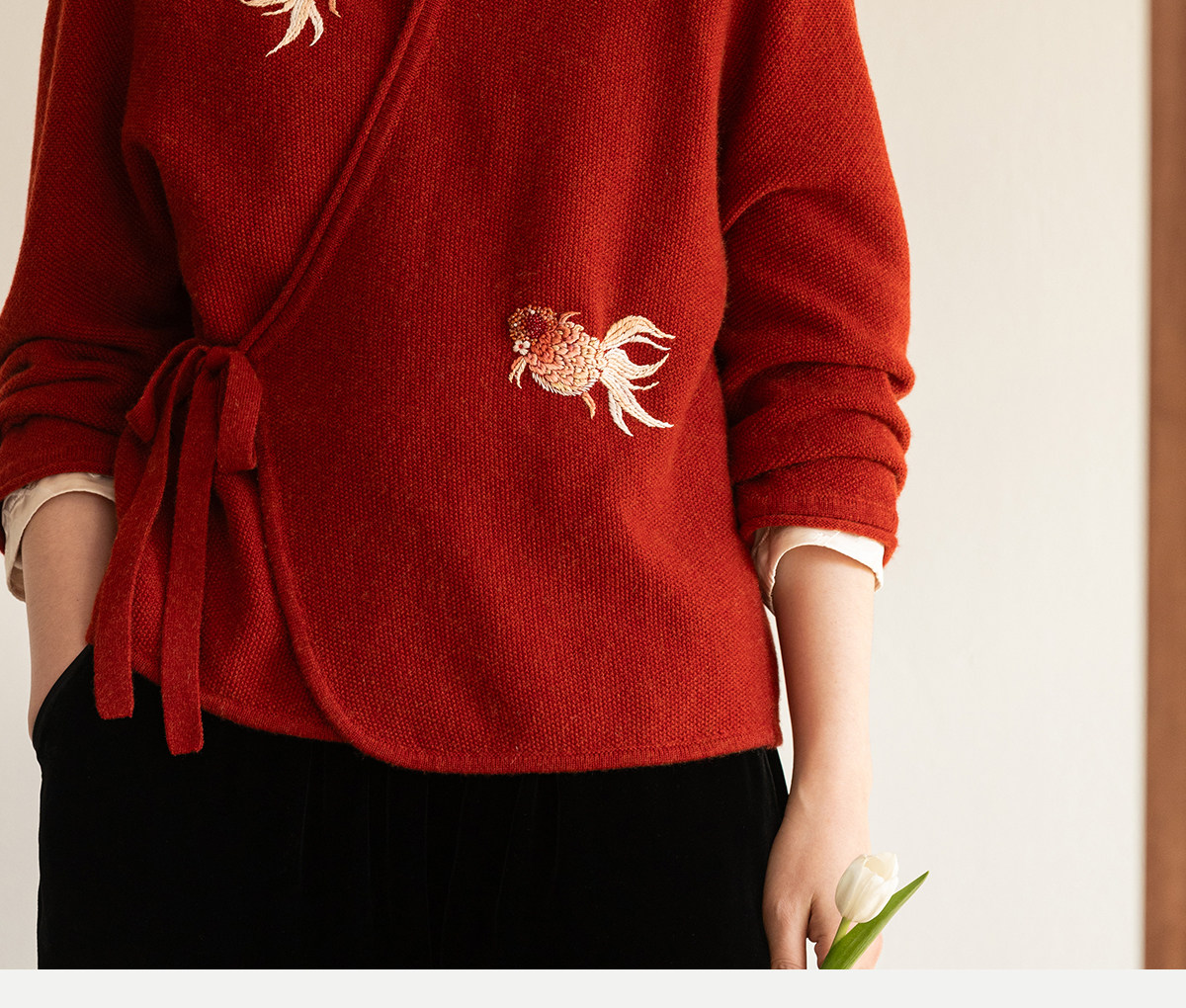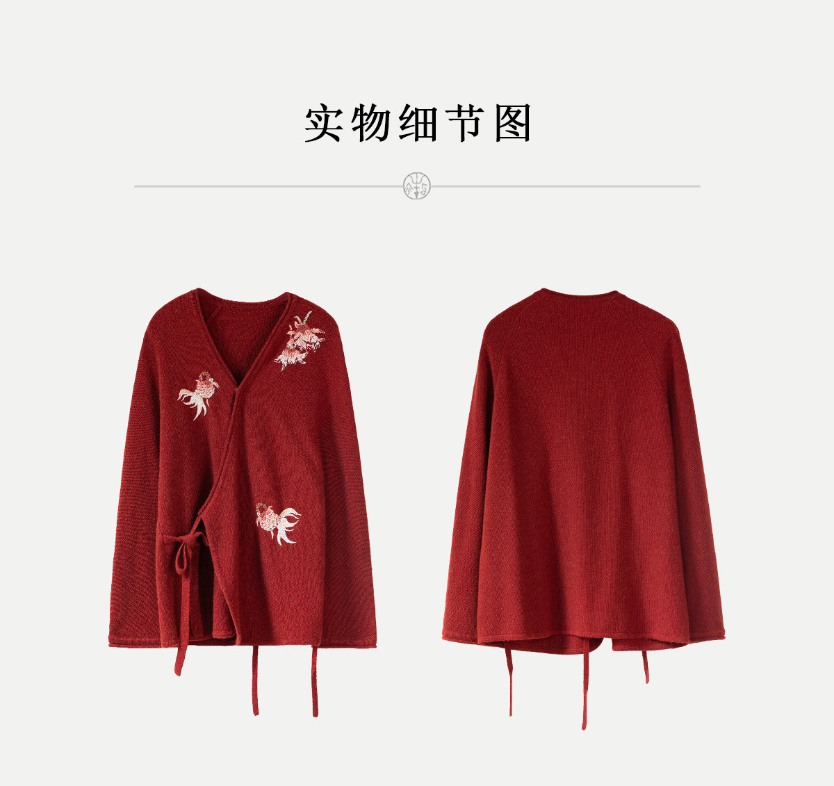 牧衣游原创 羊绒混织重工手绣毛织外套新年红色系带百搭开衫 音逸