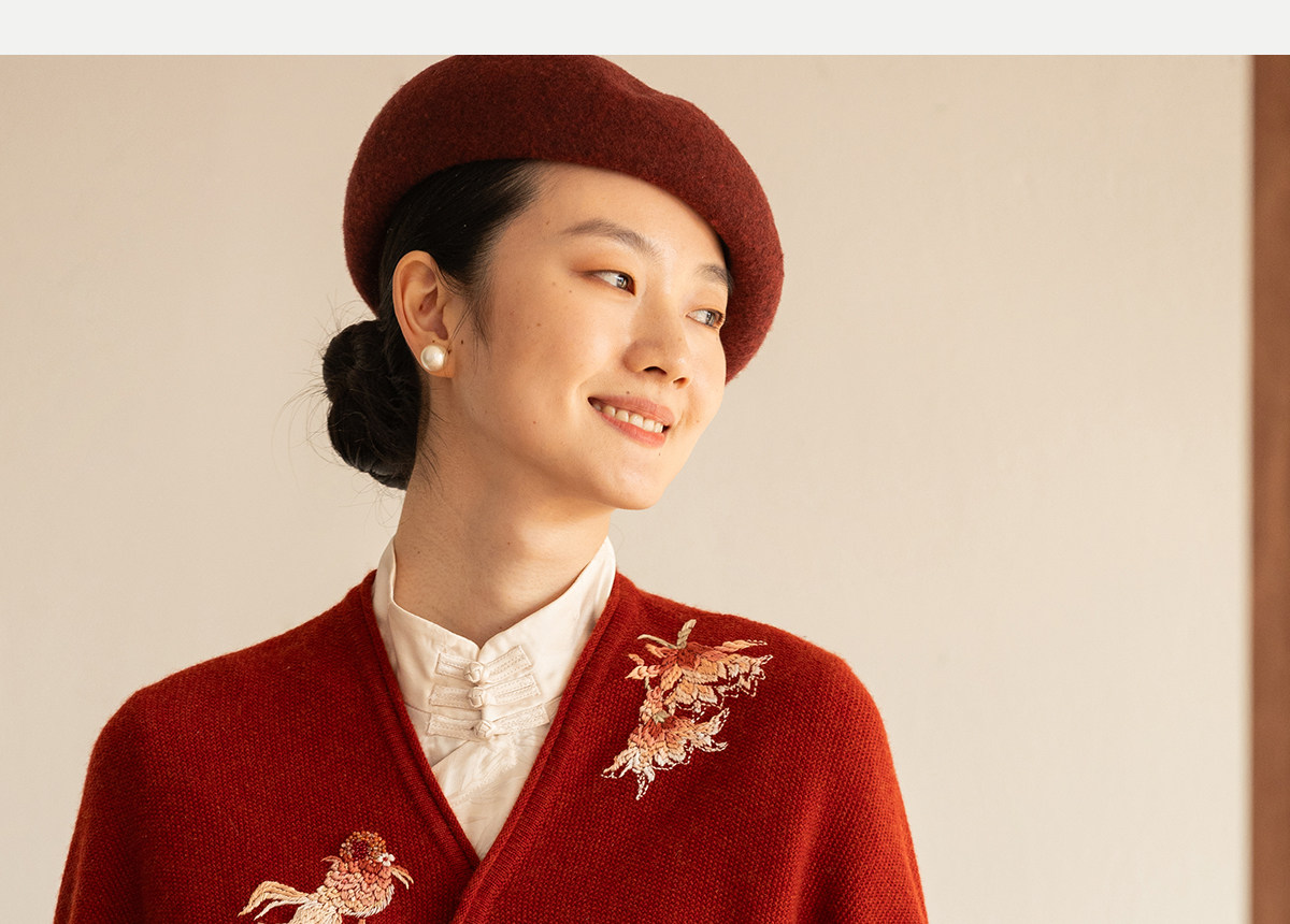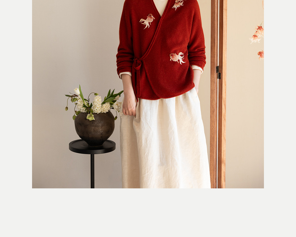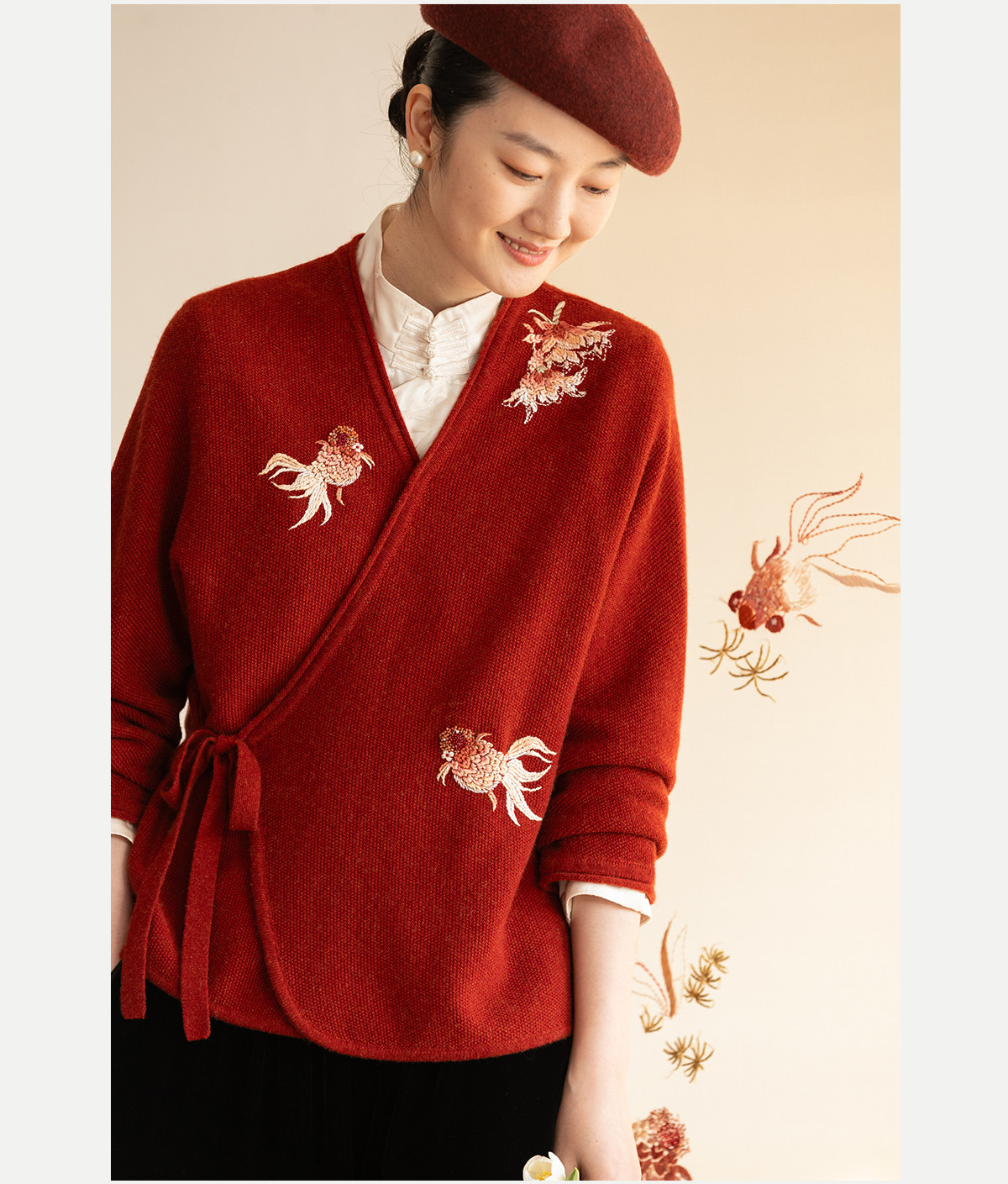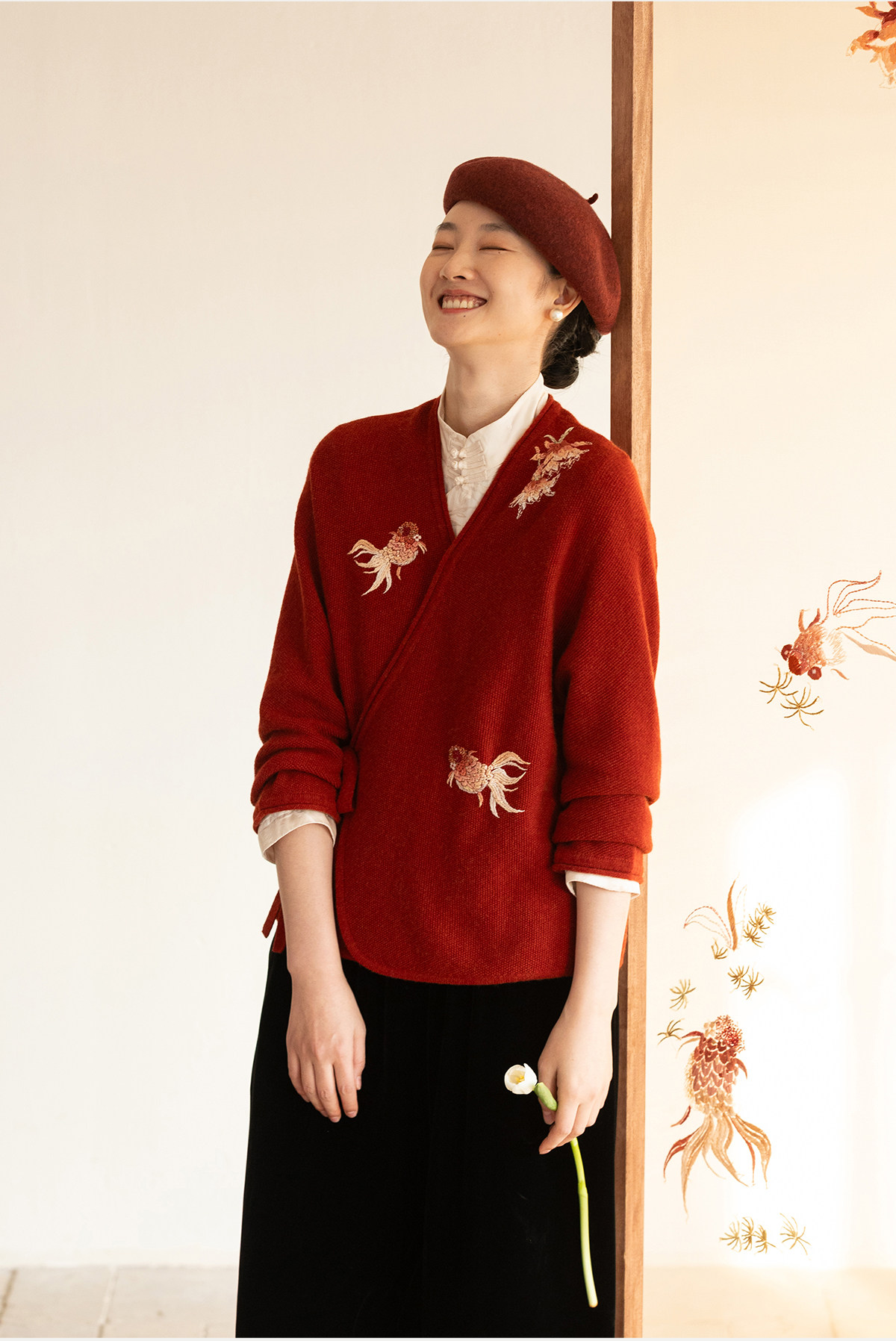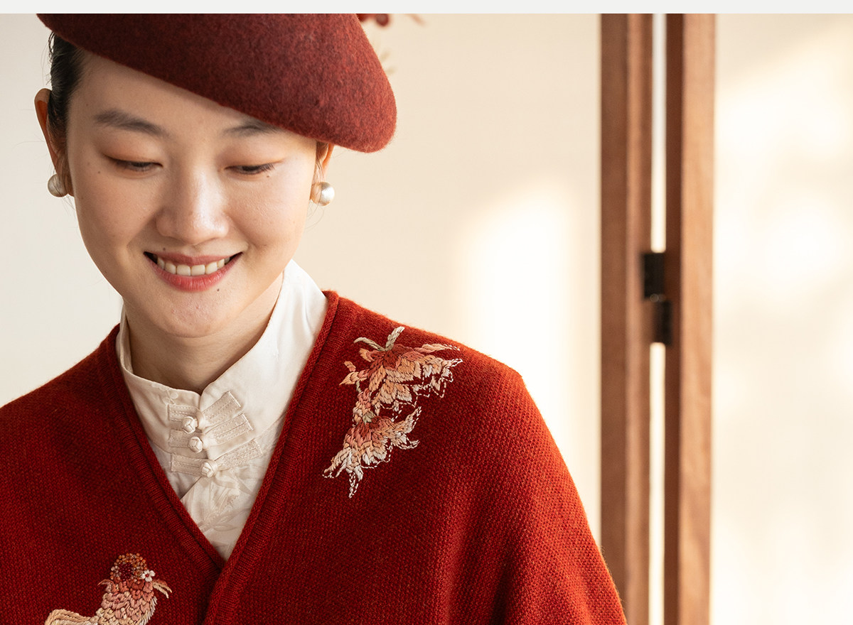 牧衣游原创 羊绒混织重工手绣毛织外套新年红色系带百搭开衫 音逸