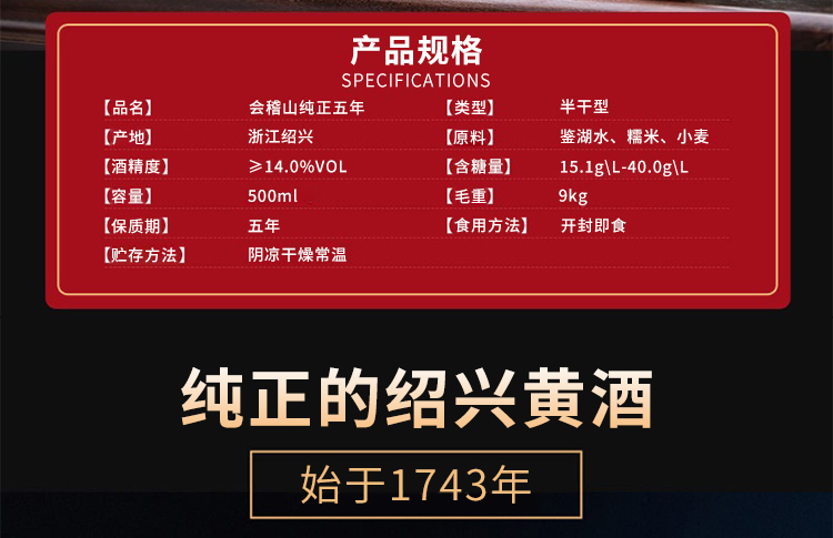 会稽山五年陈纯正绍兴酒黄酒500ml*2瓶