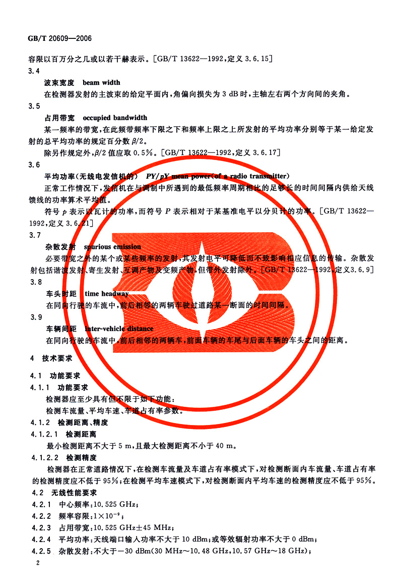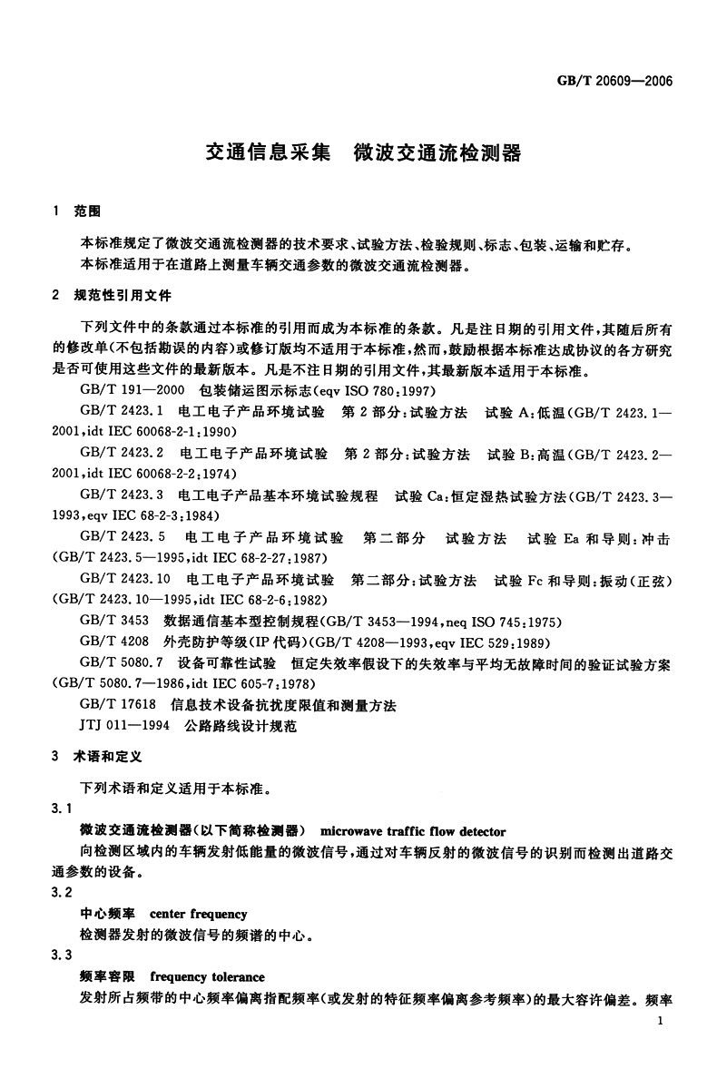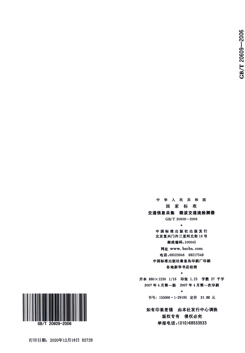 书名:速印不退 GB/T 20609-2006 交通信息采集 微波交通流检测器
