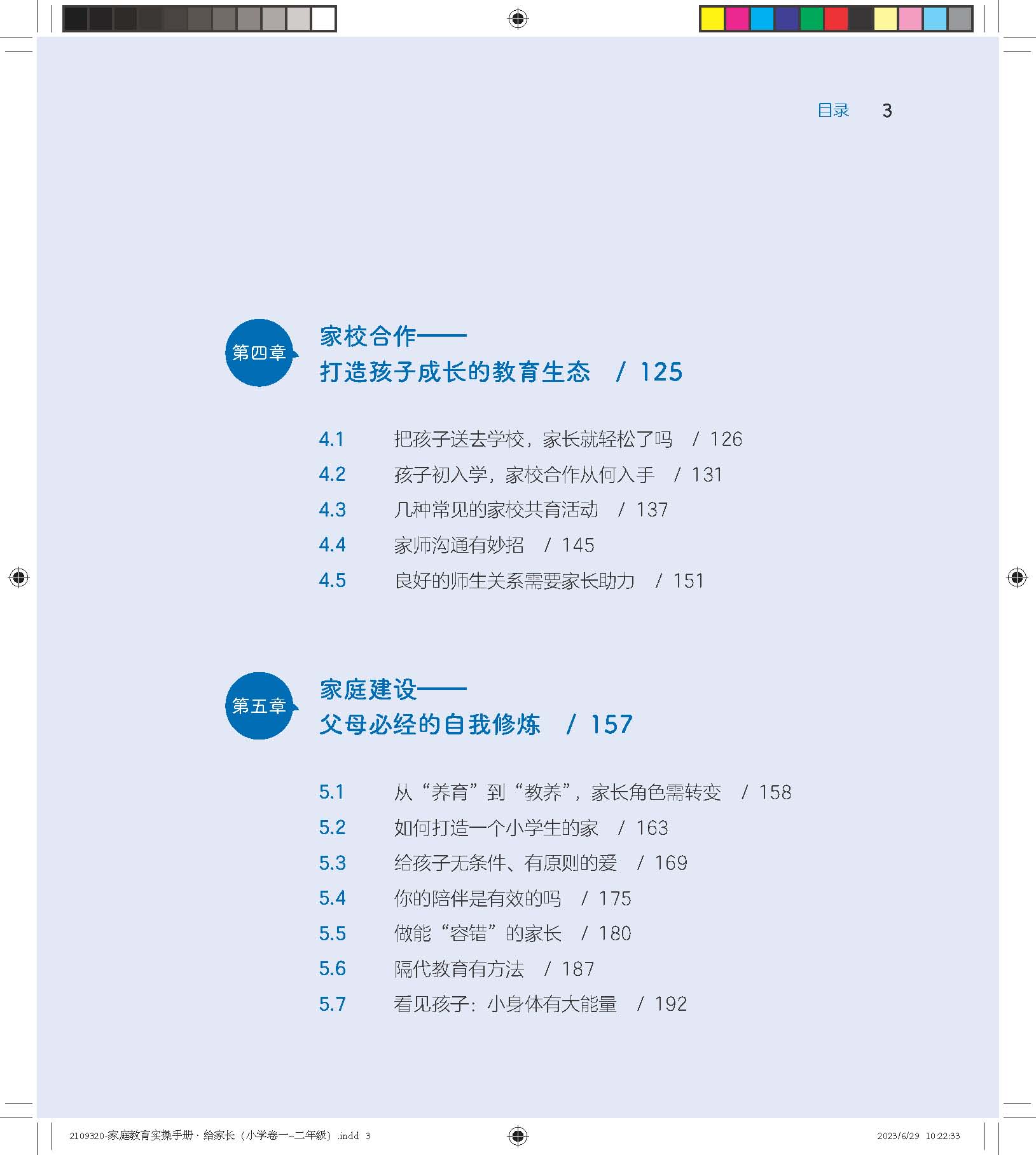 一套为家长精心打造的家长学校教材和家长 自我修炼工具箱;兼具系统性和全面性、发展性和典型性、科学性和 操作性,全面而系统地阐述了从小学至高中各年级家庭教育和家校共育的实施要点,满 足学校开展家校合作、家长学校及家长提升家庭教育能力的多方需求;既统一全套丛书的基本内容体现出孩子从小学至高中的 发展特征,又根据不同阶段孩子的特点找出该阶段的典型问题,满足学校开展家校合作 与家长学校等多方需求。
