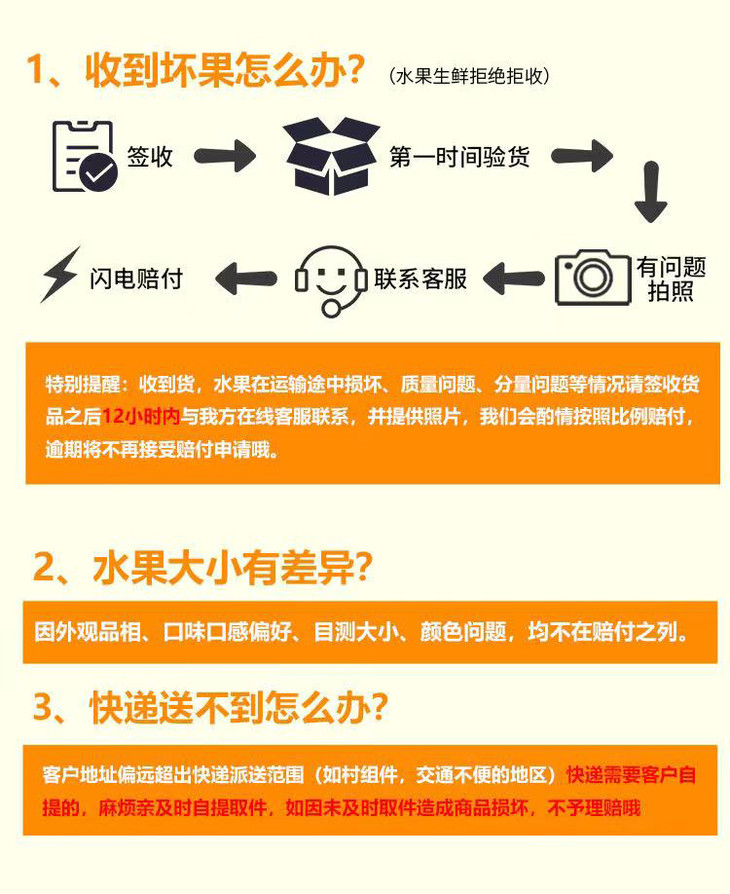 3、到货请第一时间检查,若收到产品有质量问题,请尽快对产品拍照+快递面单照片于24小时内联系售后处理(超过时效或无图不售后)