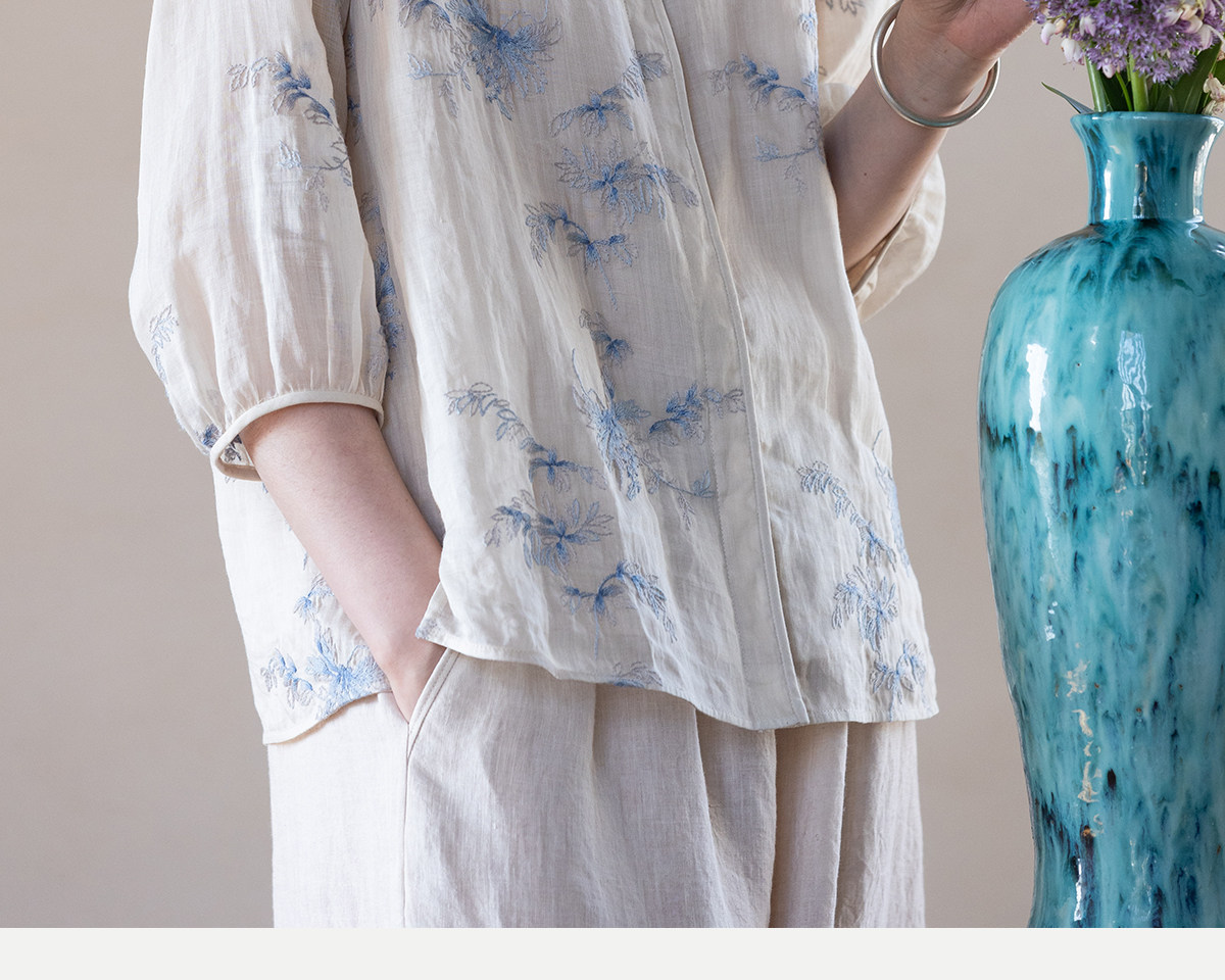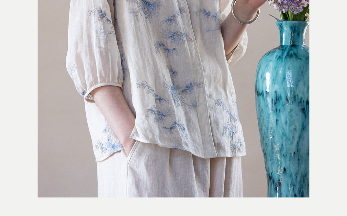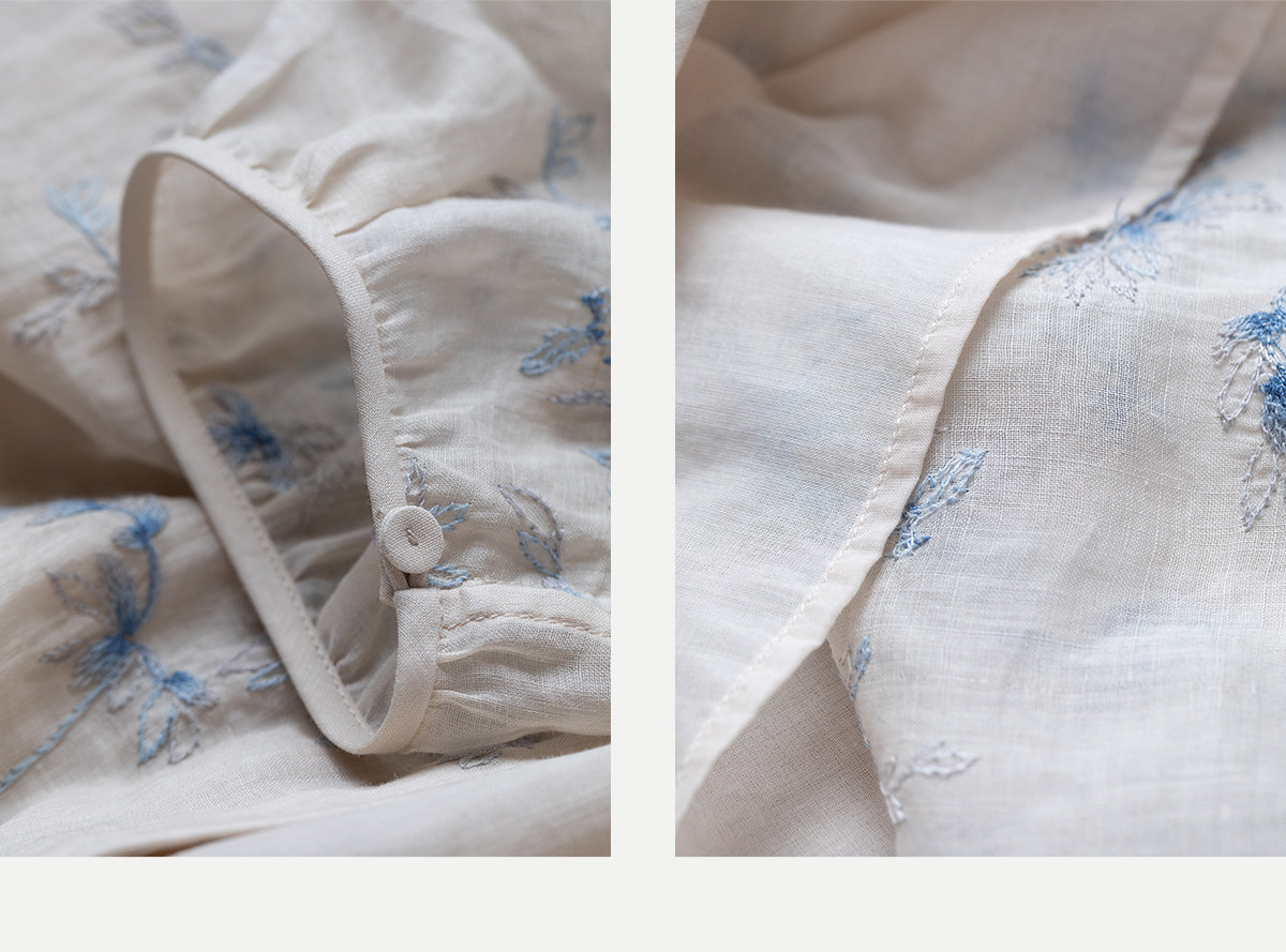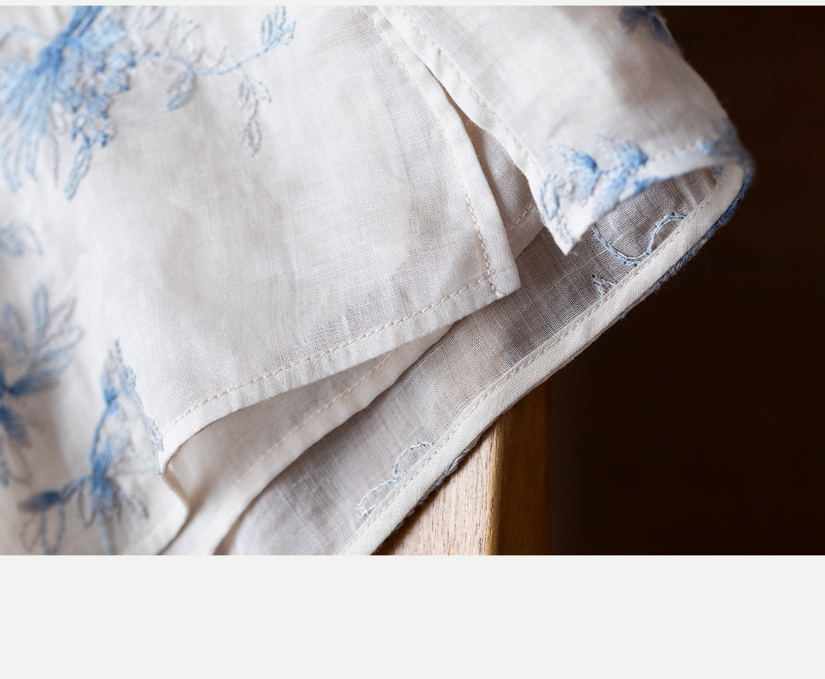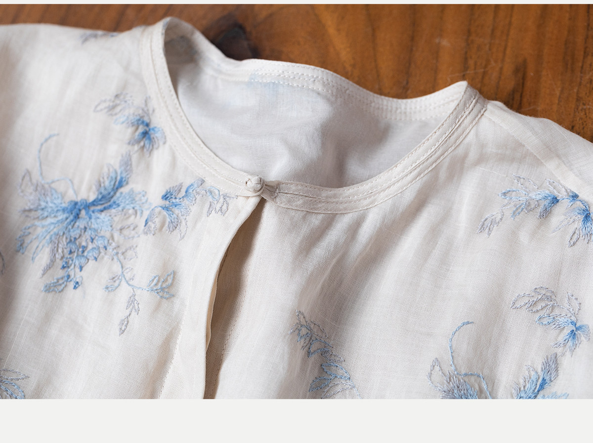 牧衣游原创 匹绣苎麻衬衫女新款轻薄圆领七分袖文艺宽松衬衣 花悦