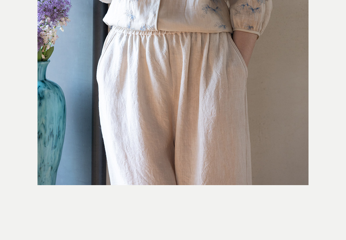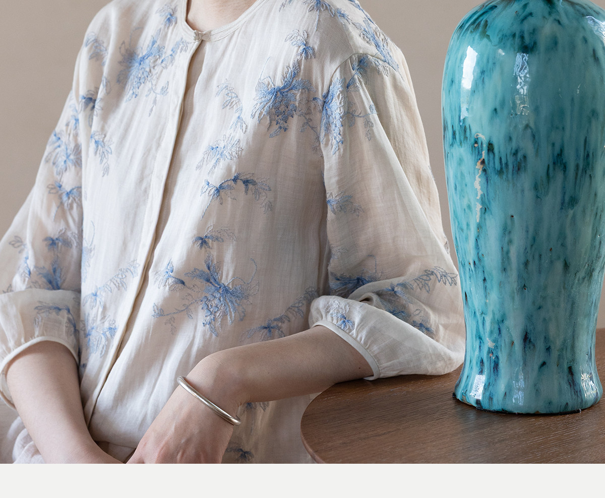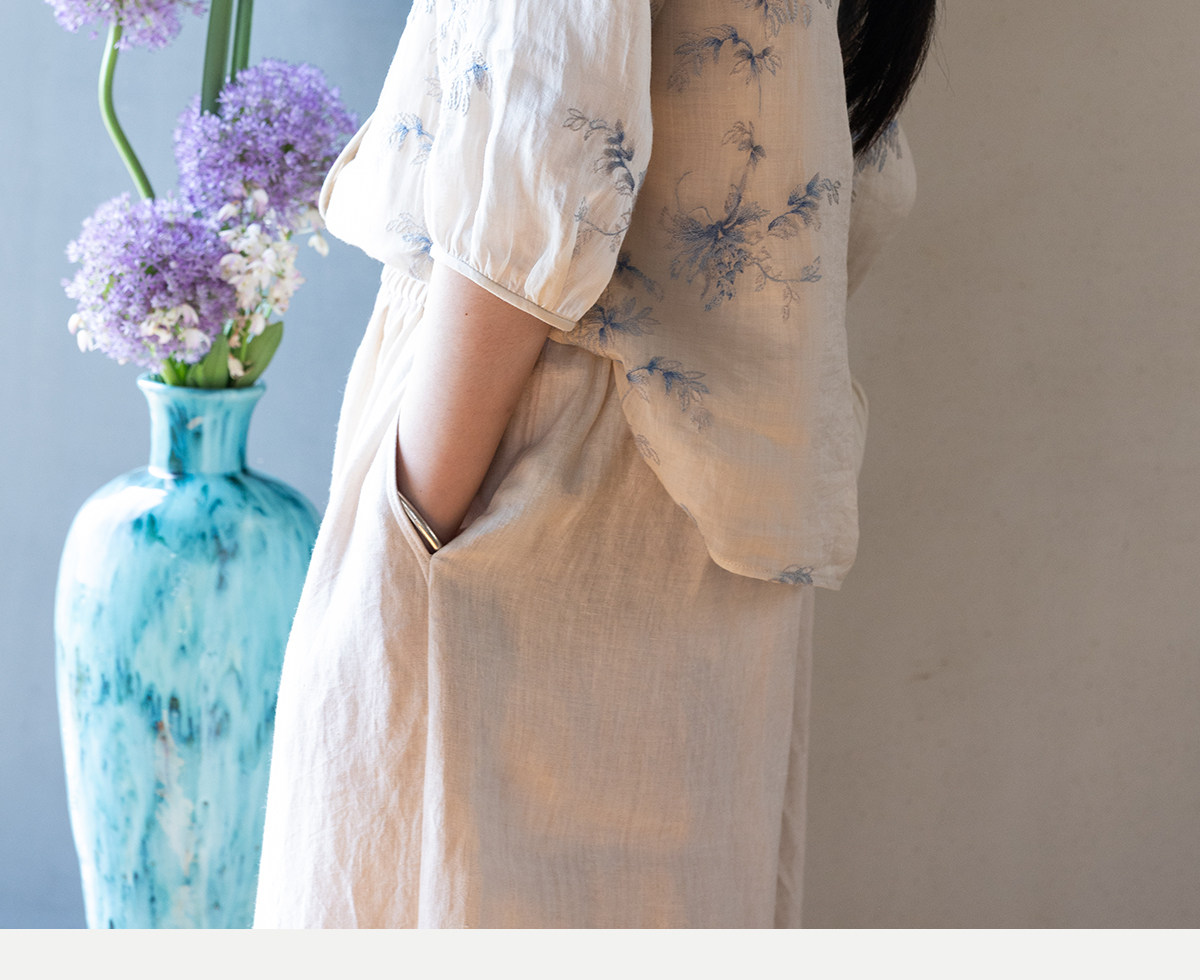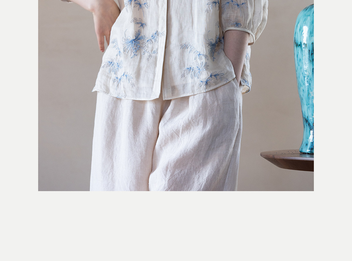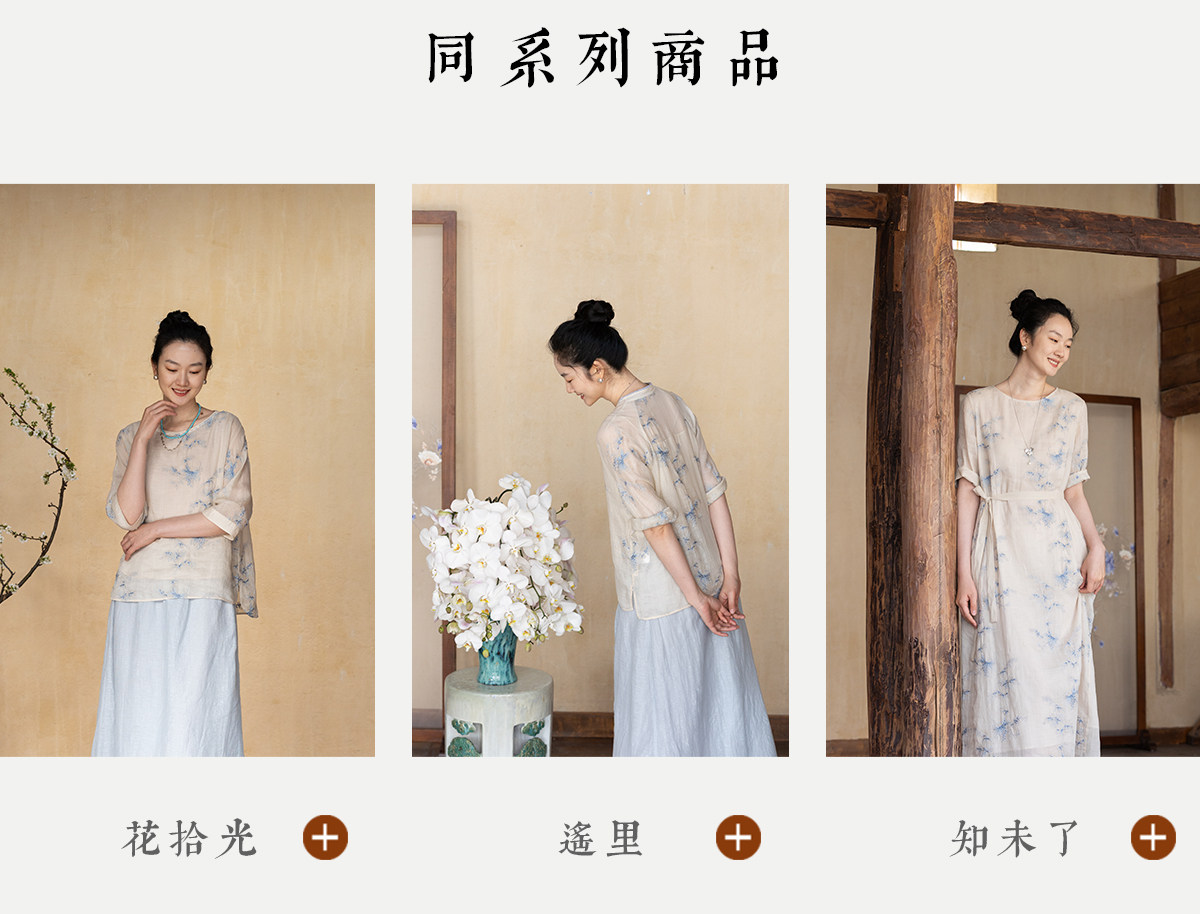 牧衣游原创 匹绣苎麻衬衫女新款轻薄圆领七分袖文艺宽松衬衣 花悦