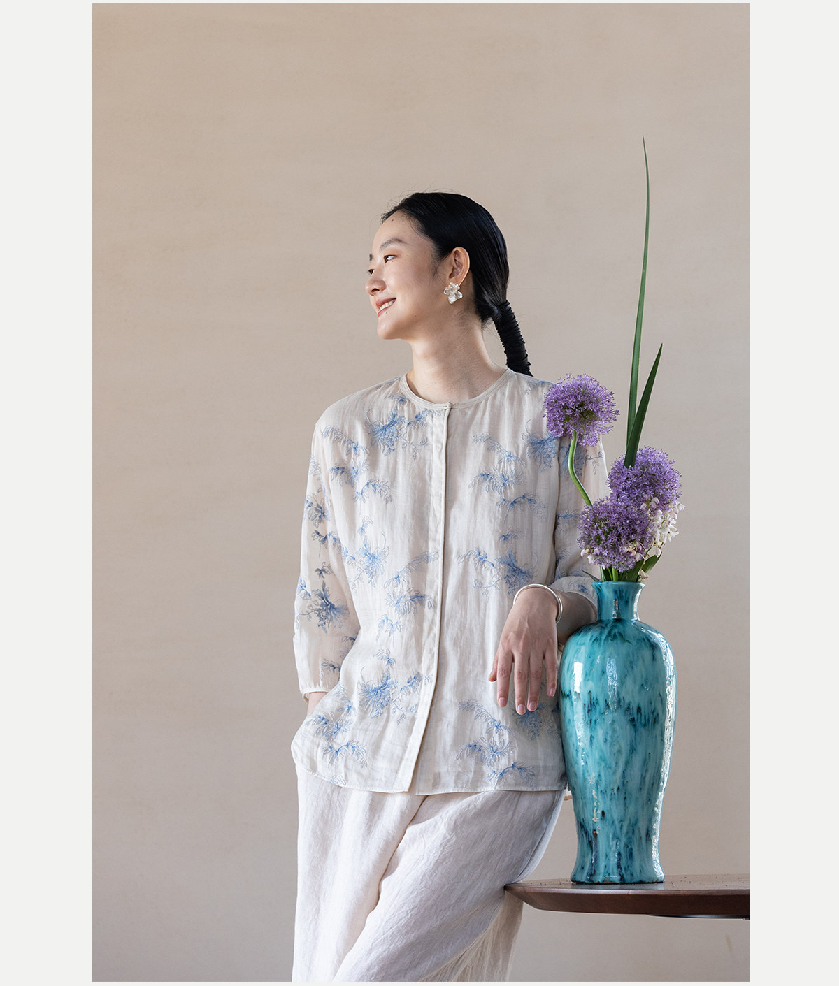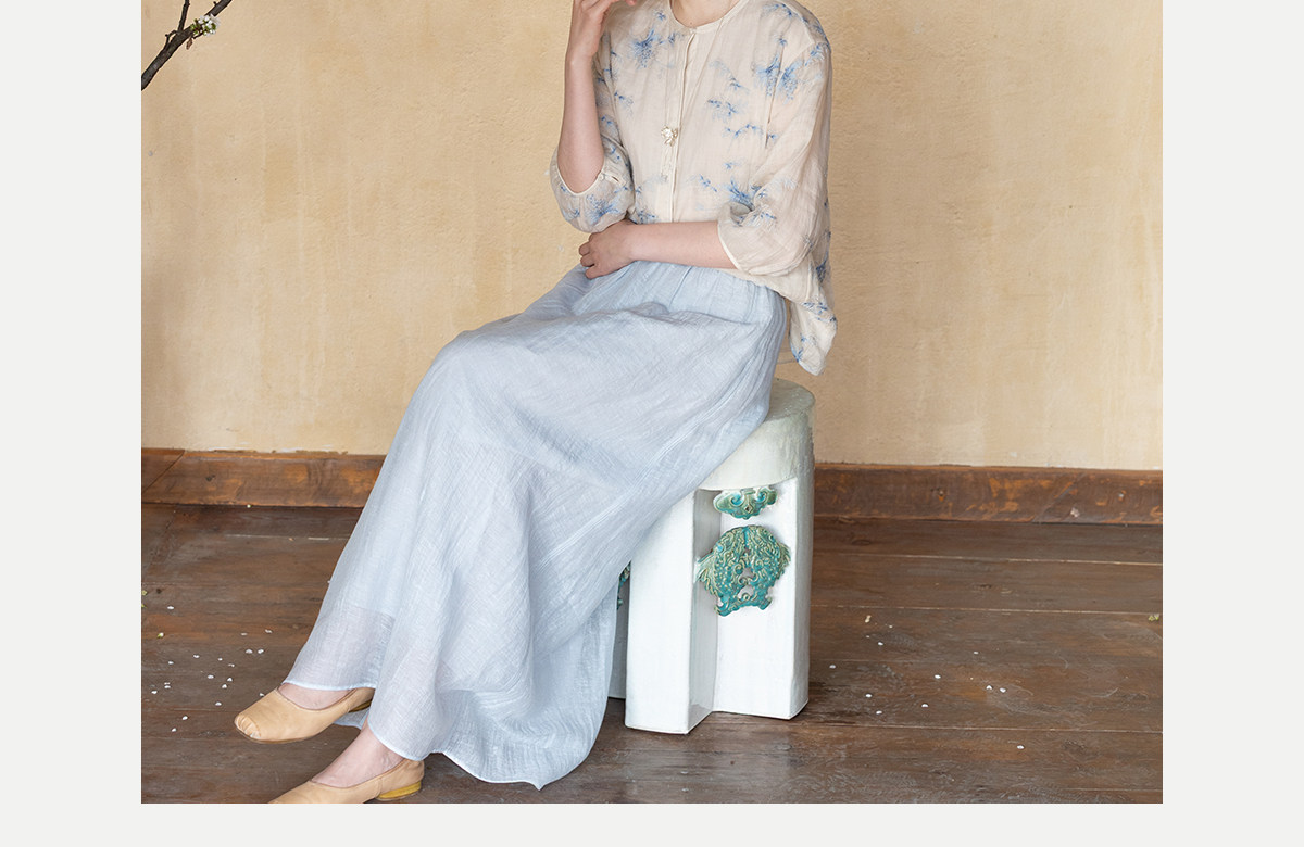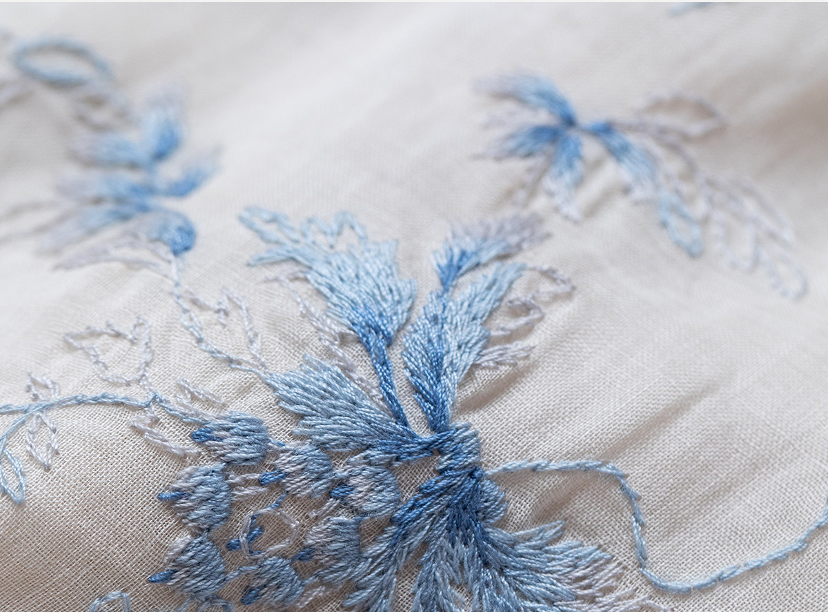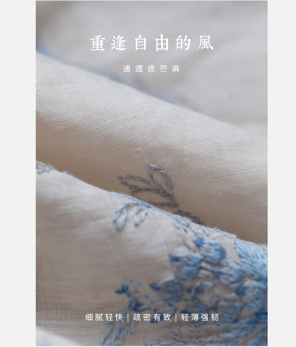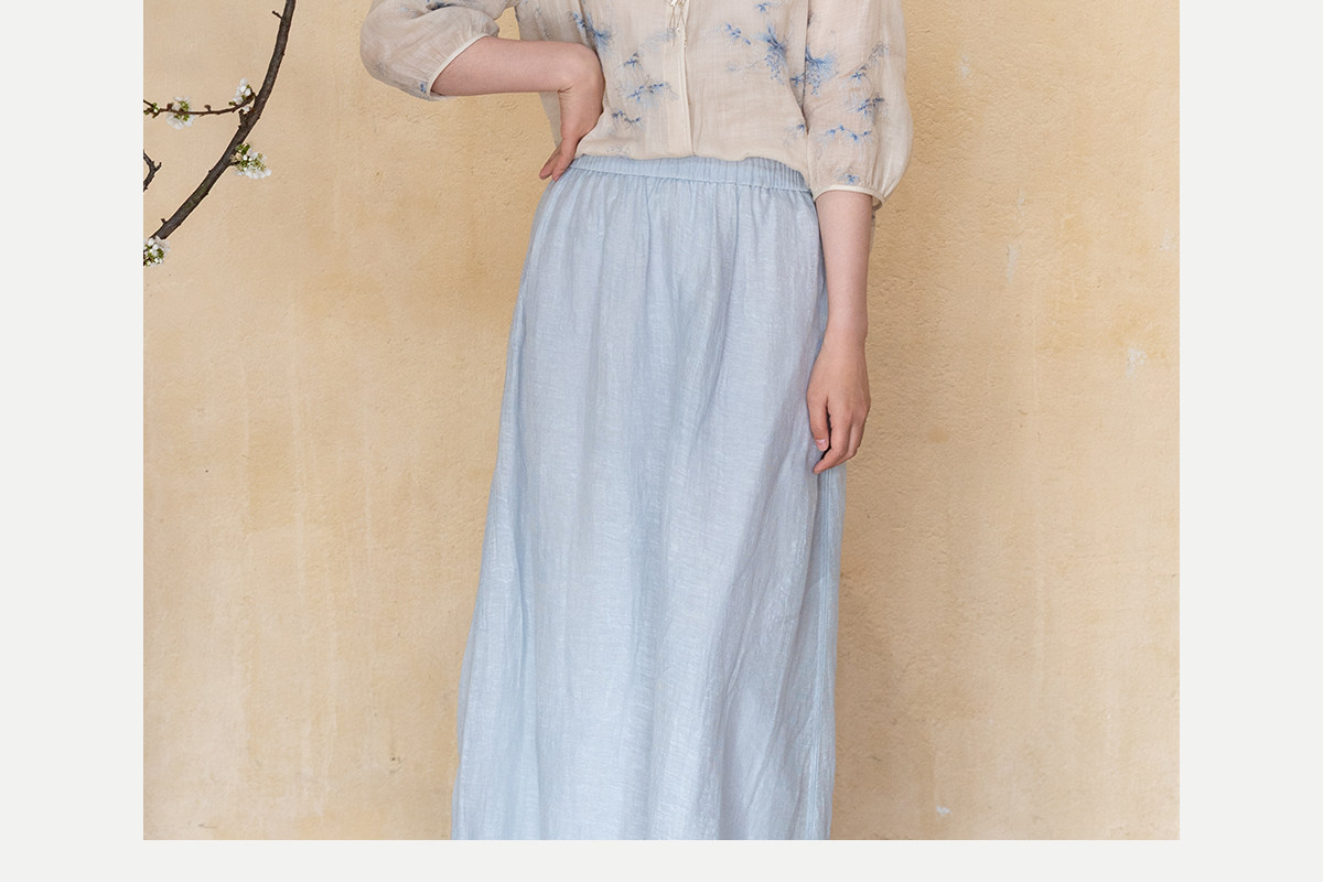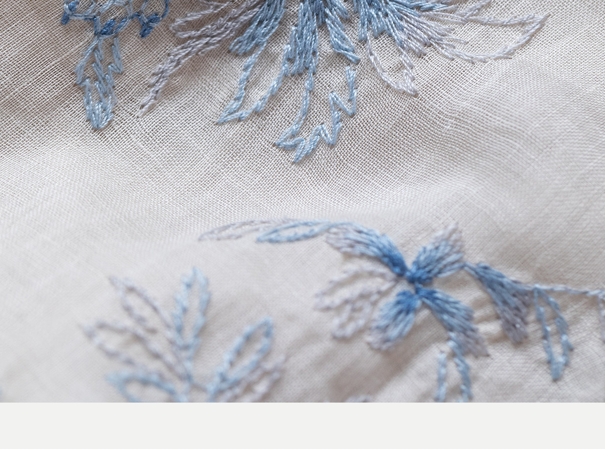 牧衣游原创 匹绣苎麻衬衫女新款轻薄圆领七分袖文艺宽松衬衣 花悦