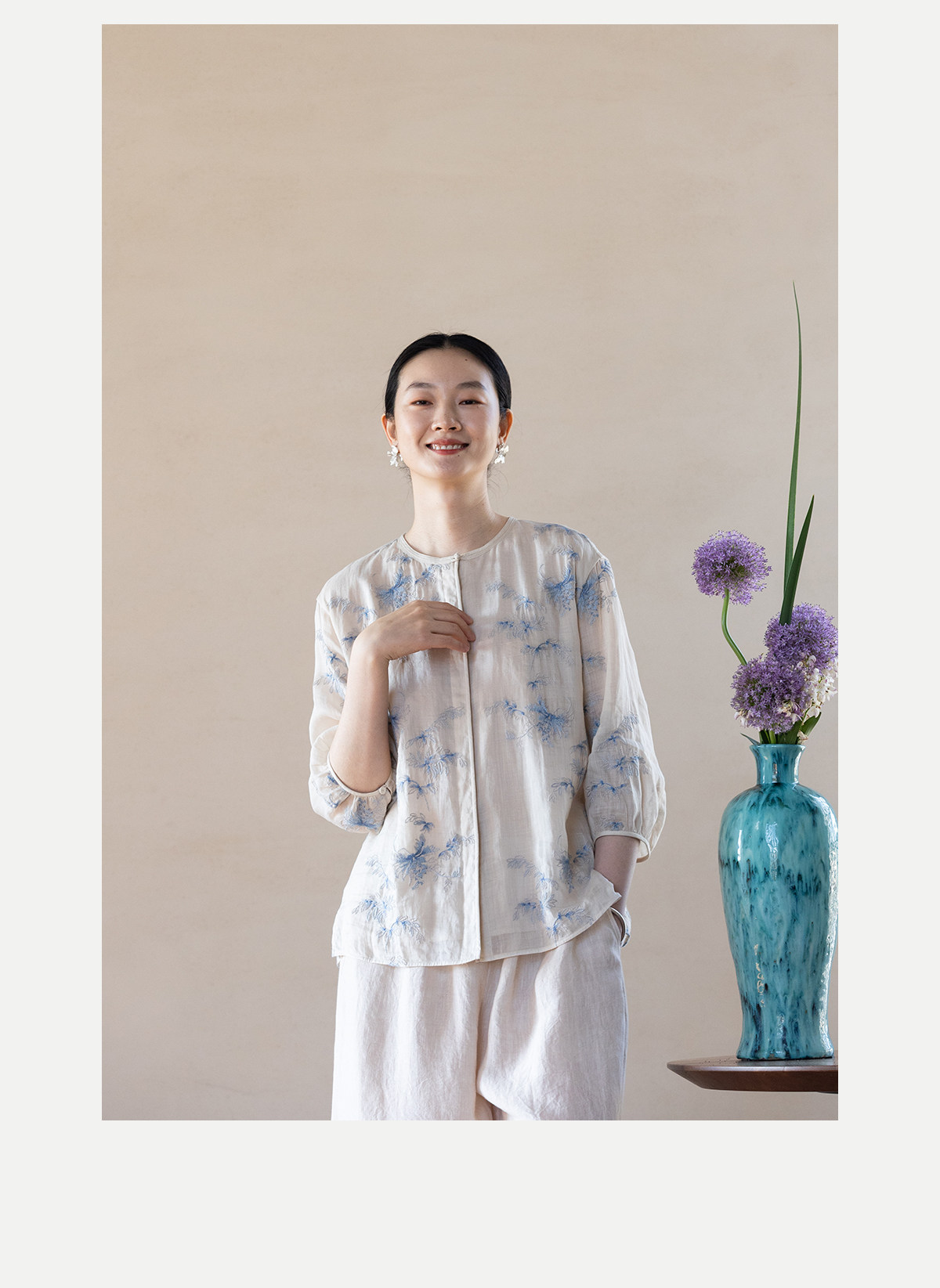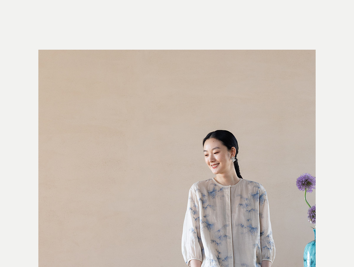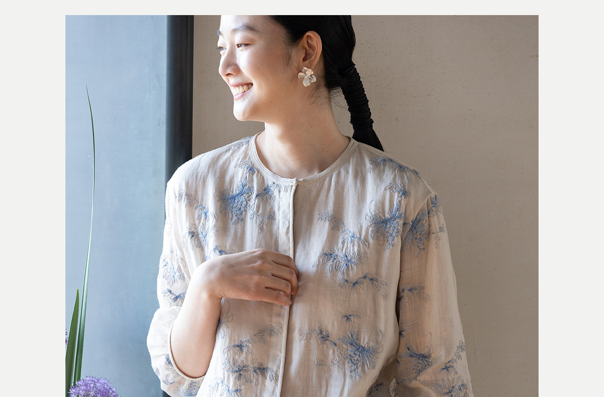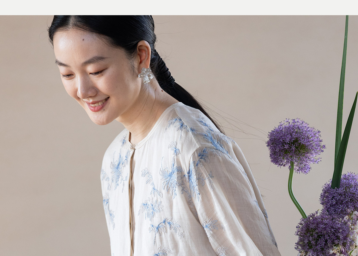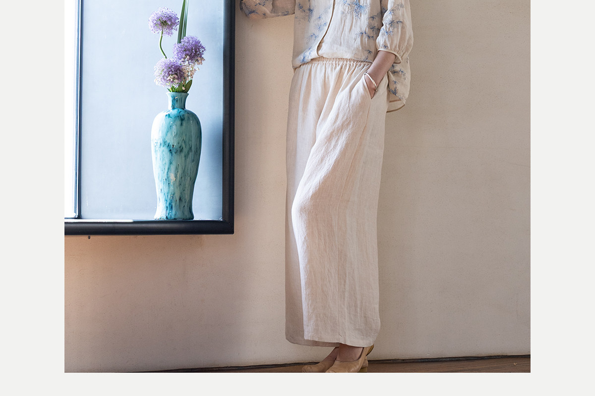 牧衣游原创 匹绣苎麻衬衫女新款轻薄圆领七分袖文艺宽松衬衣 花悦