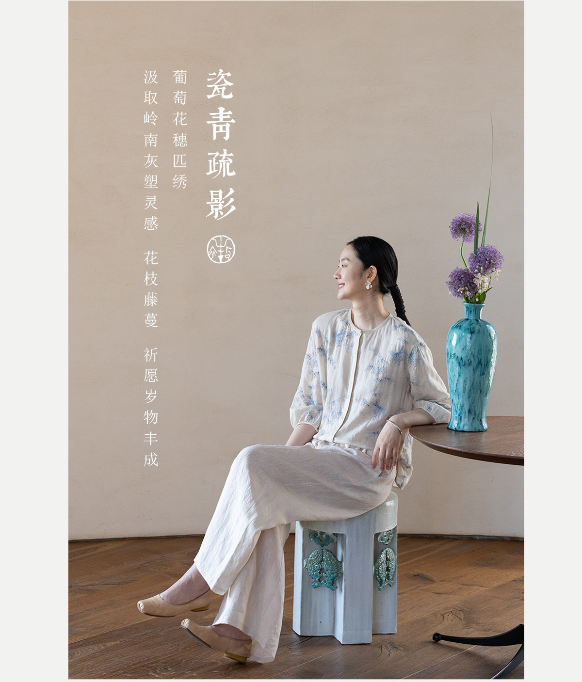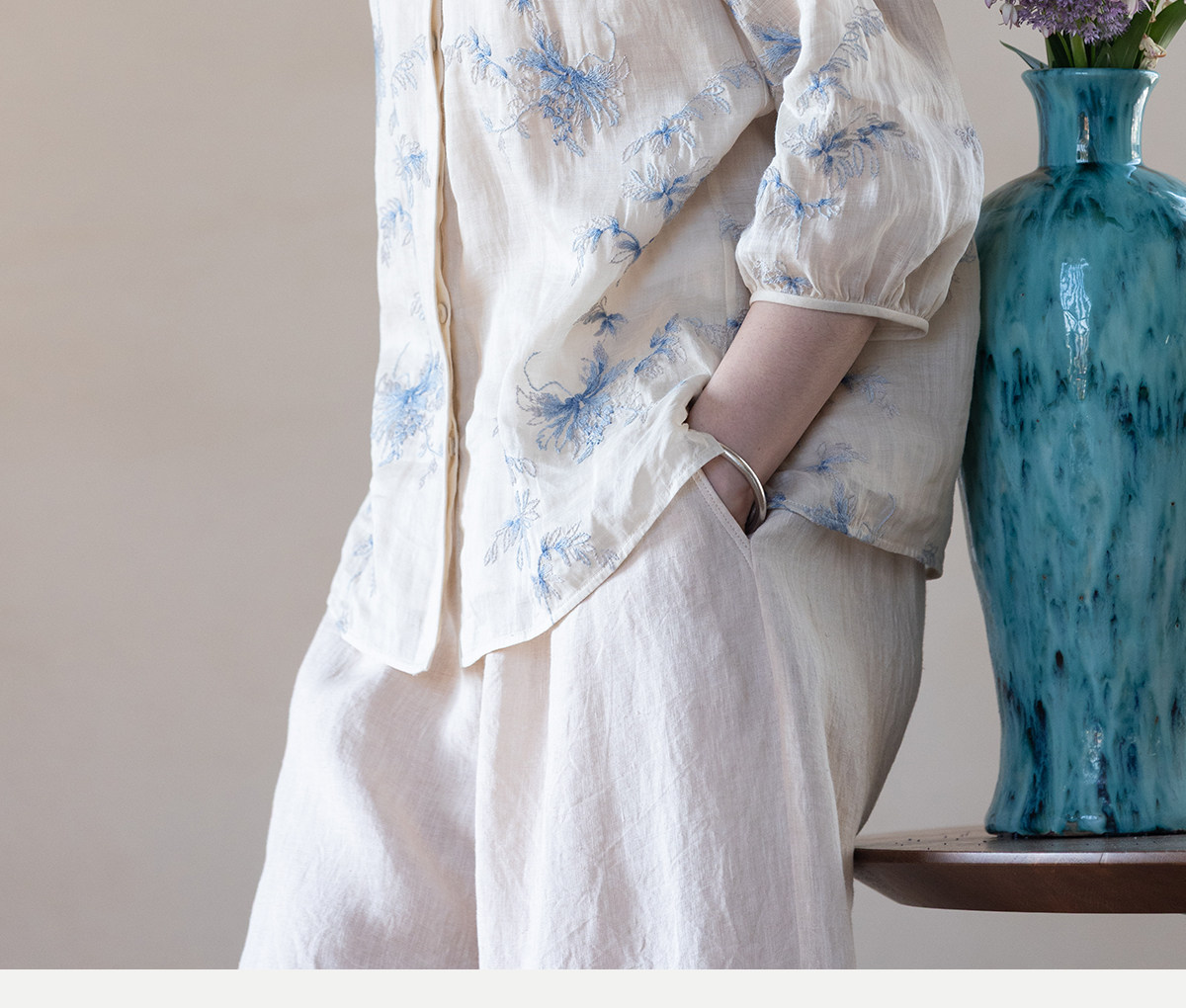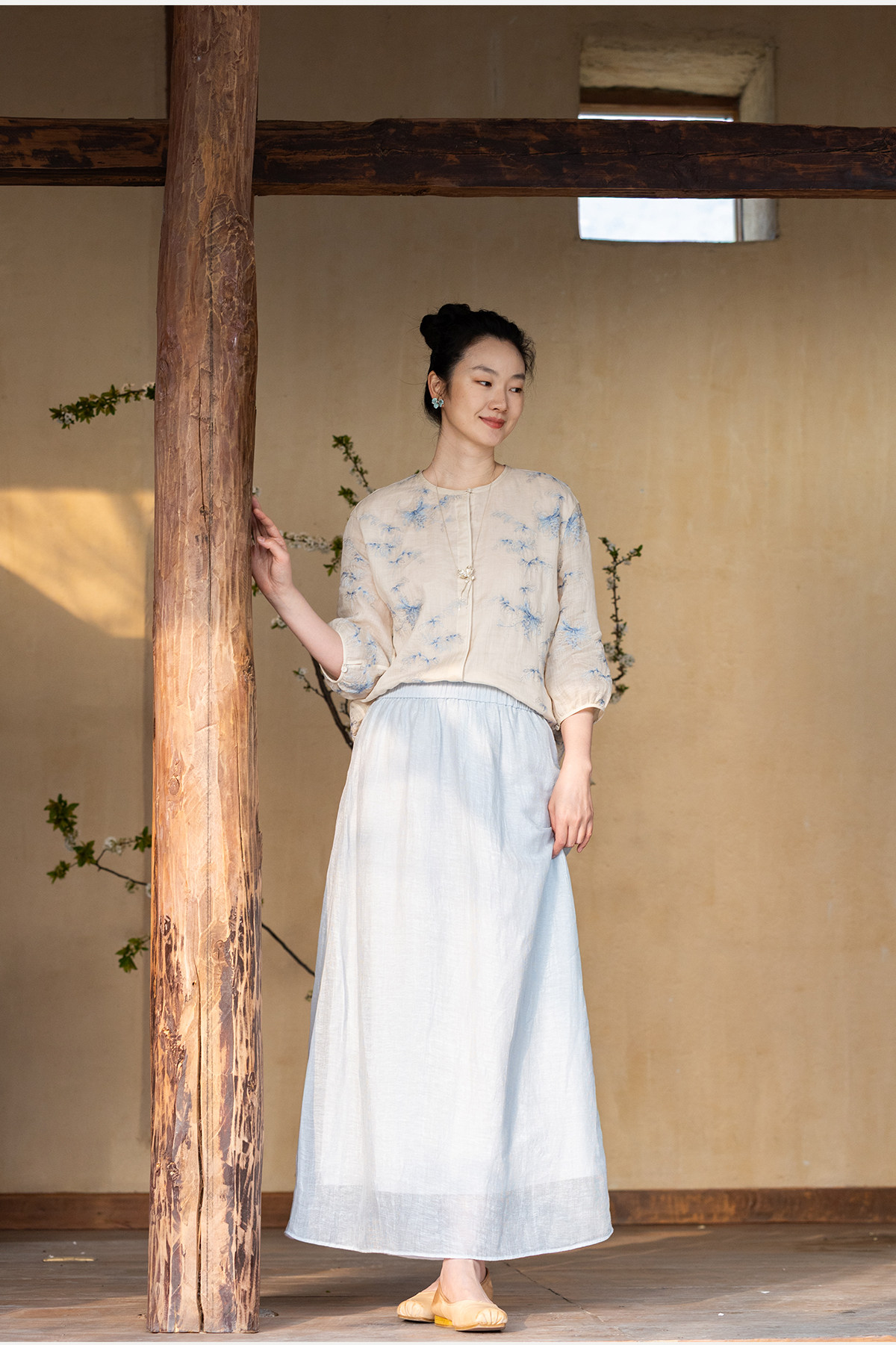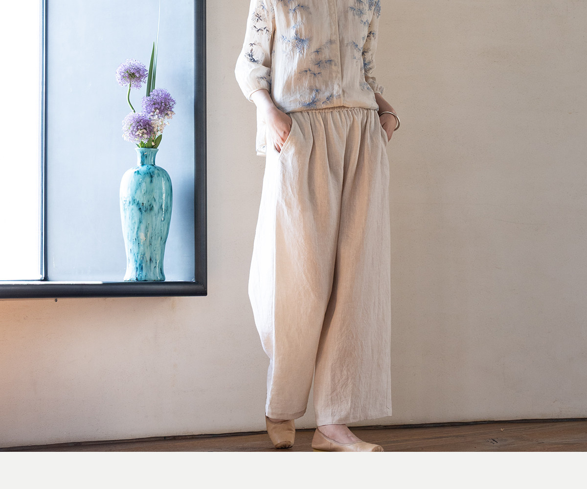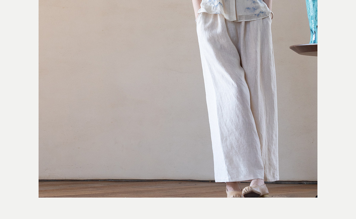 牧衣游原创 匹绣苎麻衬衫女新款轻薄圆领七分袖文艺宽松衬衣 花悦