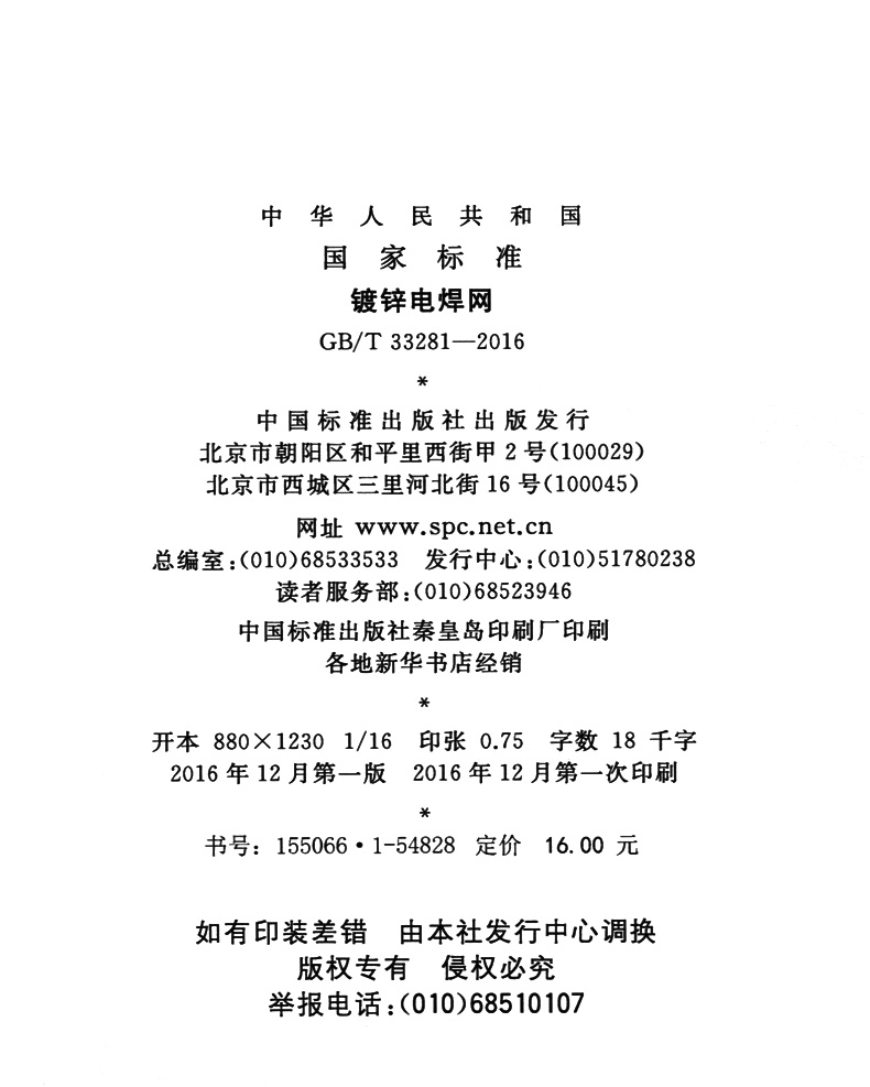 书名:速印不退 GB/T 33281-2016镀锌电焊网