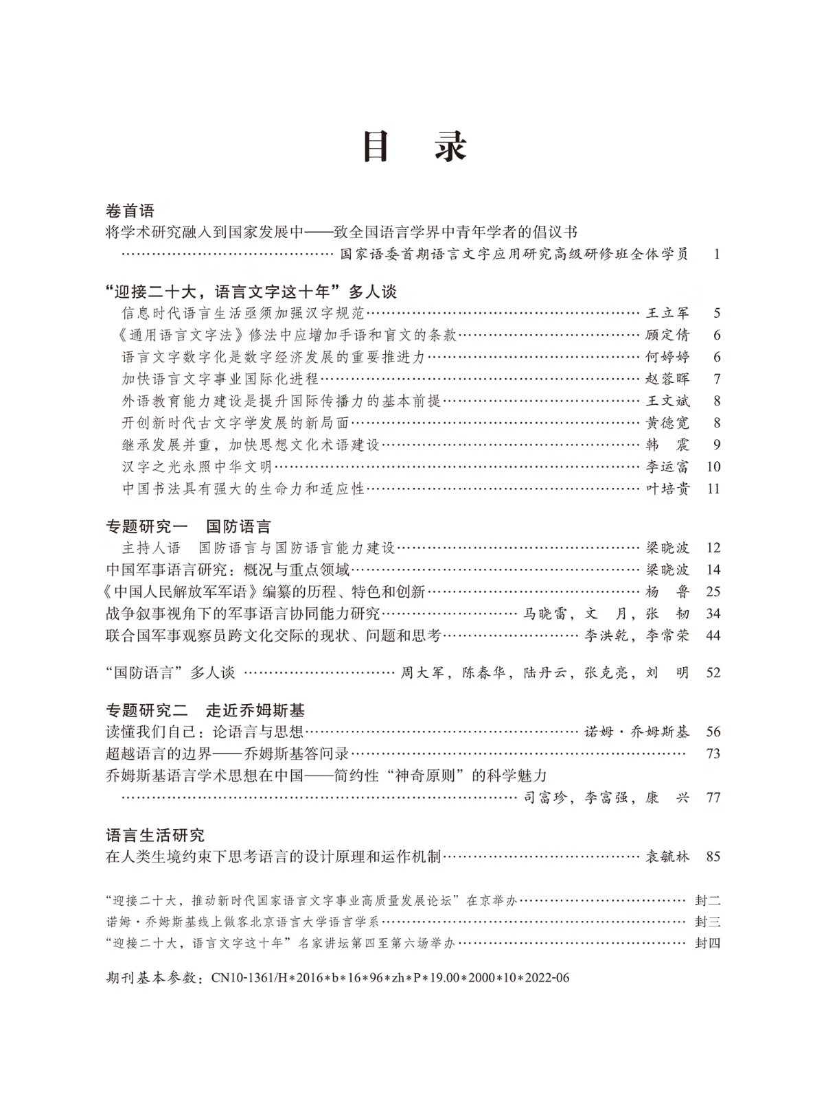 本期特别设立“迎接二十大,语言文字这十年”多人谈第二期,邀请名家就语言文字规范化标准化信息化、语言文字国际交流合作、中华优秀语言文化弘扬传承等方面进行笔谈。本期设有两个重磅专题:专题一“国防语言”由国防科技大学梁晓波教授组稿,集结军事科学院、国防科技大学、海军航空大学、信息工程大学等军事院校知名专家学者,就当前国防语言研究关注的主要问题展开论述,具体涉及军事语言研究的概况及重点领域,我军《军语》编纂的发展脉络、特点与创新,战争叙事视角下军事语言协同能力及其作用,联合国军事观察员跨文化交际的现状及存在问题等主题,并从国防语言能力总体建设、队伍建设,翻译能力指标体系建设、语言智能建设及语言教学等多个方面进行笔谈,力图把握话题的时代性和引领性。专题二“走进乔姆斯基”,以北京语言大学“读懂乔姆斯基”线上系列学术活动为背景,集结三篇文章。乔姆斯基教授演讲稿《读懂我们自己:论语言与思想》中英文版已授权我刊首发;《超越语言的边界——乔姆斯基答问录》体现中外学者的交流互动,也是乔姆斯基学术生涯珍贵的资料;司富珍等《乔姆斯基学术思想在中国》则是对乔氏思想及其在中国广泛而深远影响的综述。“语言生活研究”栏目刊发袁毓林教授《在人类生境约束下思考语言的设计原理和运作机制》,极富语言哲学的思辨性。